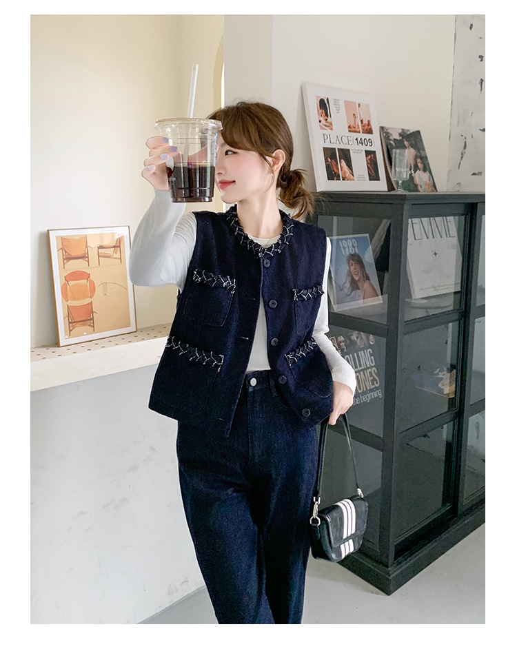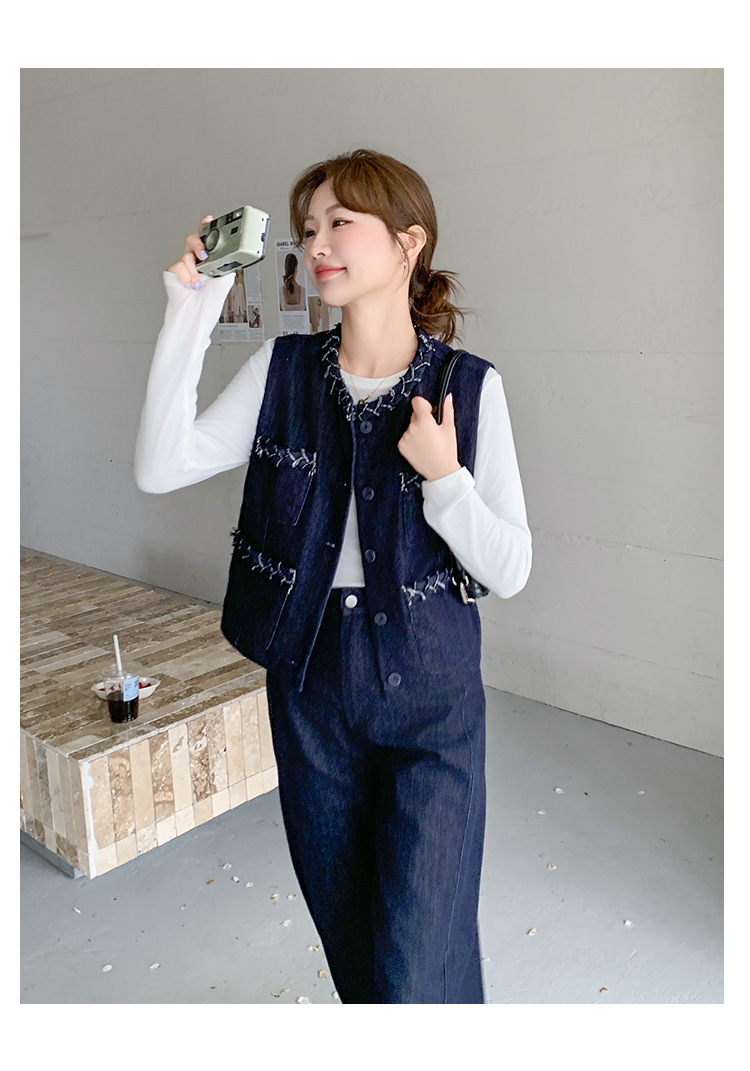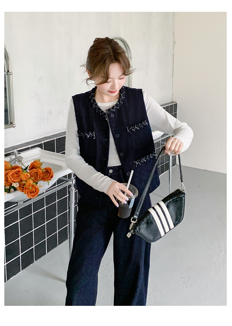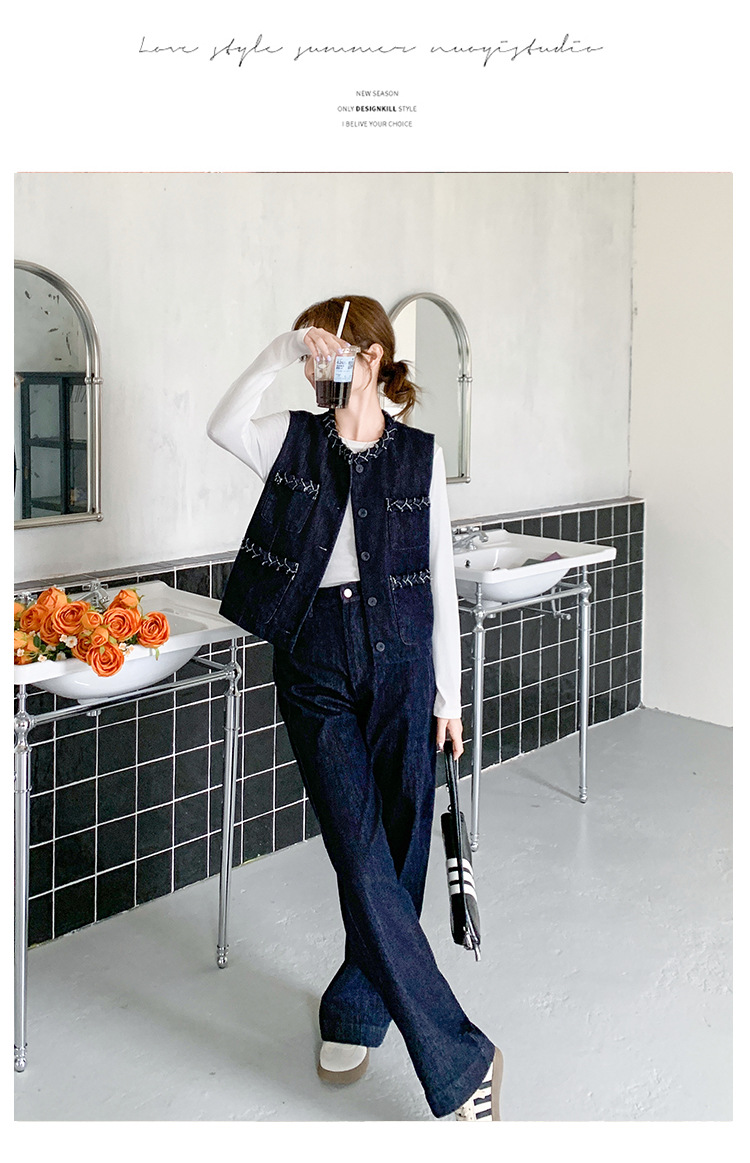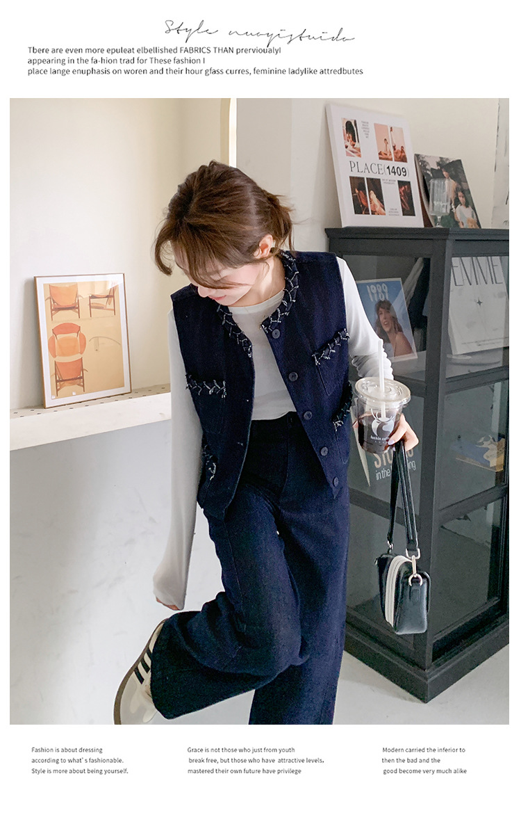 [멩메이] 25 스프링 다크 블루 스티칭 짧은 양복 조끼 느슨한 스트레이트 바지 세트 디자인 3 피스 세트스토어 가기