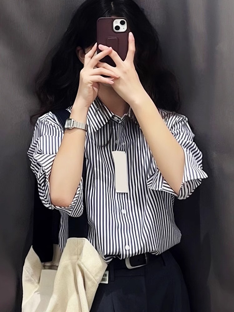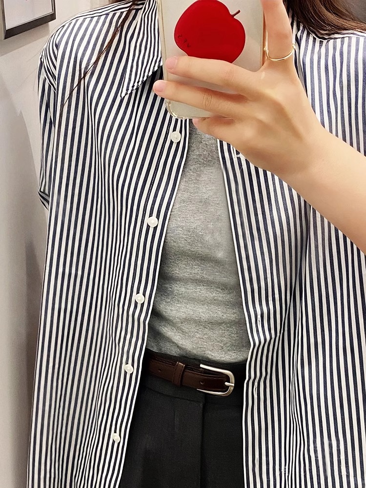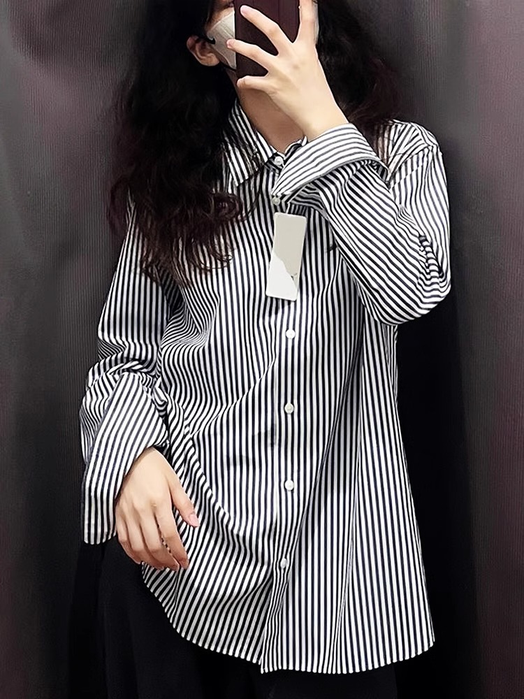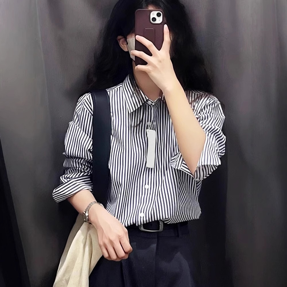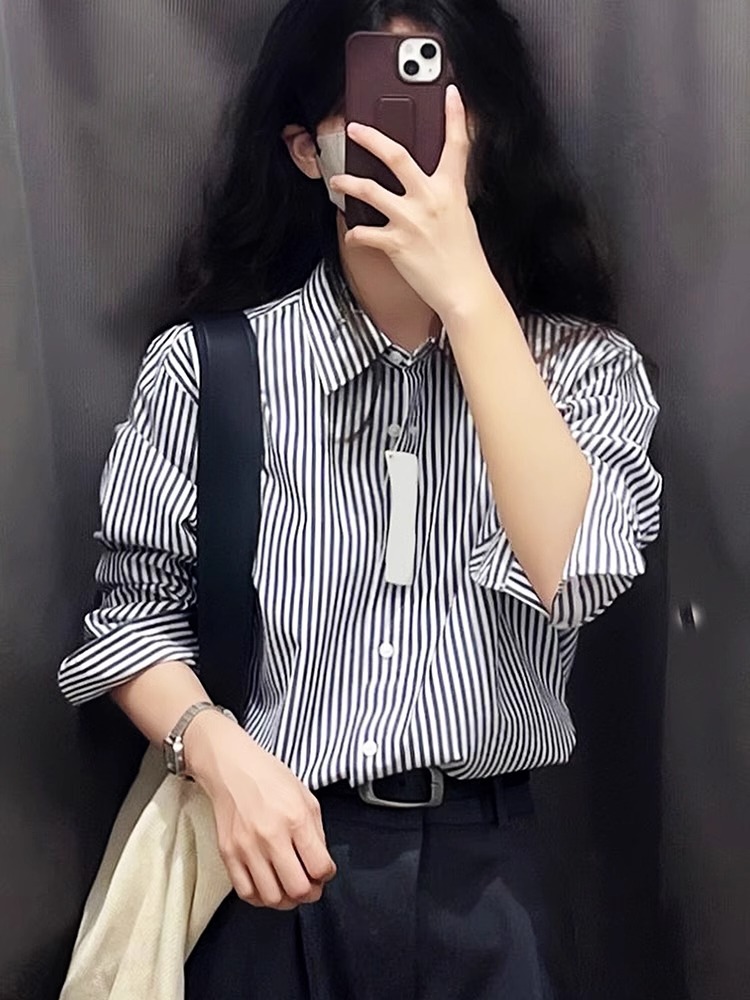 70% 면 27% 브로케이드 3% 스판덱스 블랙 스트라이프 블라우스 라이트 럭셔리 일본 스타일 디자인 캐주얼 탑 트렌디스토어 가기