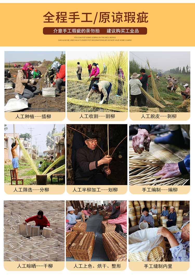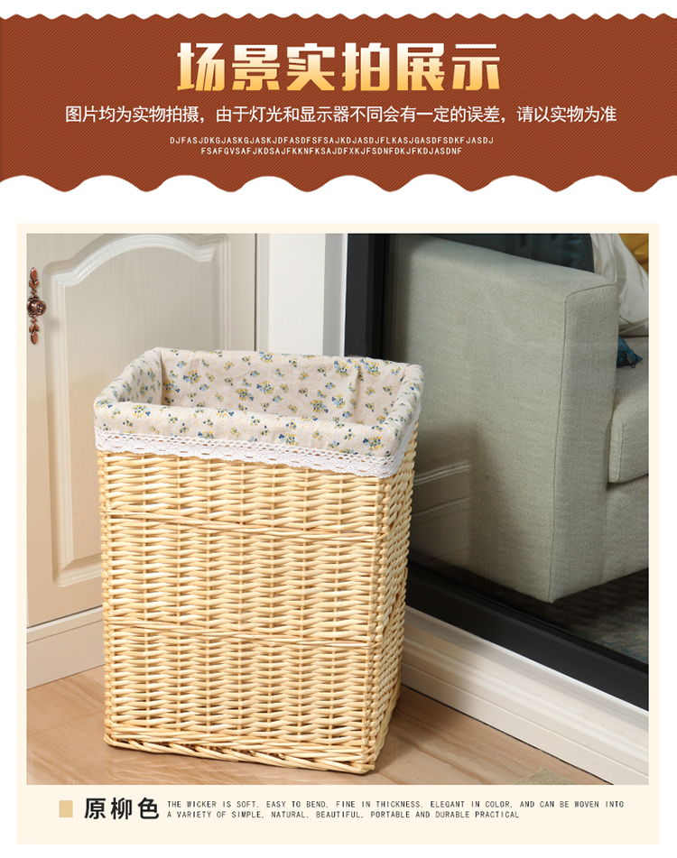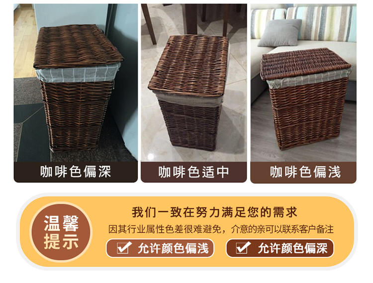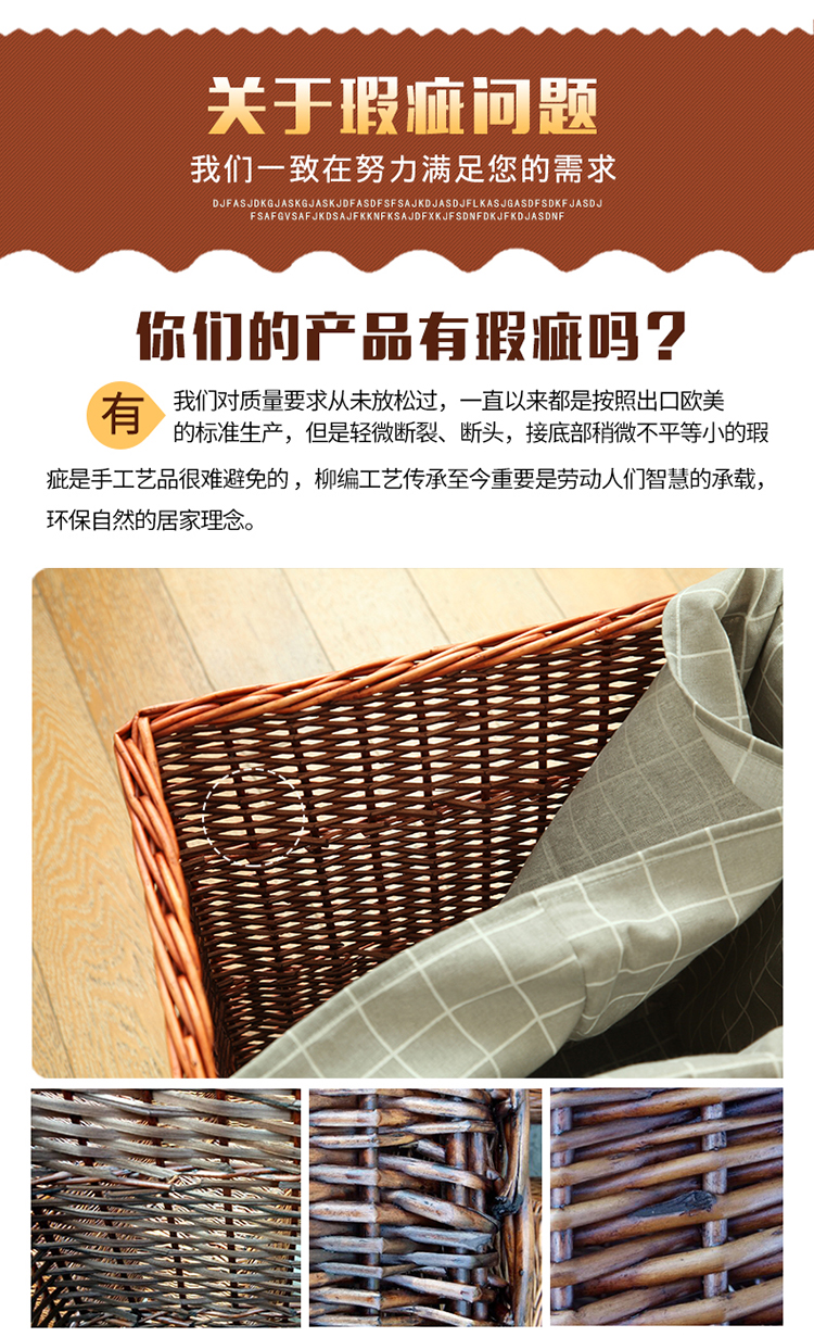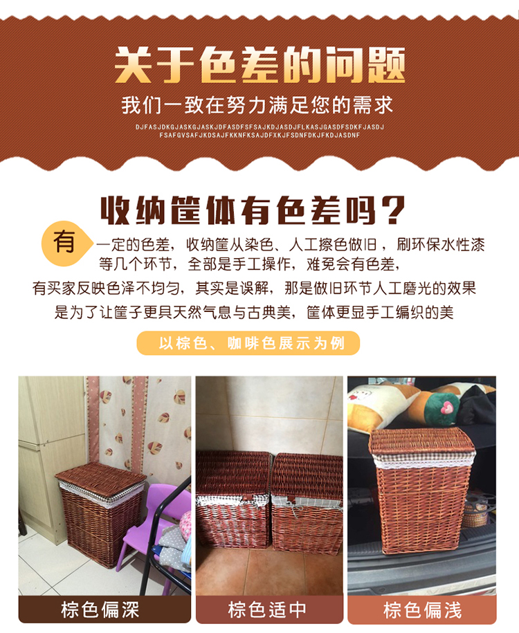 筐子是染色的,沾水会掉色,湿巾擦也掉色,晒干后就不掉色了,筐子不能用刷子沾水刷洗,掉色很严重,筐子是植物材质杞柳劈柳纯手工制作的,断的裂的都是无法避免的呢,整体效果都是可以的,细节确实做不到塑料制品那么完美,筐子刷的是水性漆,环保的,没啥味道,但是外包装用的新纸箱会有点味道,收到货筐子上会捂上点,一般放在外面通风处晒几天就好了