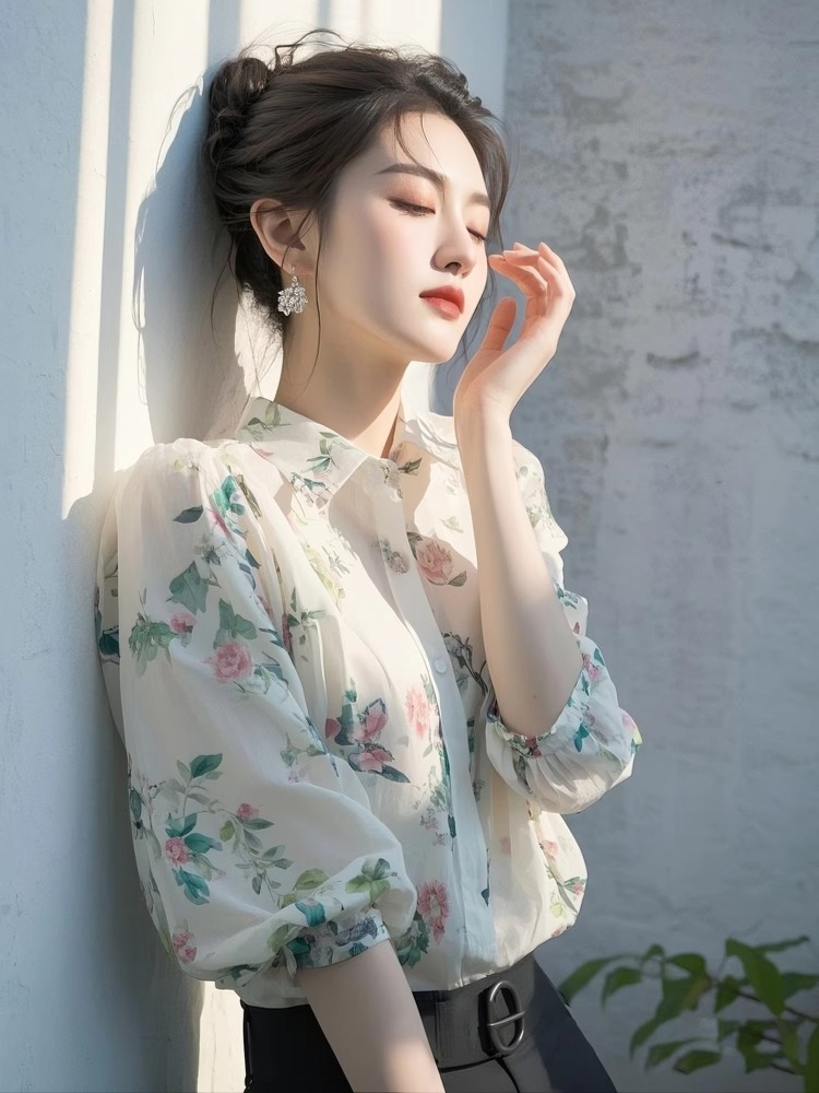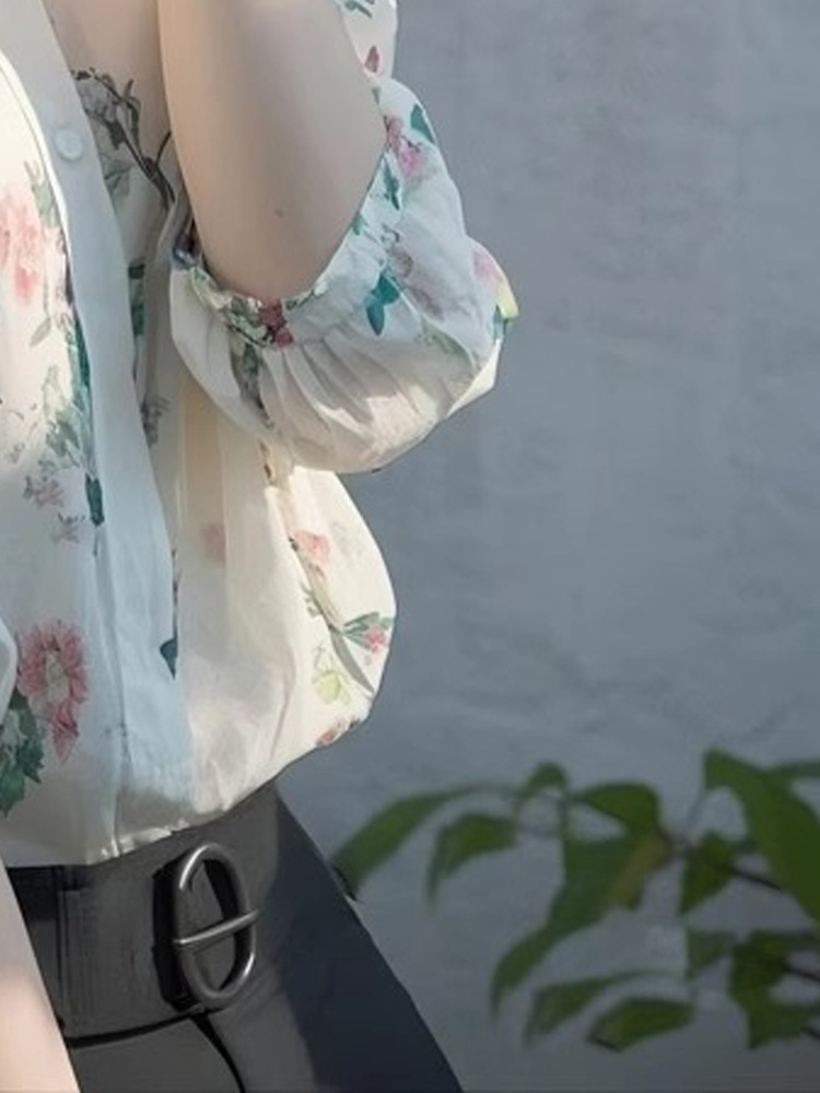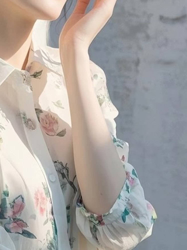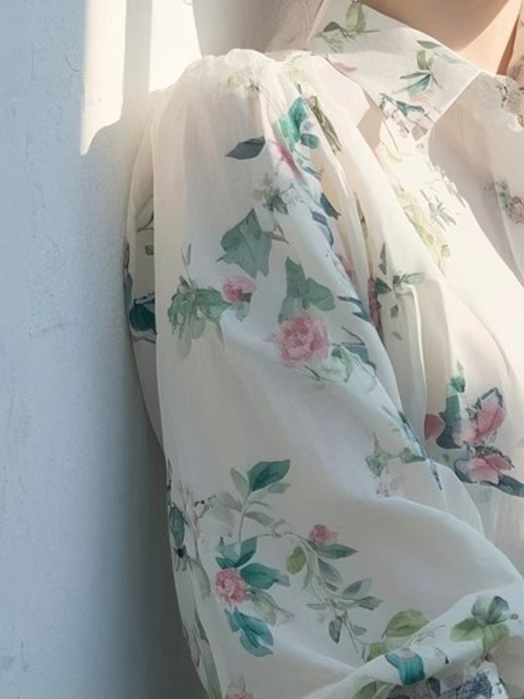 2025 봄 새로운 디자인 센스 니쉬 도파민 화이트 폴로 칼라 여성용 긴팔 탑 스태킹 꽃 셔츠