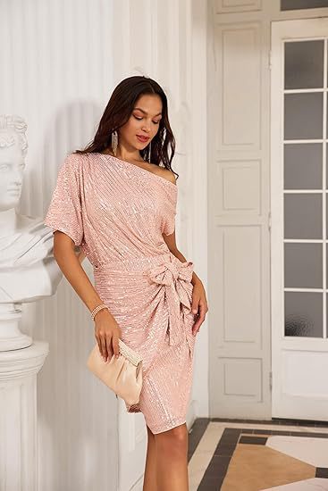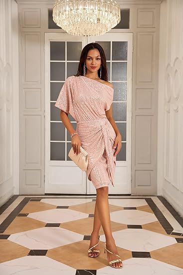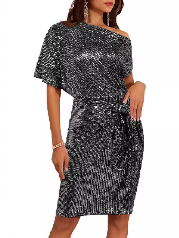 欧美跨境女士镶边闪亮闪光派对俱乐部连衣裙一肩褶皱敬酒礼服时尚