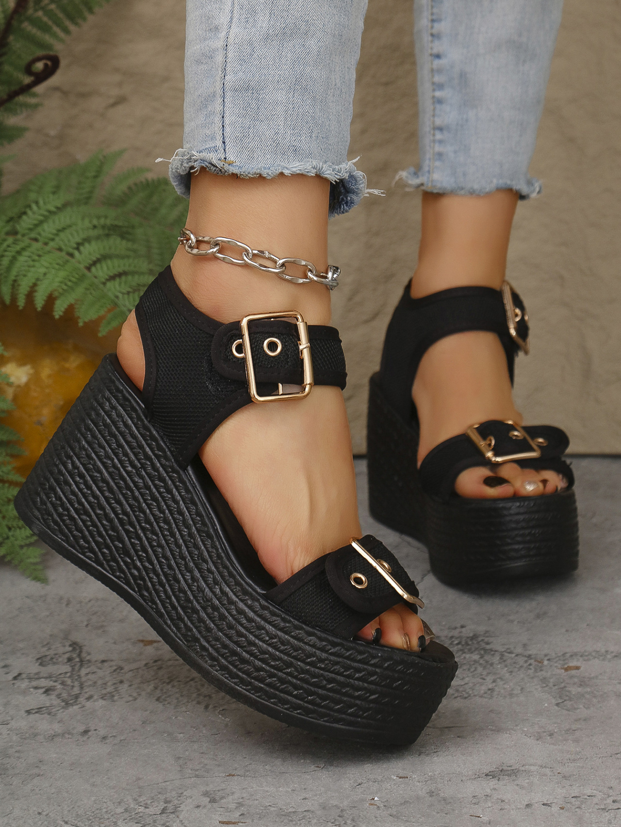 2025 년 여름 새로운 유럽과 미국의 패션 하이힐 샌들 여성 국경 간 플러스 사이즈 벨트 버클 여성 플랫폼 샌들스토어 가기