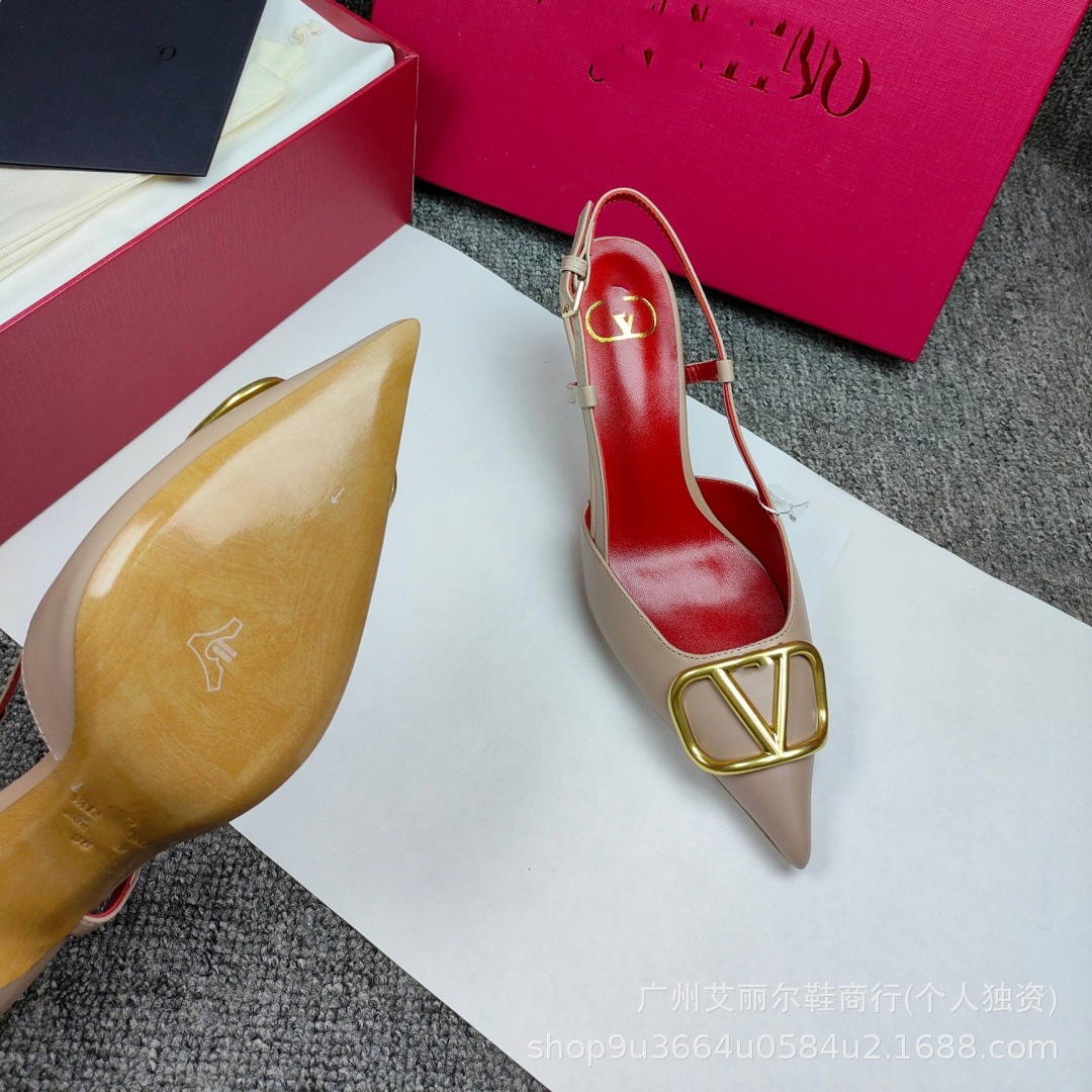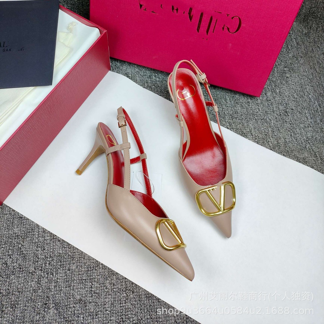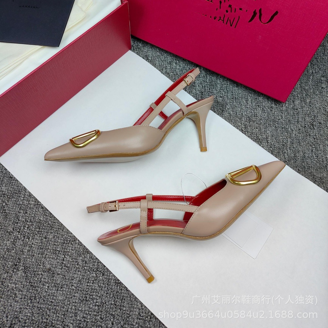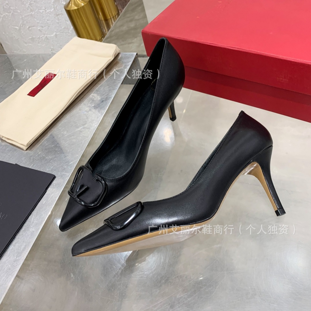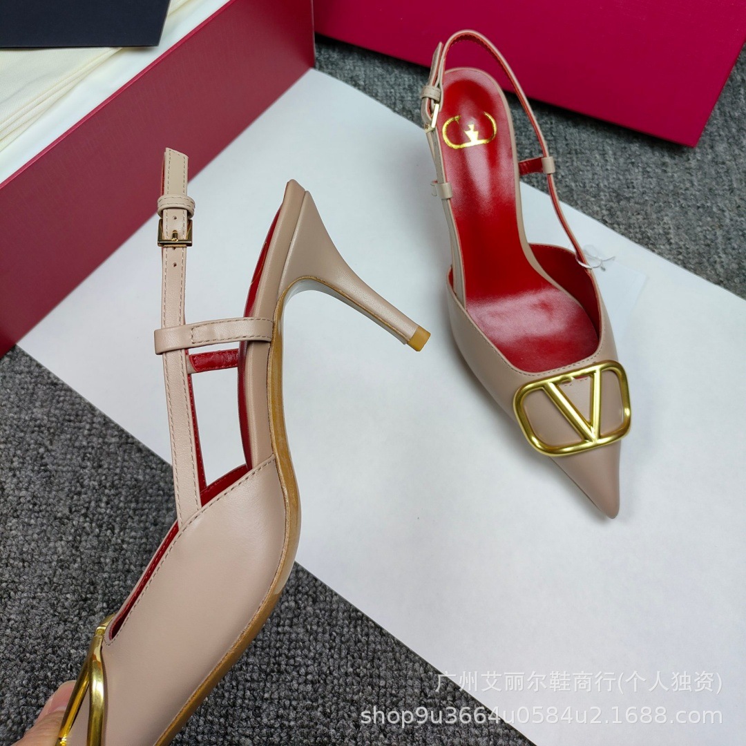 V 브랜드 하이힐 섹시 여성화, 메탈 V 버클 포인티드 토 싱글 슈즈, 얕은 입구의 달콤한 스틸레토 샌들, 여성 OL 스타일스토어 가기