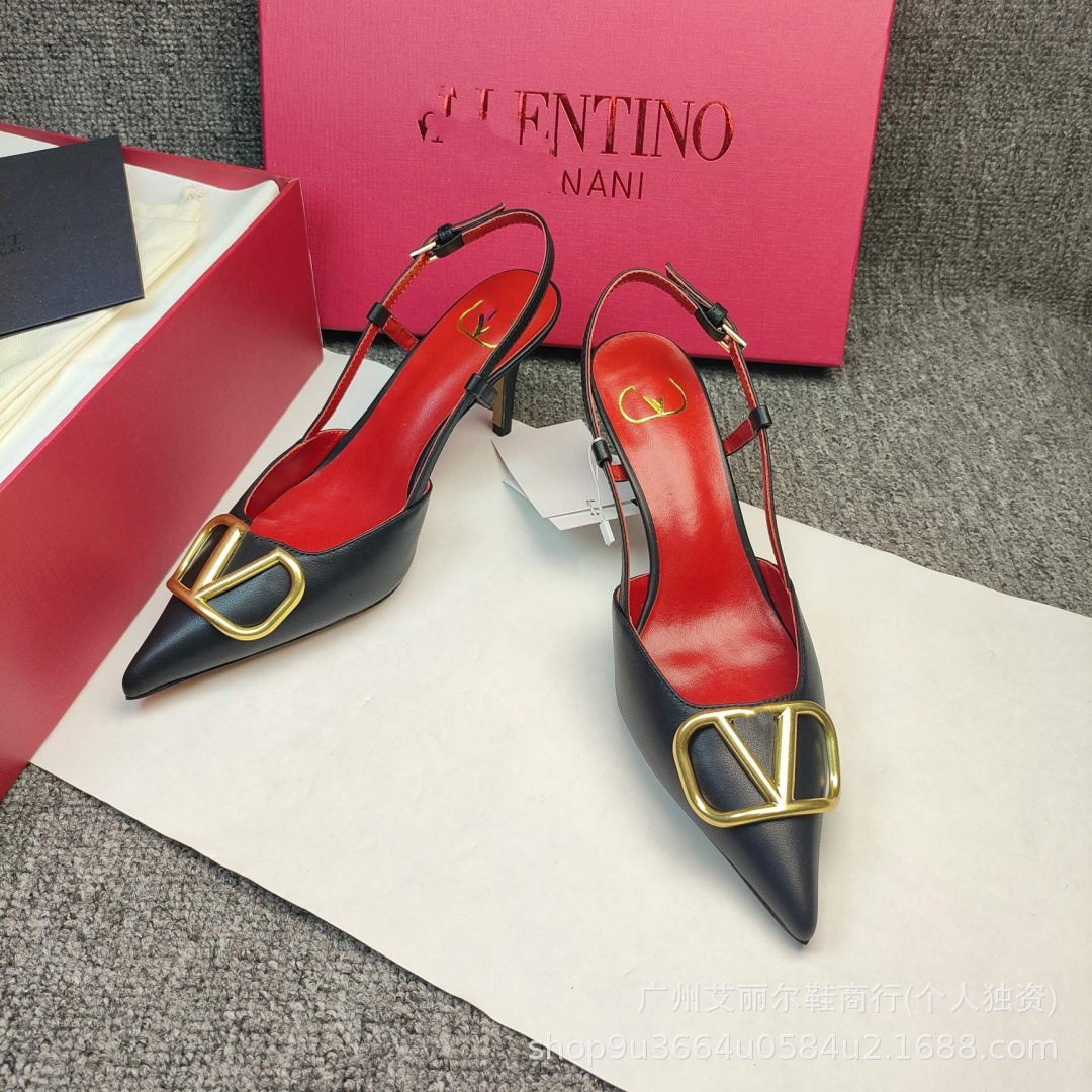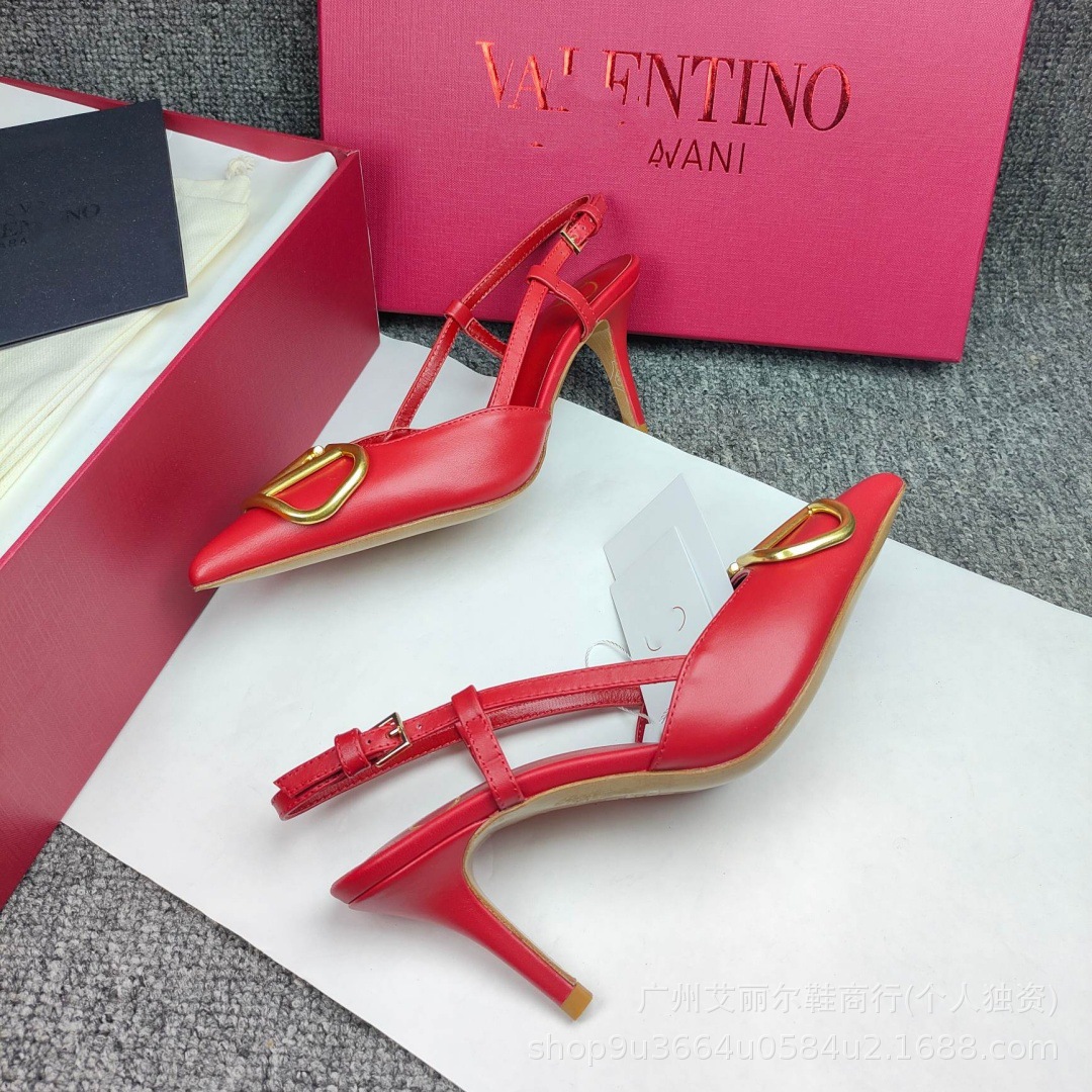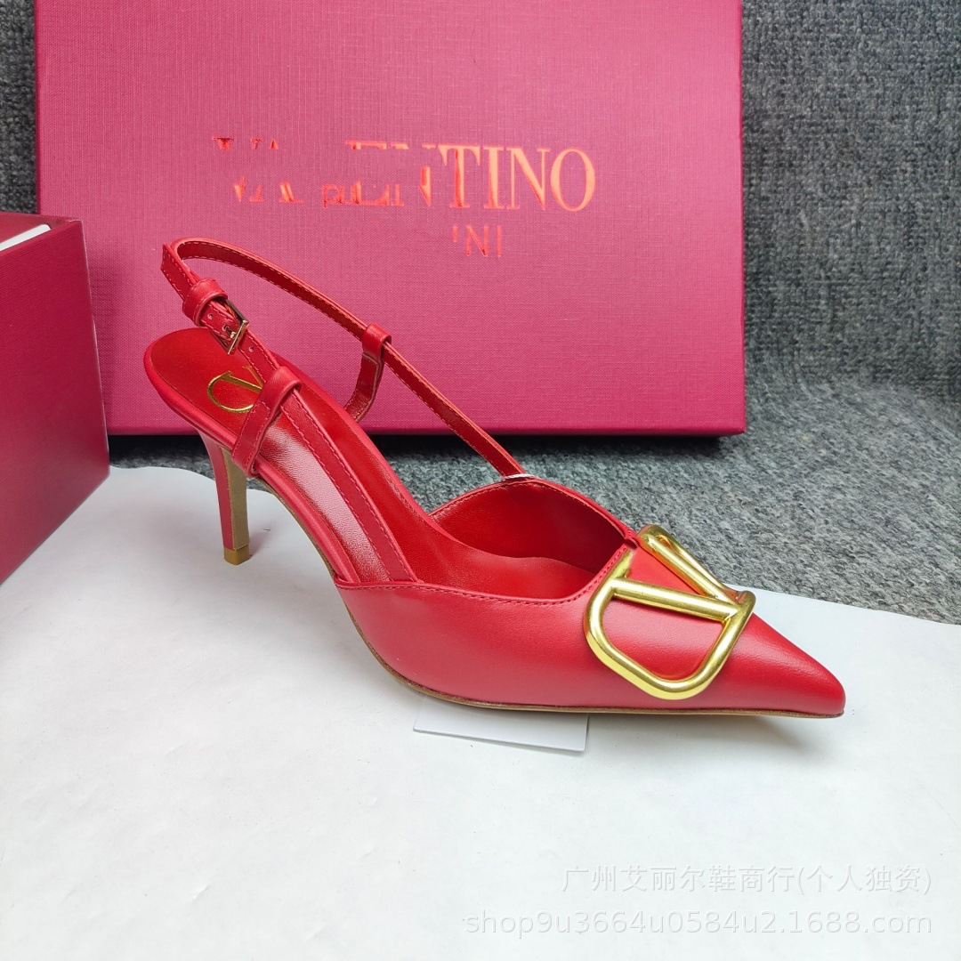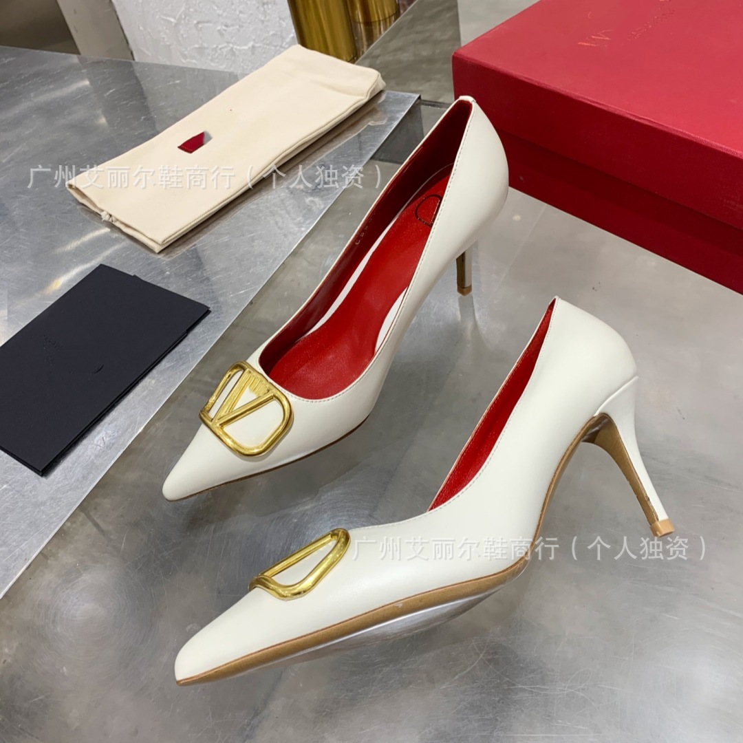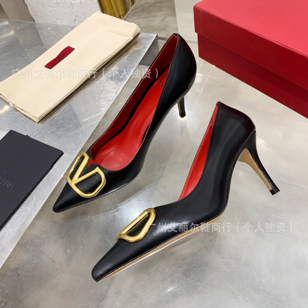 V 브랜드 하이힐 섹시 여성화, 메탈 V 버클 포인티드 토 싱글 슈즈, 얕은 입구의 달콤한 스틸레토 샌들, 여성 OL 스타일스토어 가기