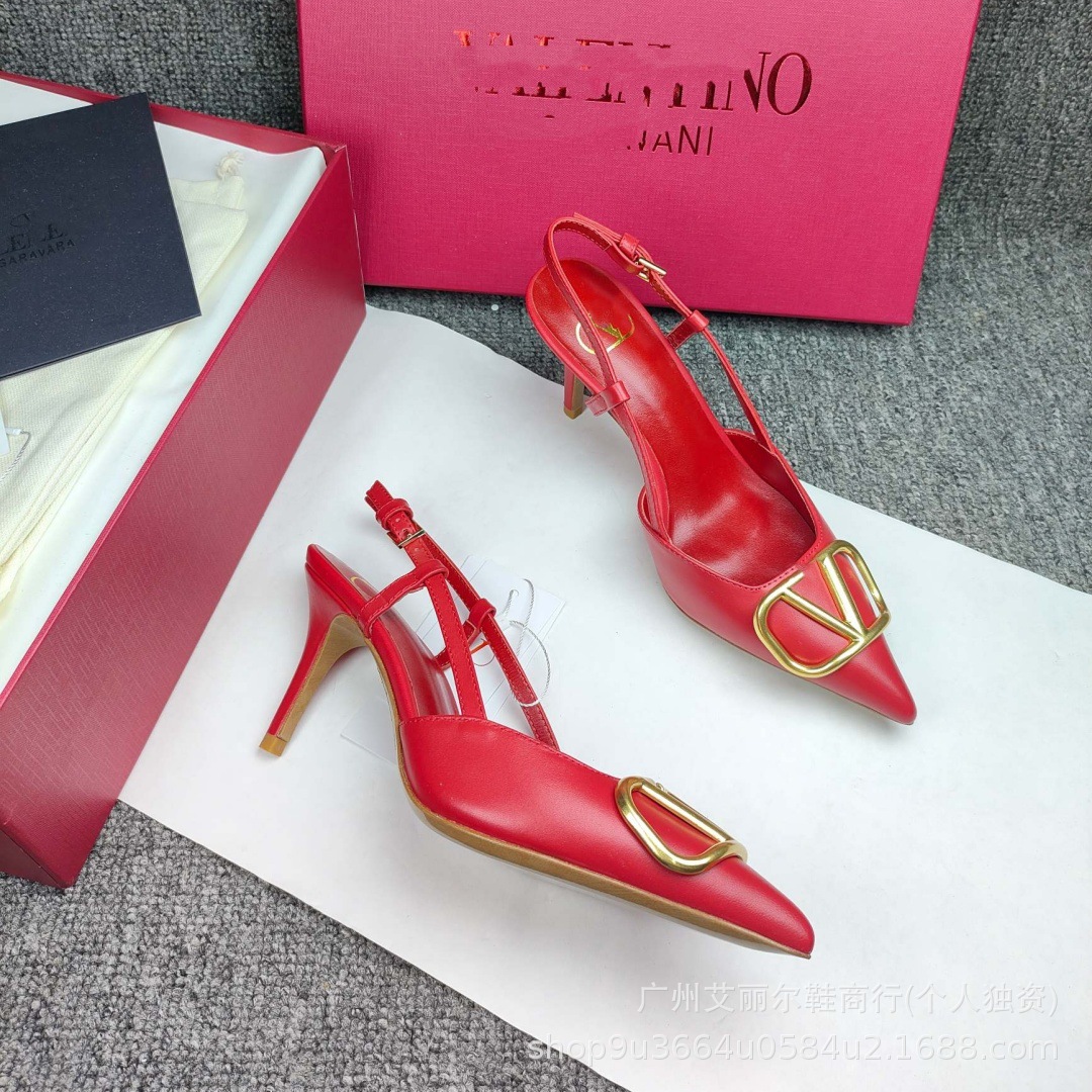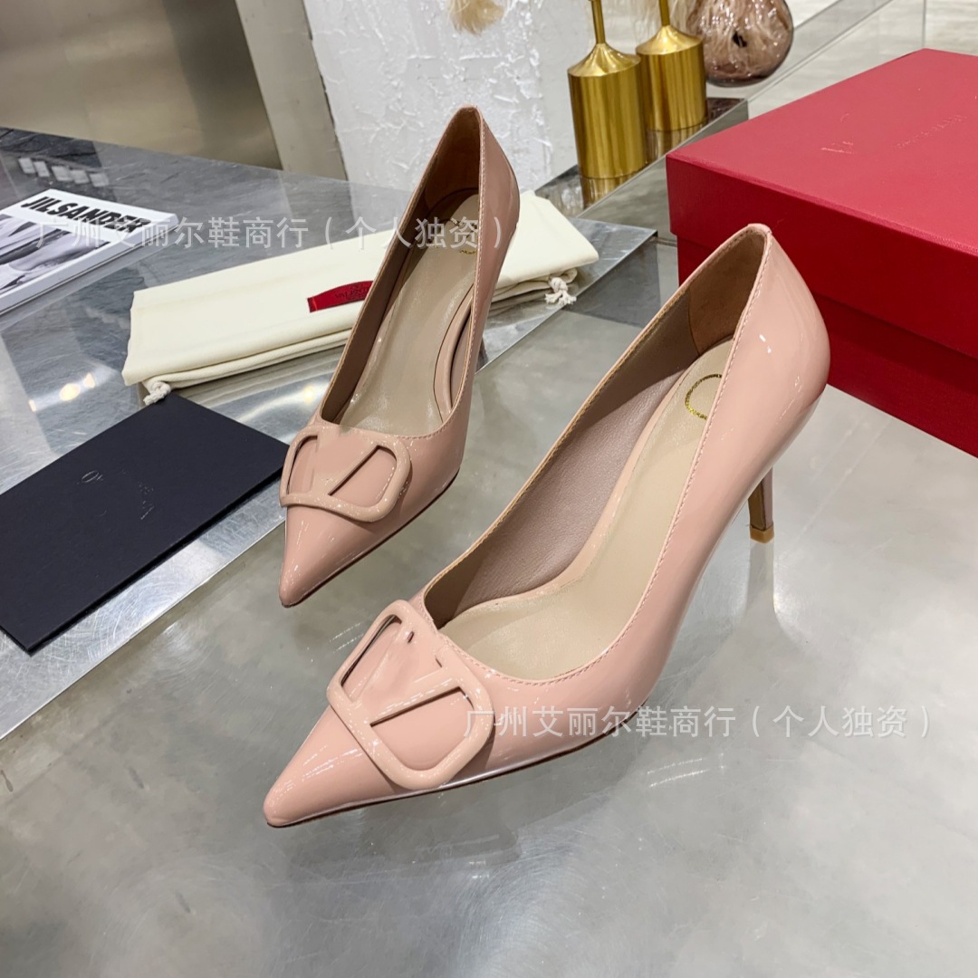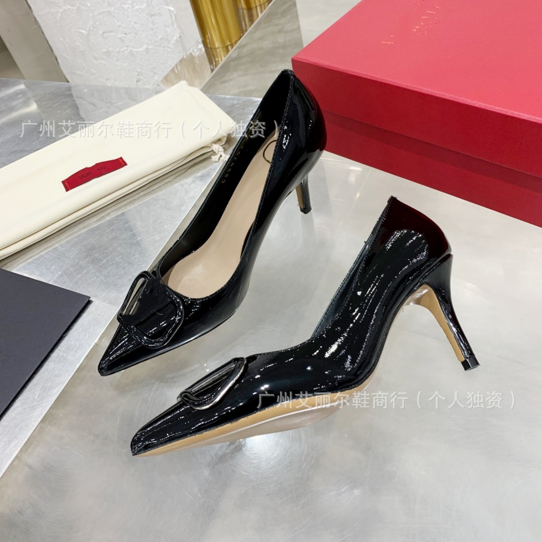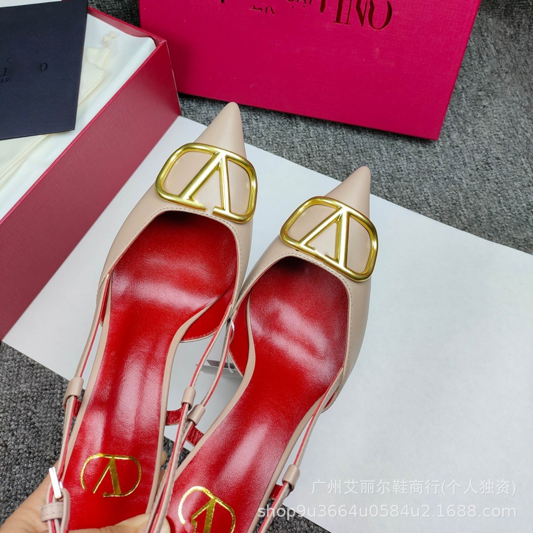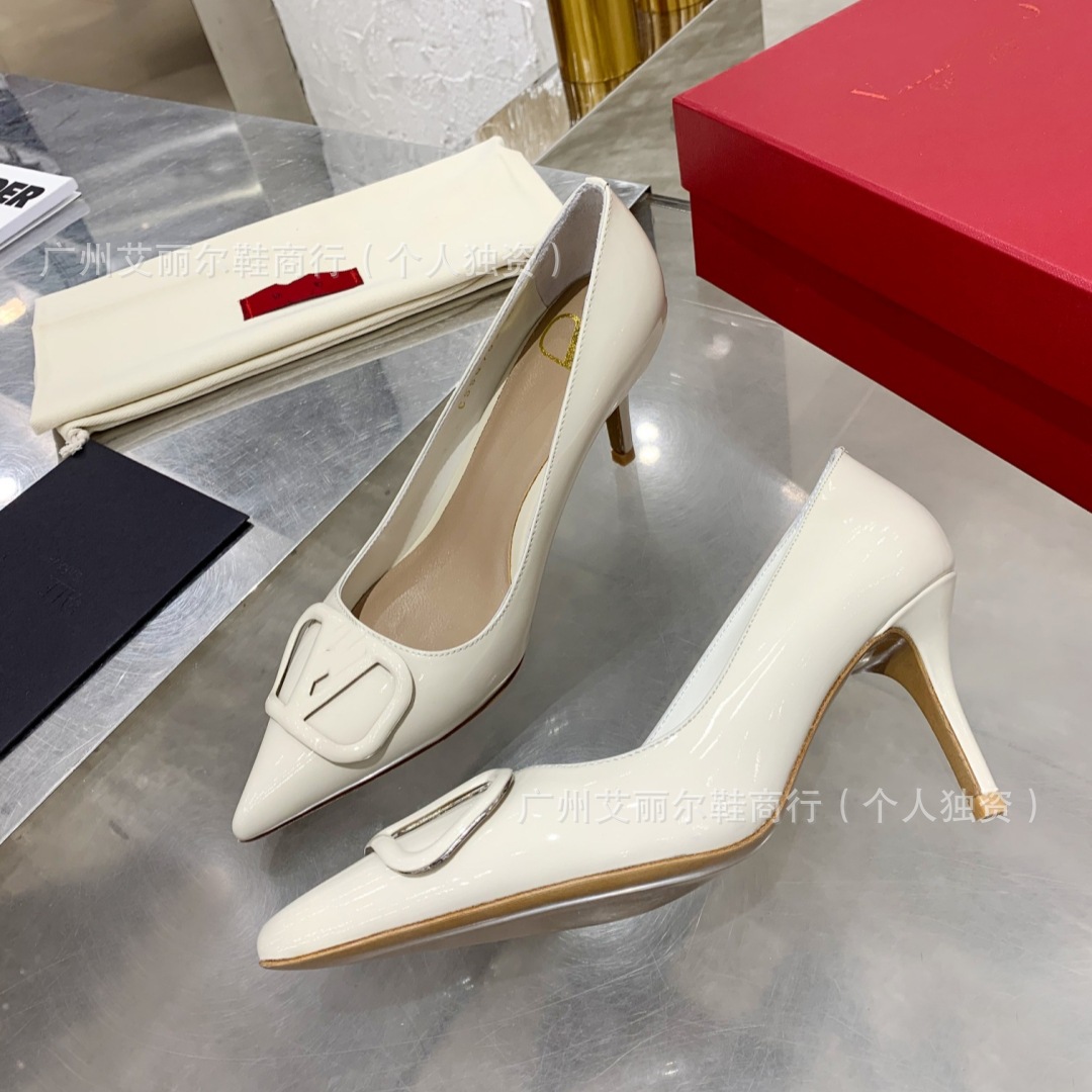 V 브랜드 하이힐 섹시 여성화, 메탈 V 버클 포인티드 토 싱글 슈즈, 얕은 입구의 달콤한 스틸레토 샌들, 여성 OL 스타일스토어 가기
