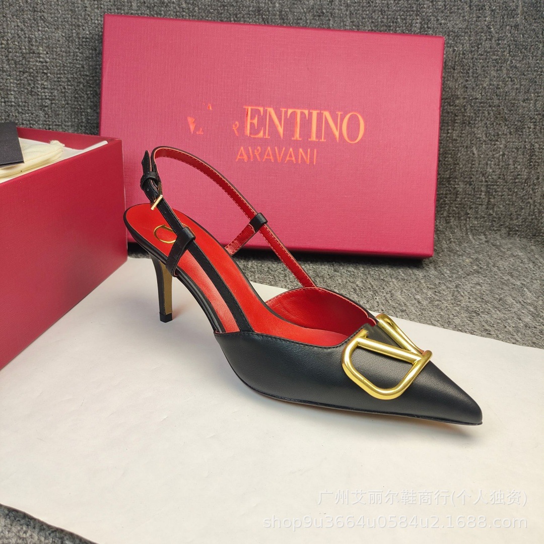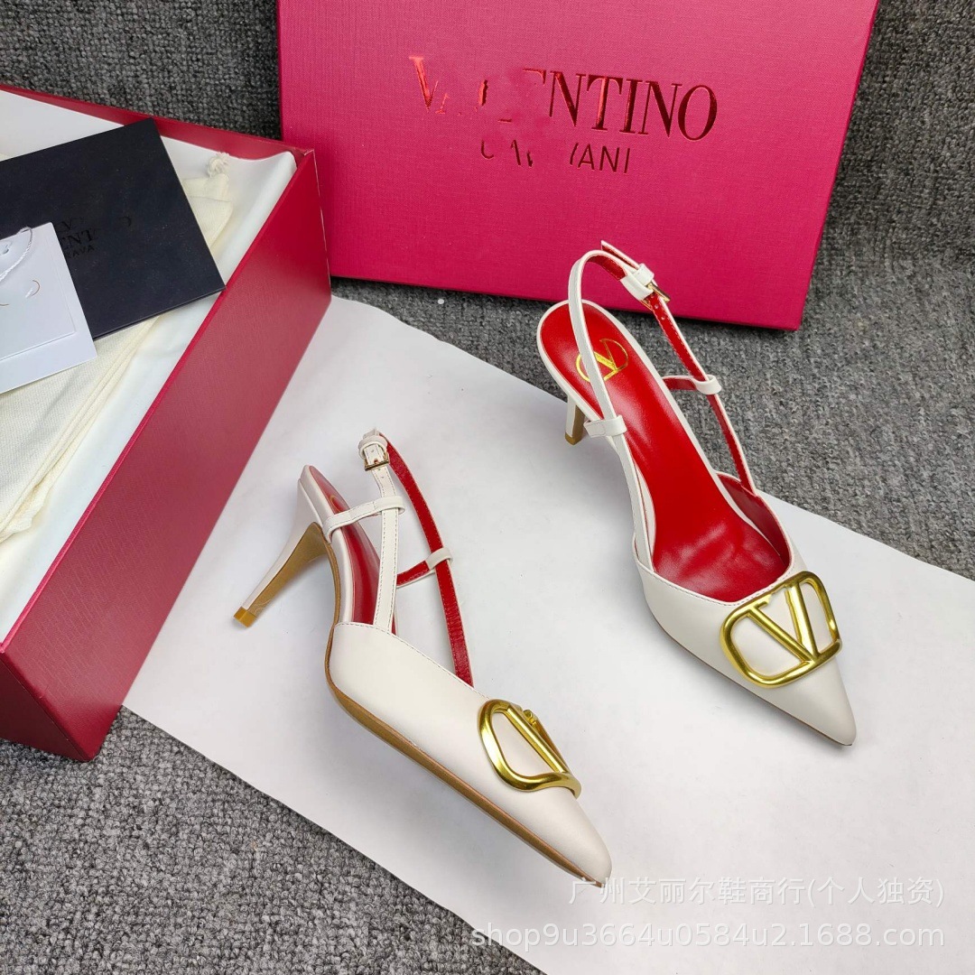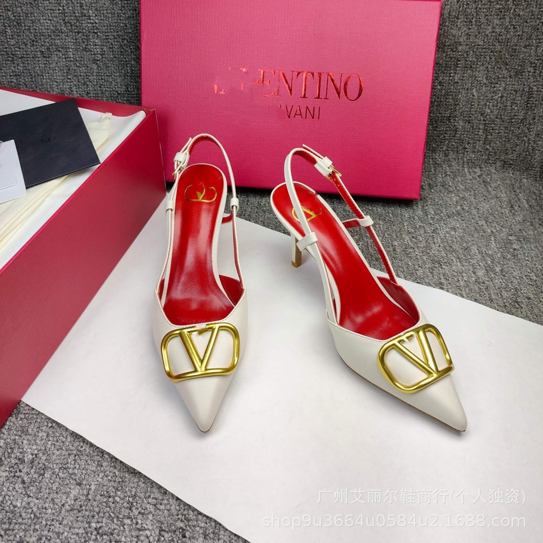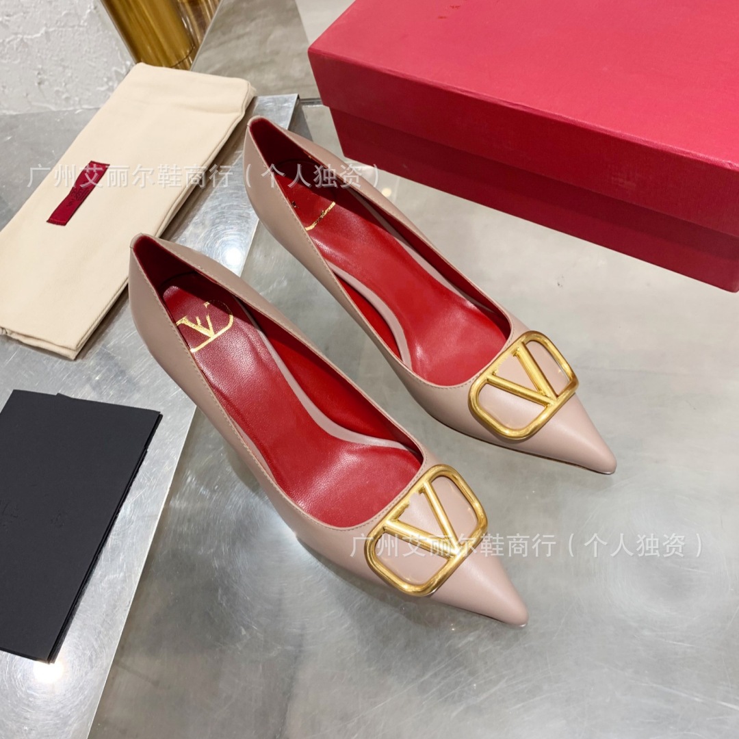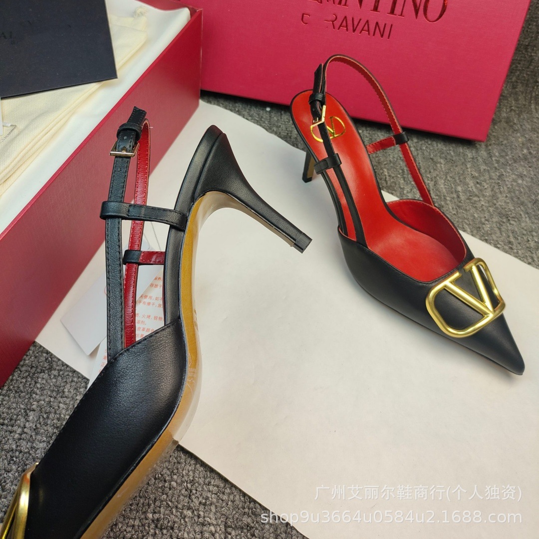 V 브랜드 하이힐 섹시 여성화, 메탈 V 버클 포인티드 토 싱글 슈즈, 얕은 입구의 달콤한 스틸레토 샌들, 여성 OL 스타일스토어 가기