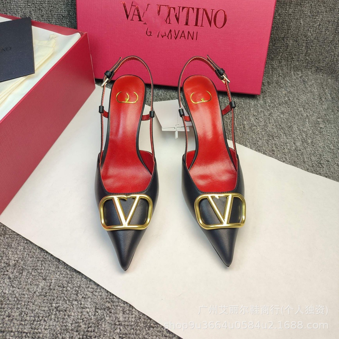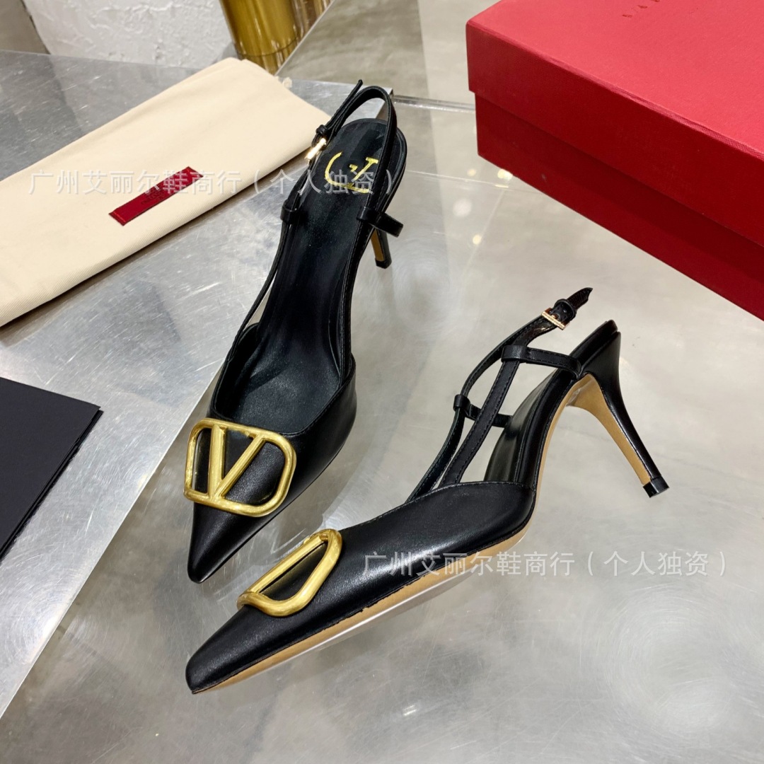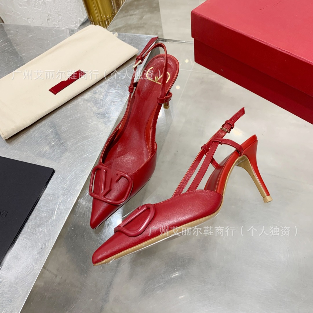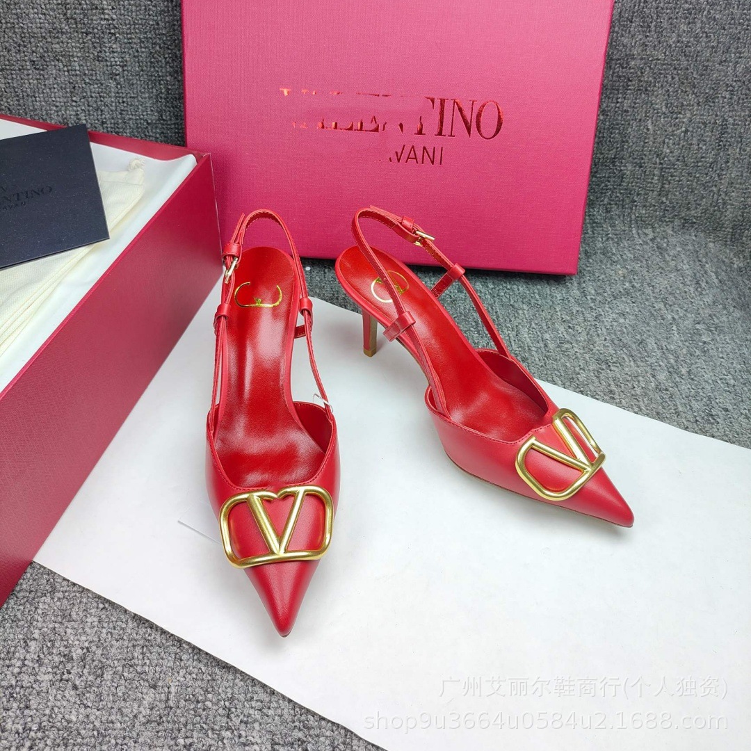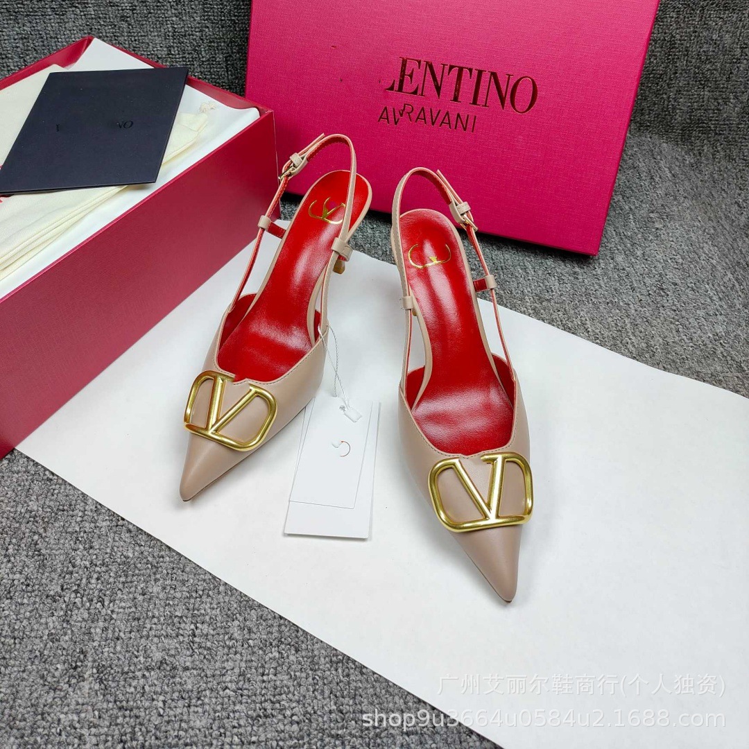 V 브랜드 하이힐 섹시 여성화, 메탈 V 버클 포인티드 토 싱글 슈즈, 얕은 입구의 달콤한 스틸레토 샌들, 여성 OL 스타일스토어 가기
