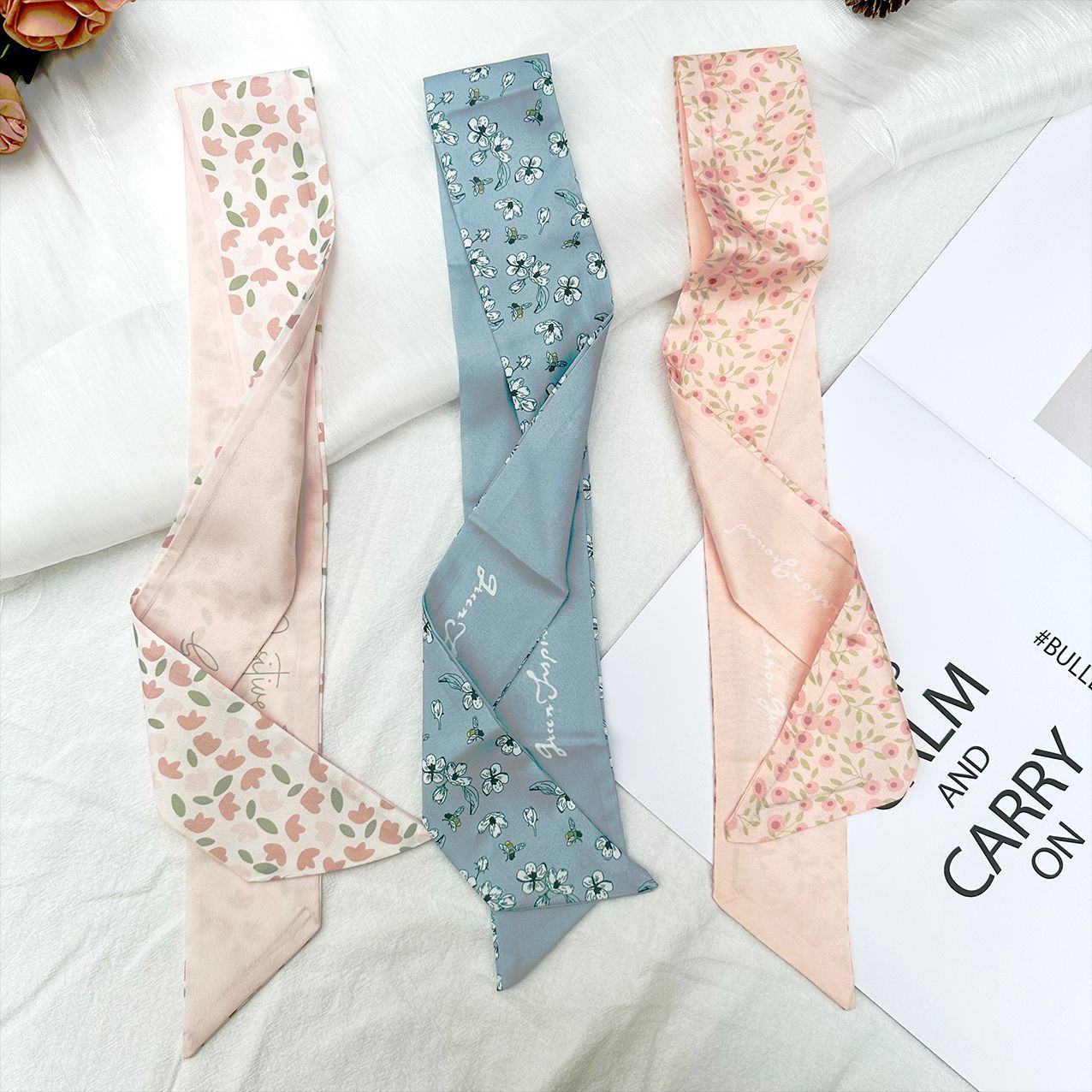 아름다운 롱 매치 실크 스카프 넥타이 헤어 밴드 활 편지 꽃 리본 넥타이 가방 동반 선물 작은 실크 스카프