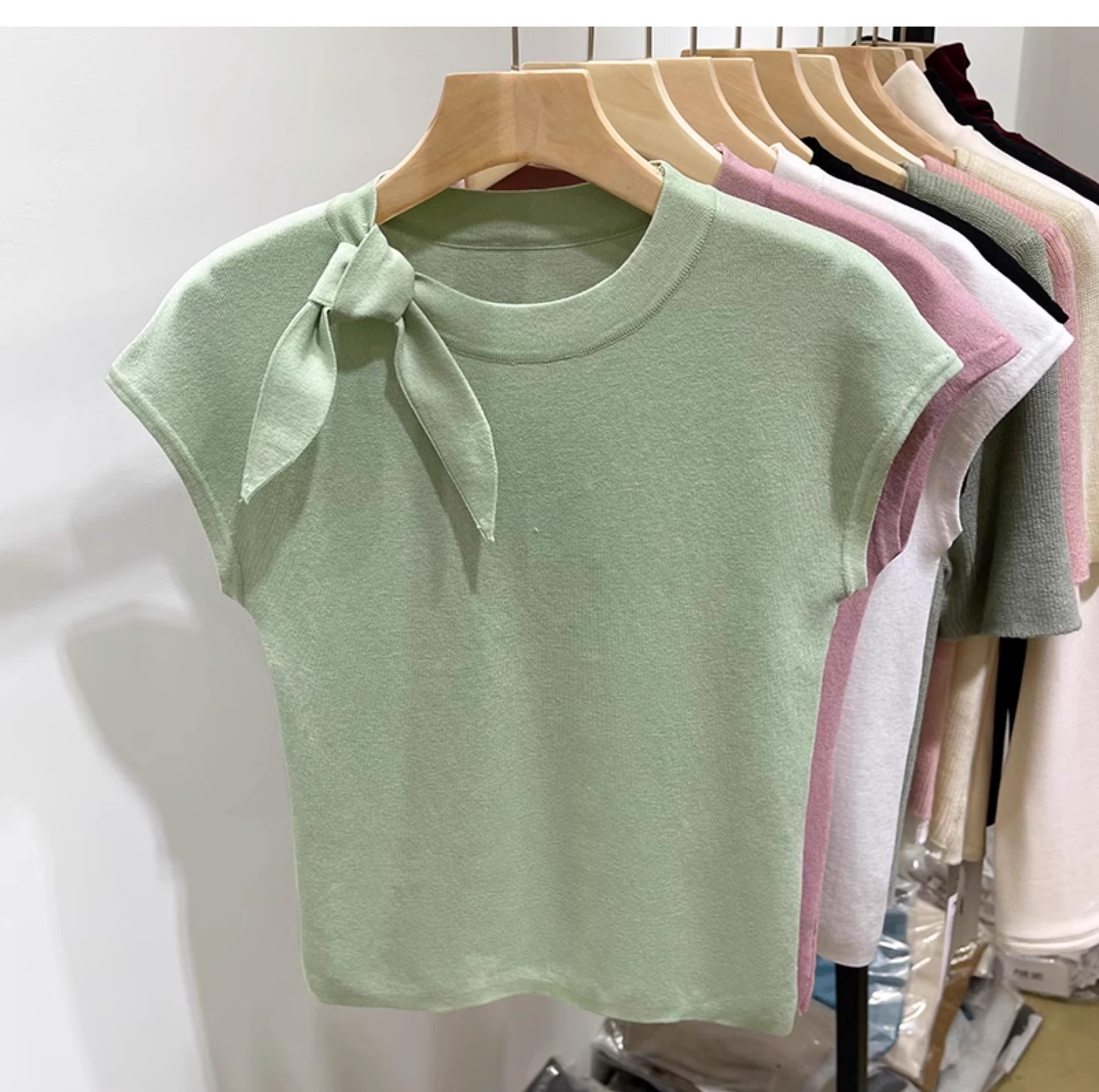 스트랩 크루 넥 아이스 실크 반팔 니트 티셔츠 여자 여름 2025 새로운 슬림 핏 올 매치 플라잉 슬리브 셔츠 탑스토어 가기