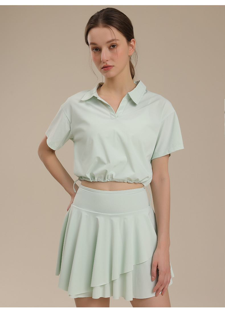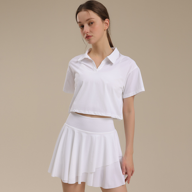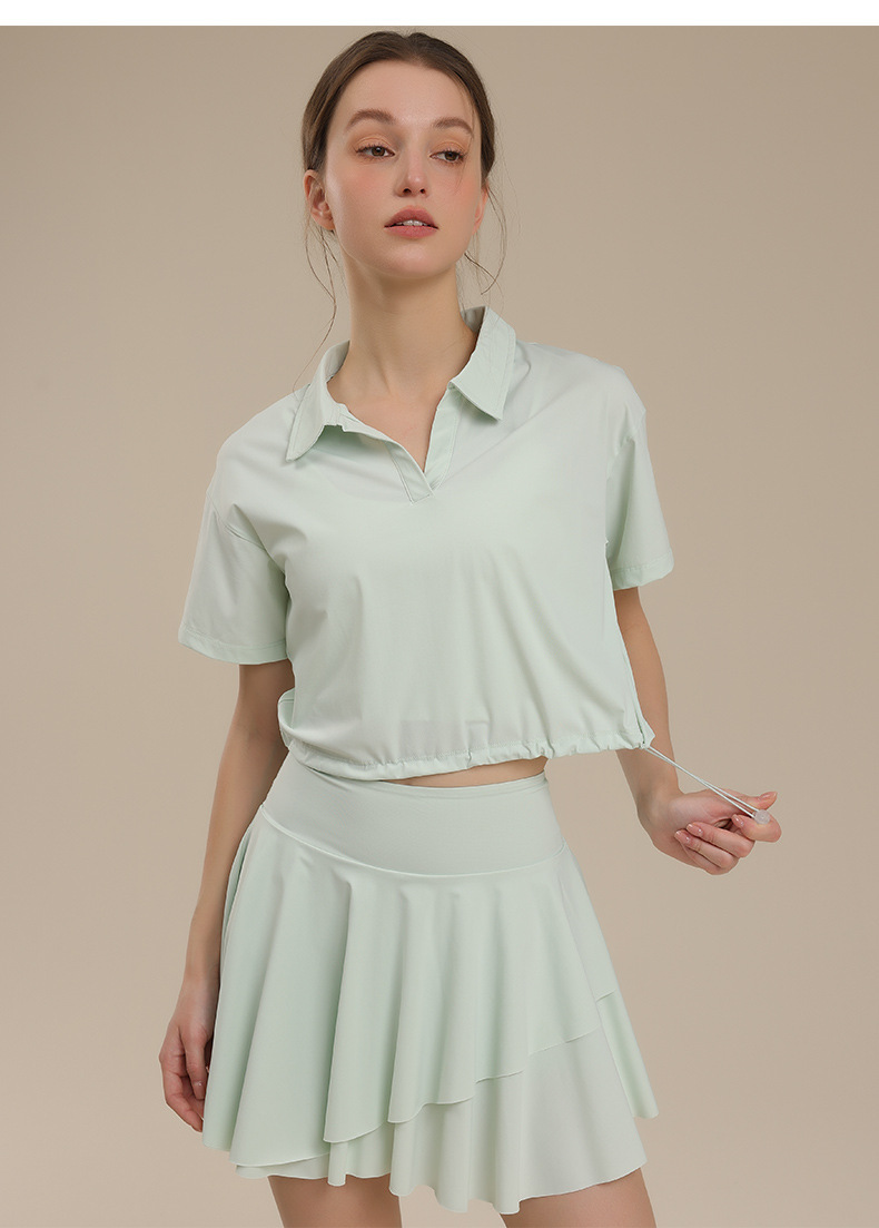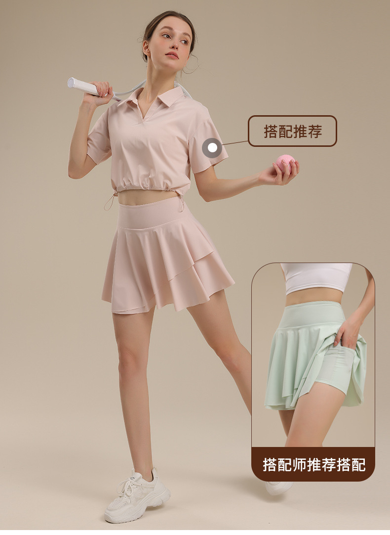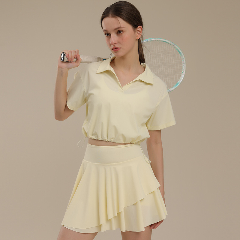 얼음 느낌 빠른 건조 선 스크린 피트니스 요가 세트 여성용 드로우 로우 아우터 반팔 높은 허리 안티 눈부심 짧은 스커트 투피스 세트