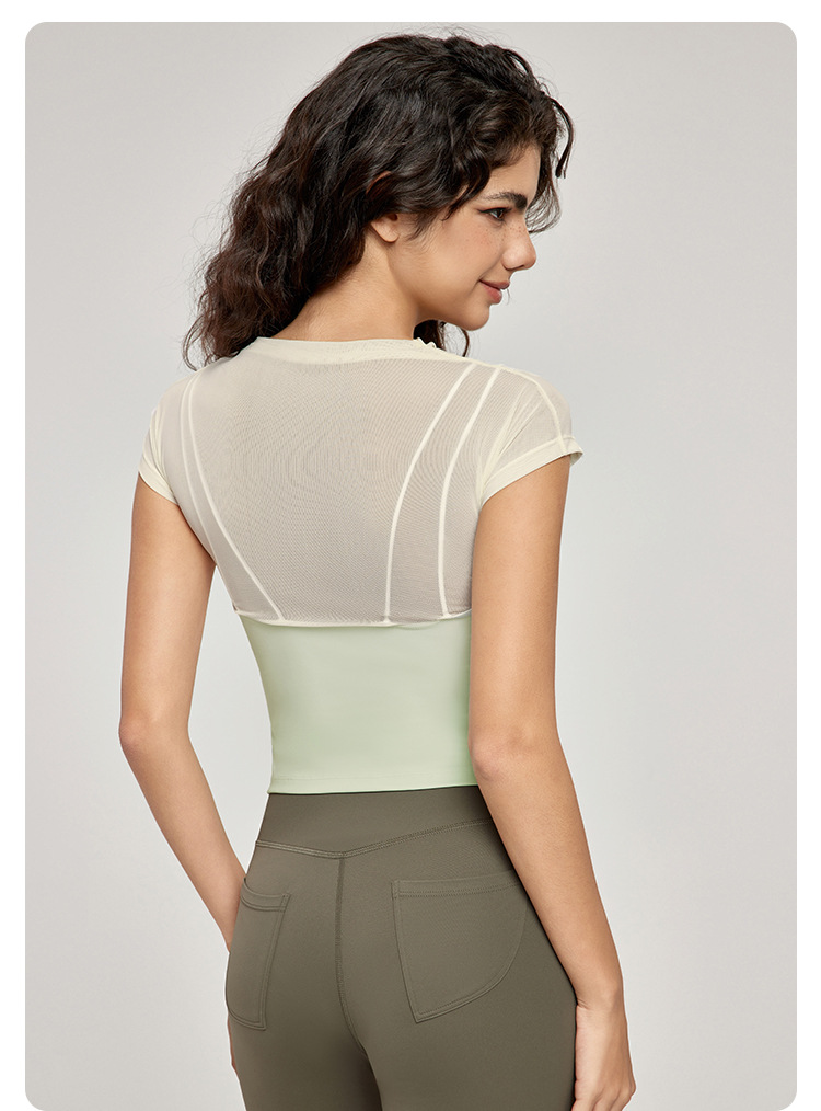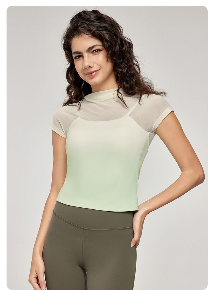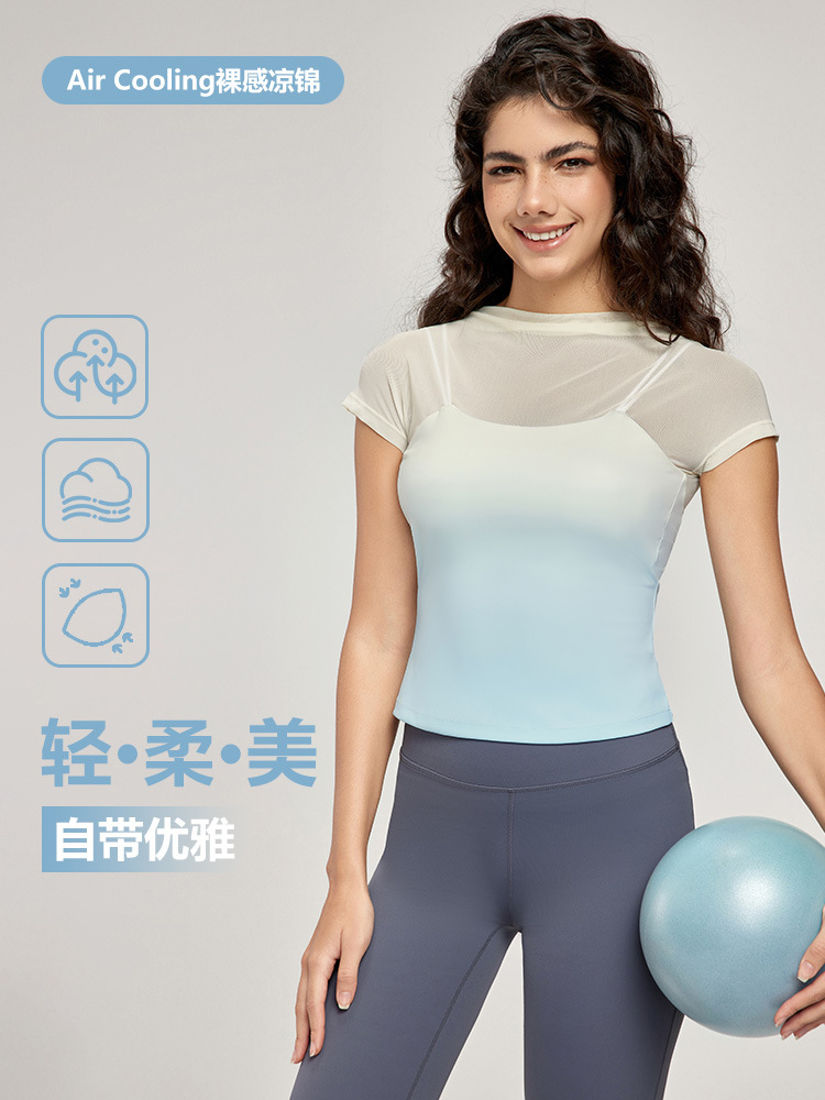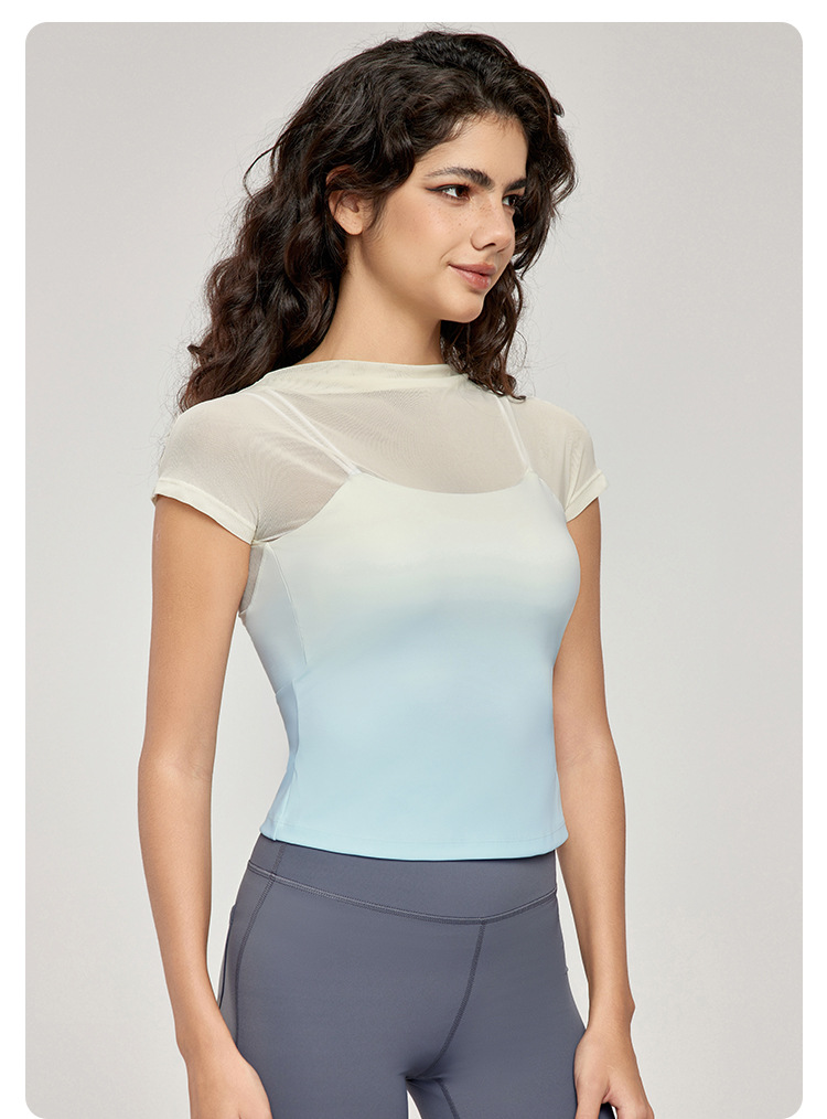 그라디언트 알몸 요가 세트 반팔 고정 가슴 패드 메쉬 바느질 티셔츠 댄스 훈련 타이트 허리 피트니스 탑