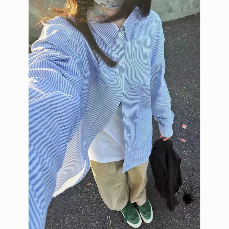 미국 스타일의 트렌디 한 스트라이프 셔츠 여성용 썬 코트 2024 가을 새로운 느슨한 올매치 미트 커버 셔츠 스택 트렌디스토어 가기