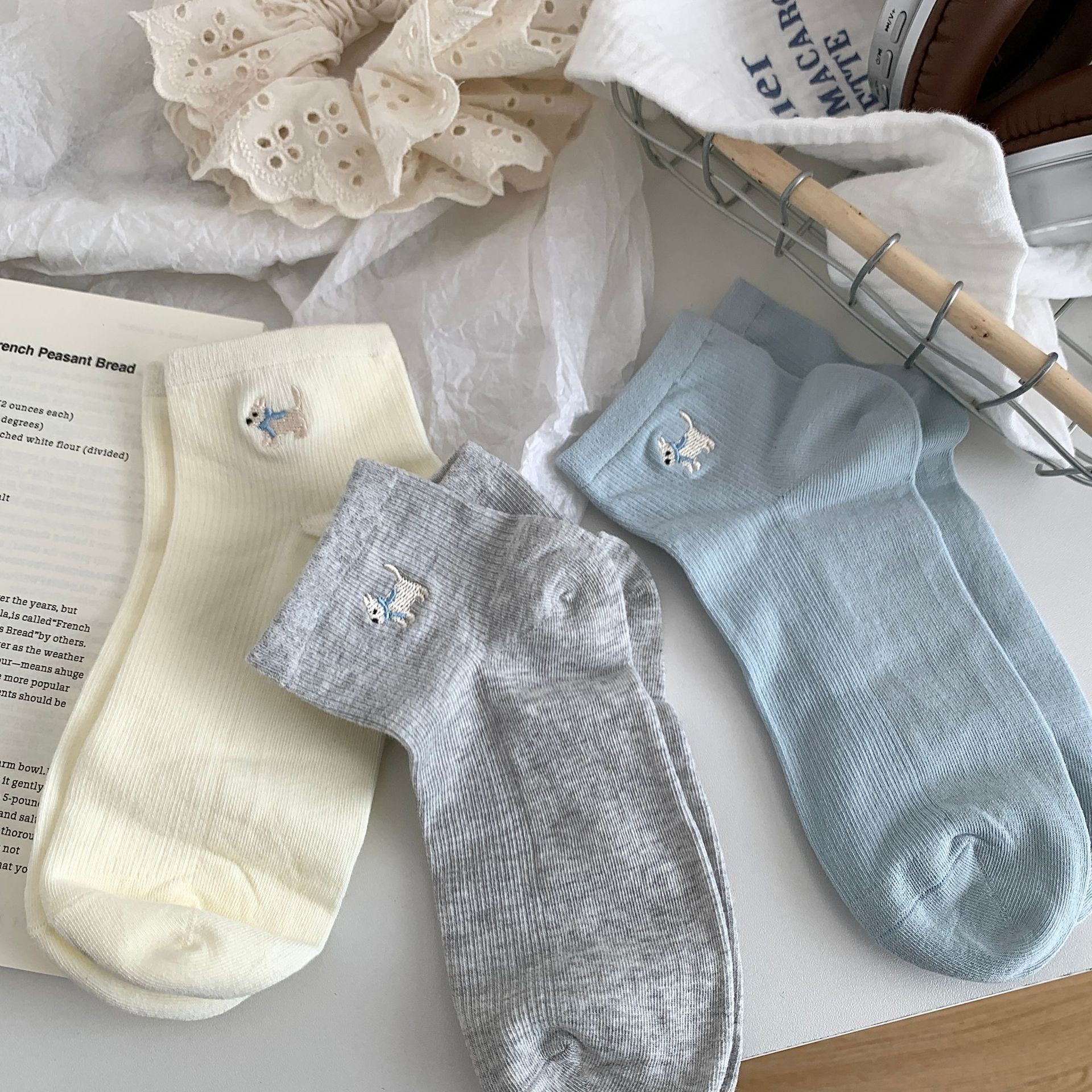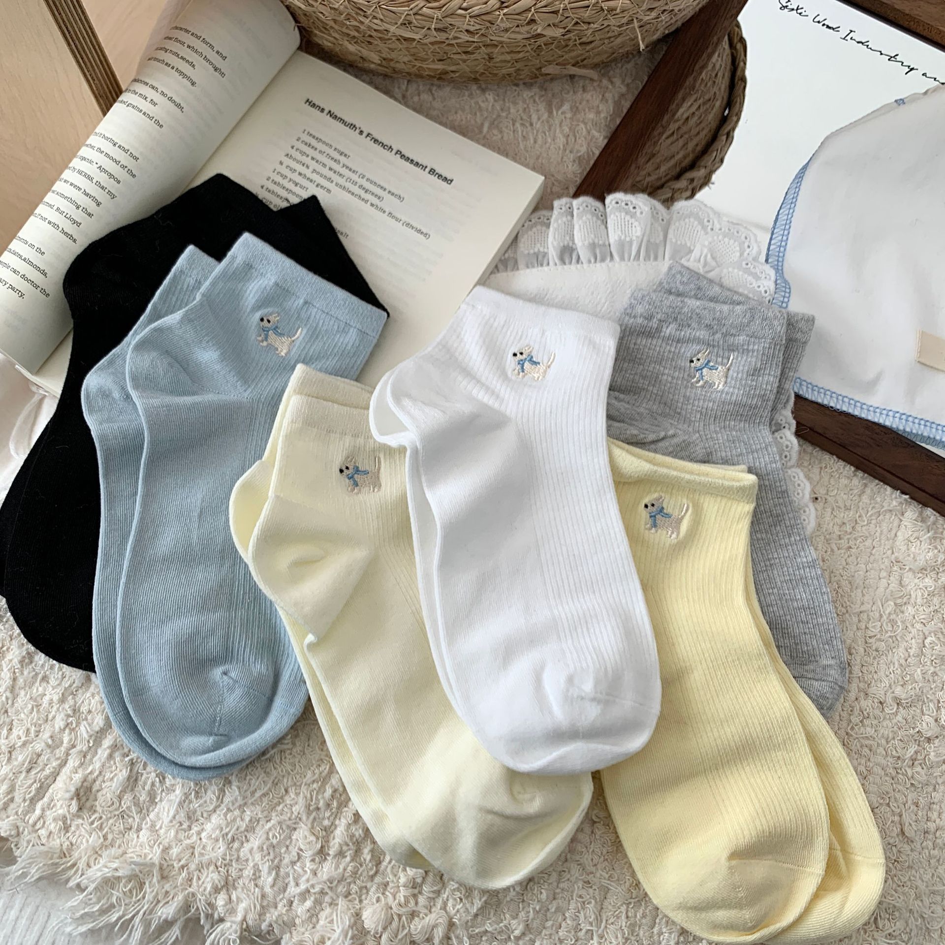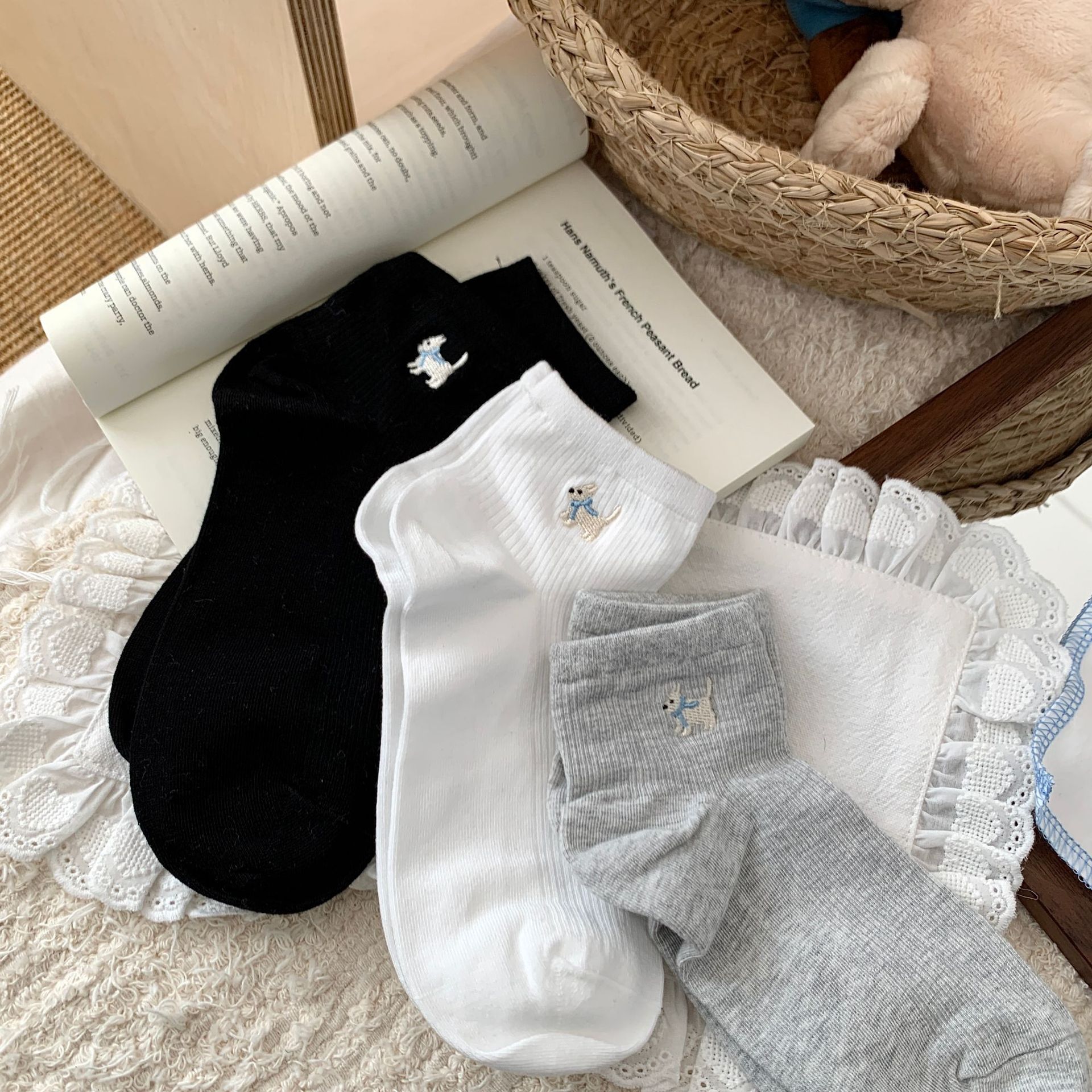 양말 여성 짧은 양말 봄과 여름 얇은 자수 강아지 양말 면 메쉬 중간 양말 통기성 짧은 양말 여름