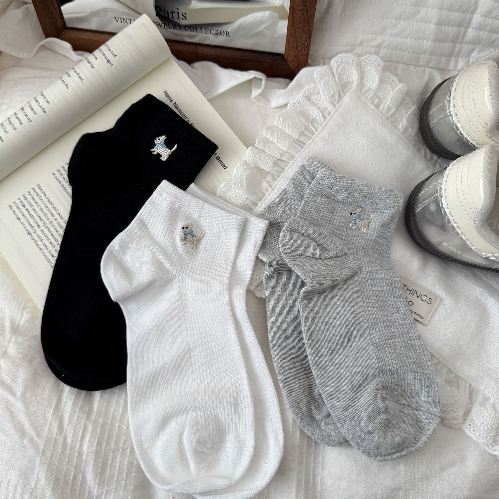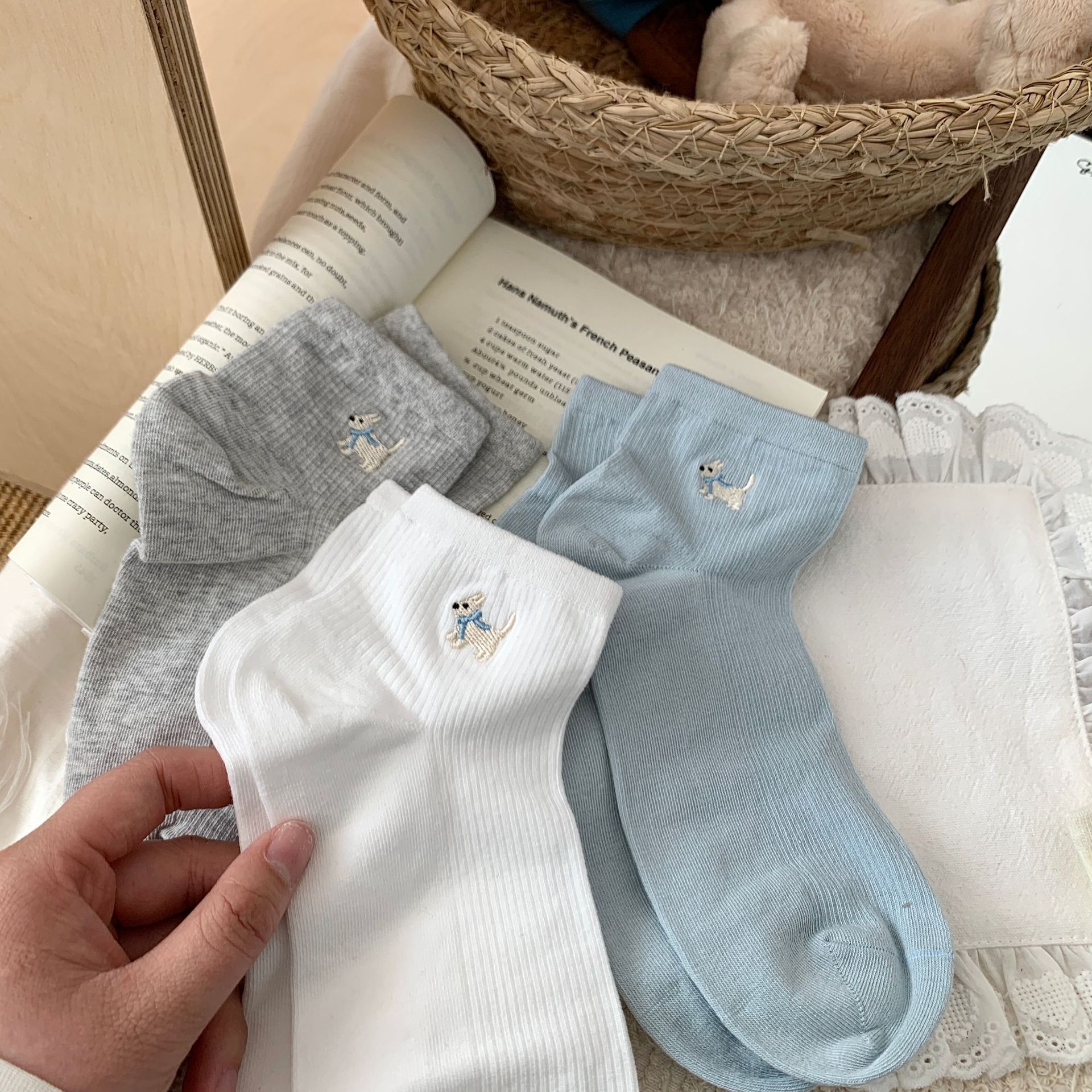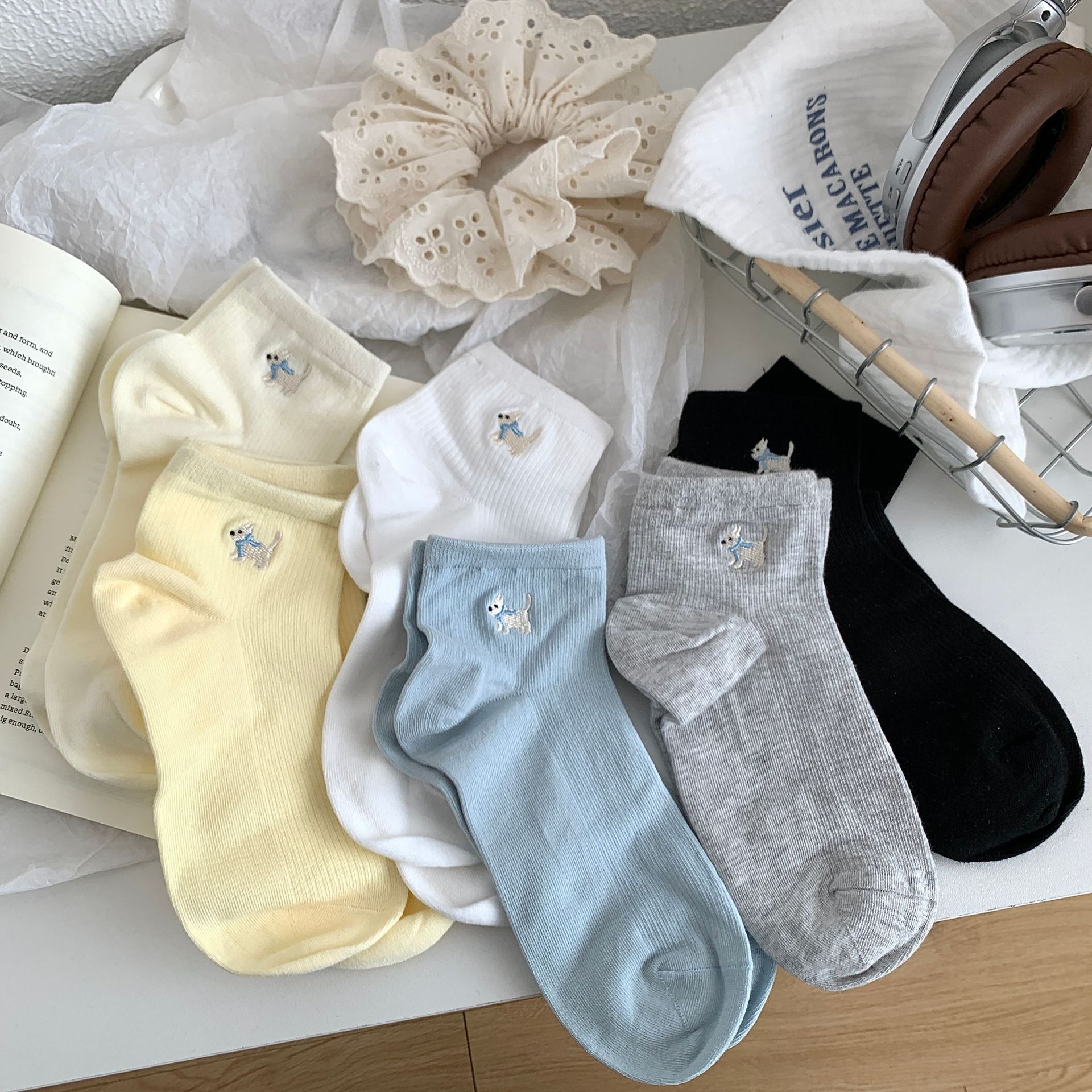 양말 여성 짧은 양말 봄과 여름 얇은 자수 강아지 양말 면 메쉬 중간 양말 통기성 짧은 양말 여름