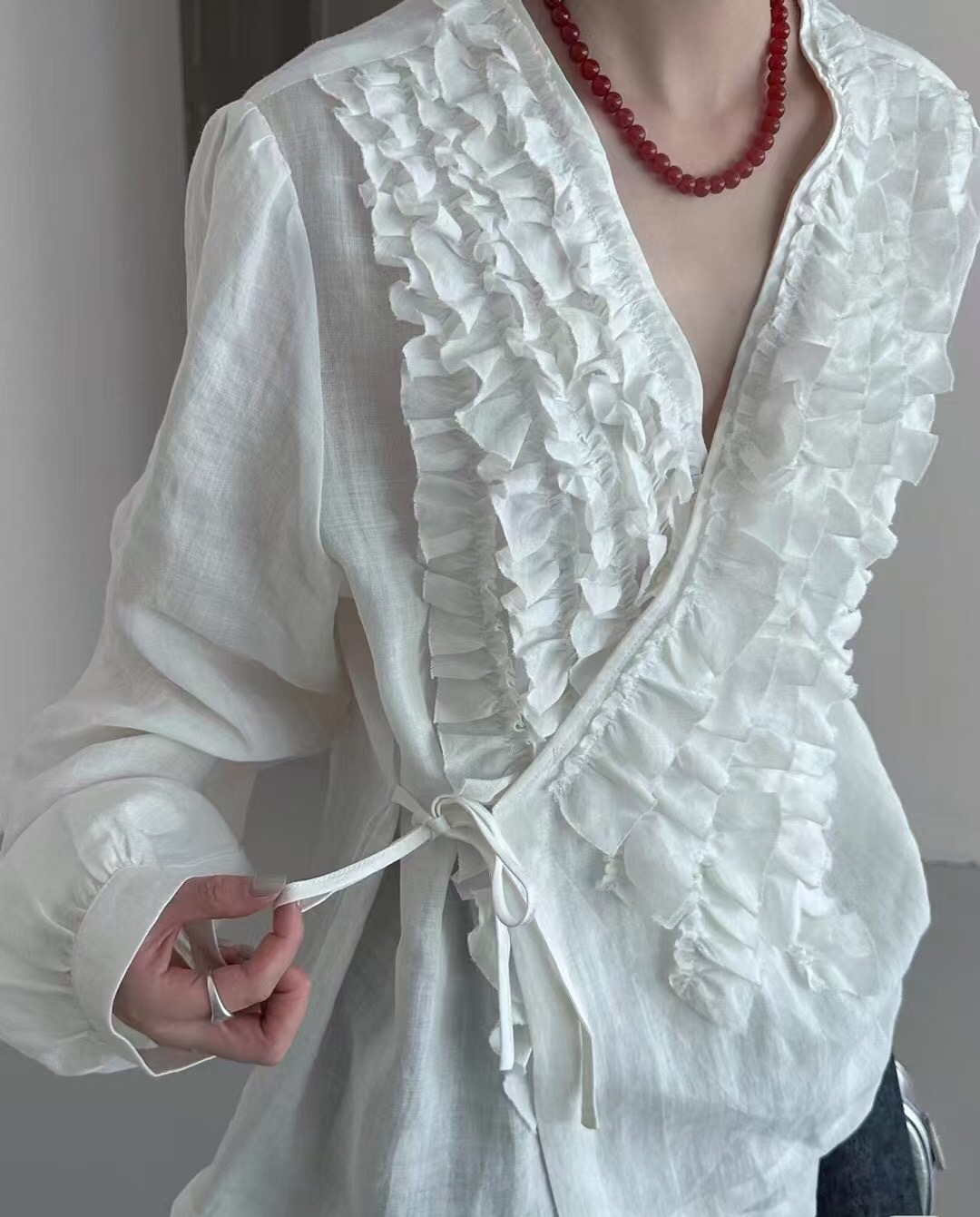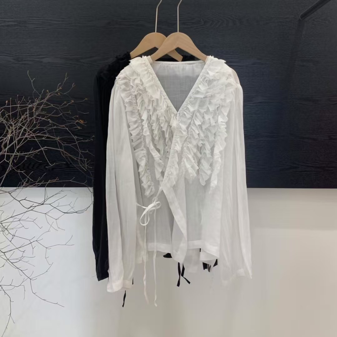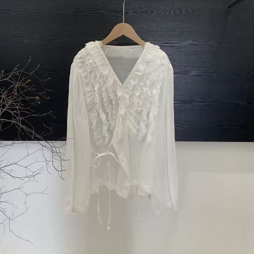 봄과 여름 새로운 핀치 주름 레이스 레이스 셔츠 예술적 여성 V 넥 슬란 트 플래켓 탑 솔리드 컬러 간단한 느슨한 작은 셔츠스토어 가기