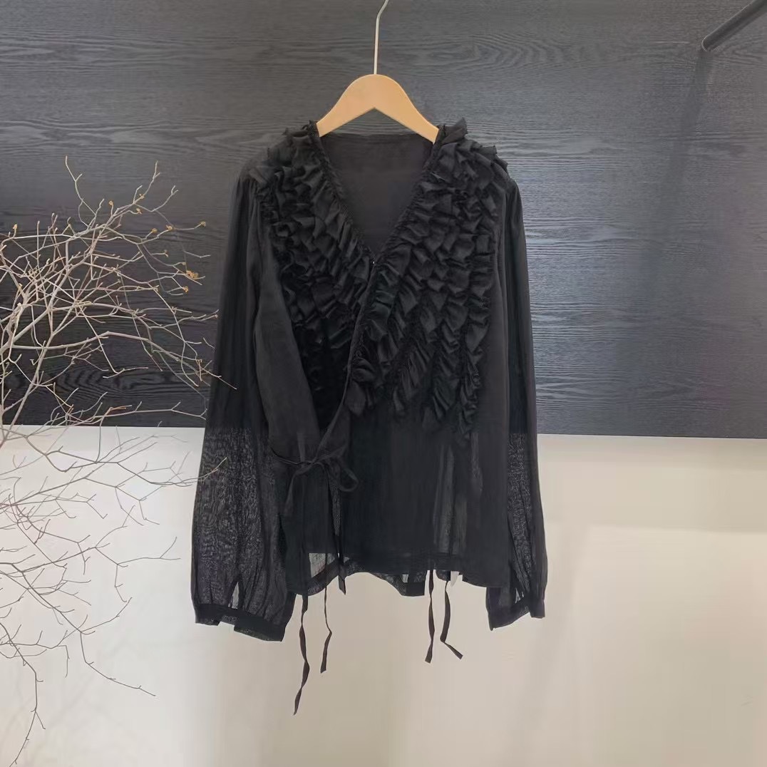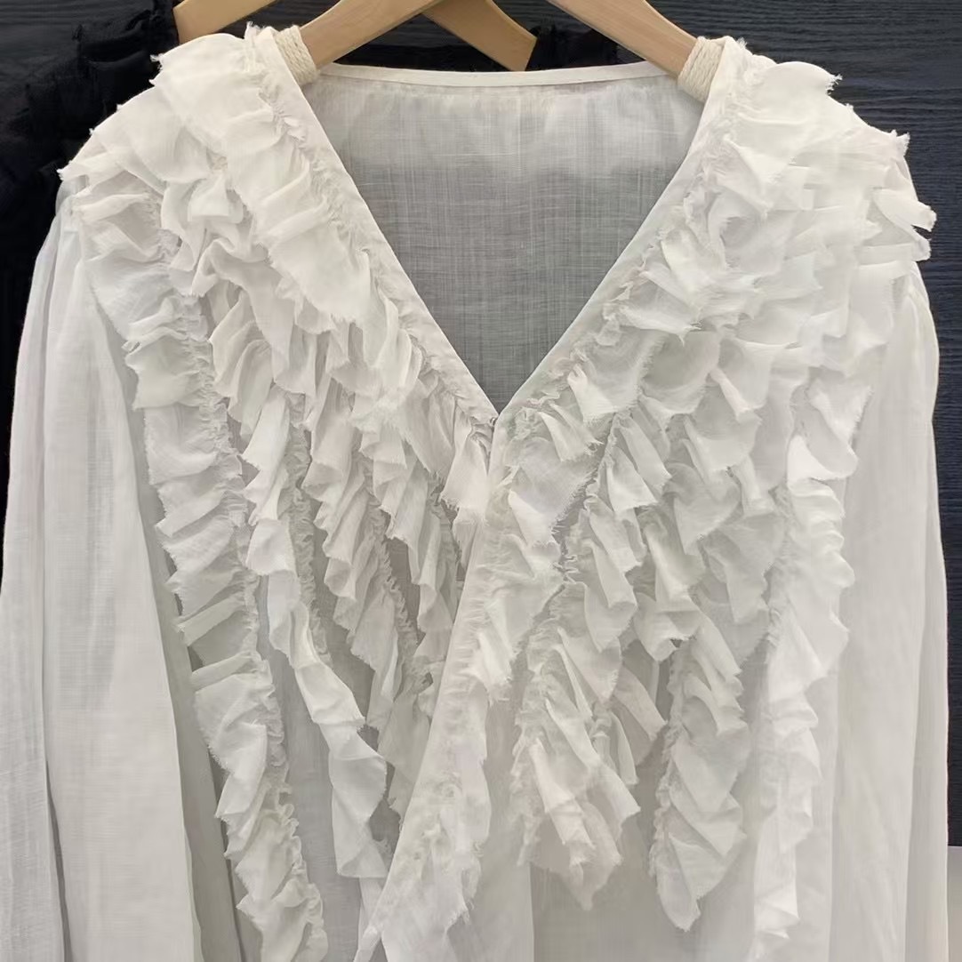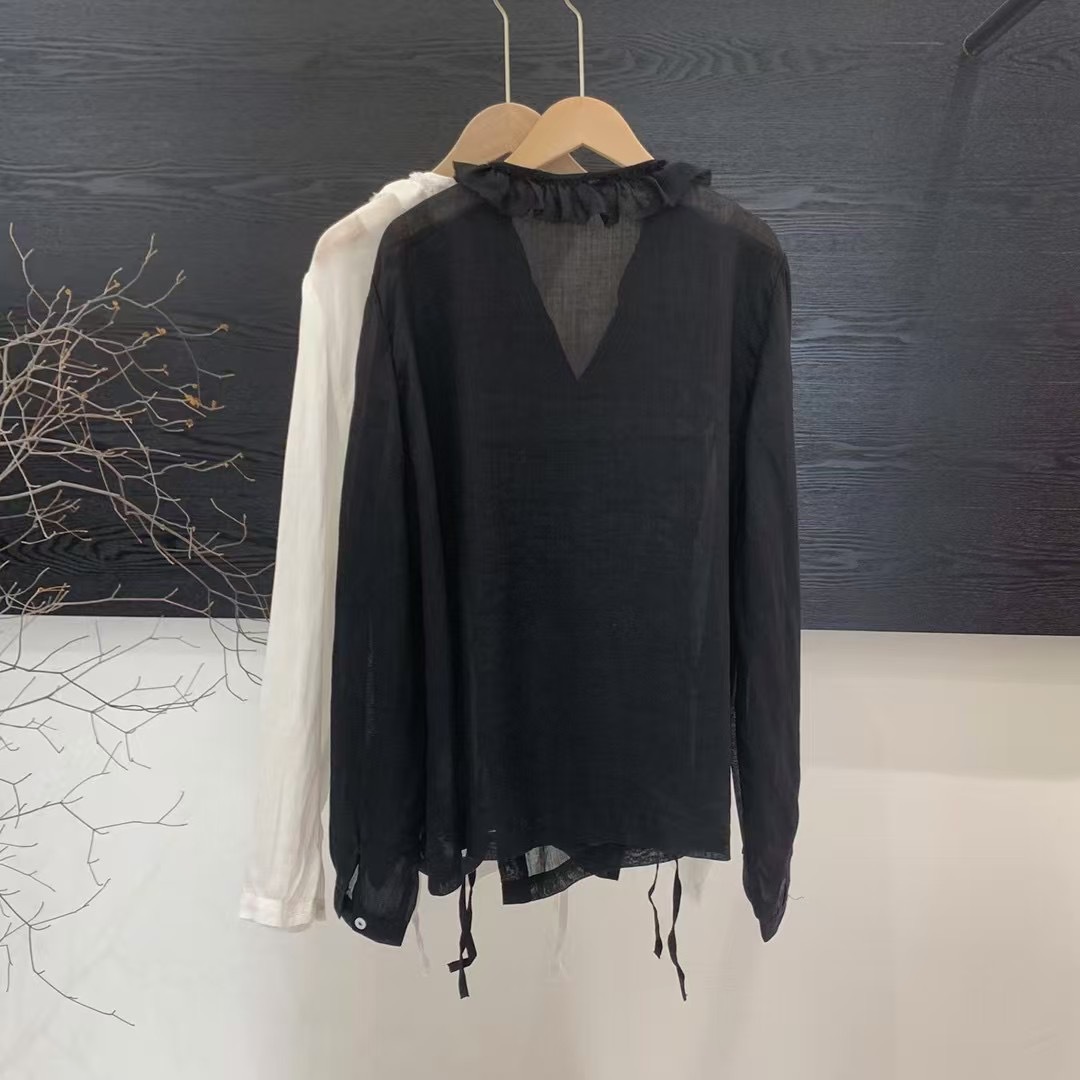 봄과 여름 새로운 핀치 주름 레이스 레이스 셔츠 예술적 여성 V 넥 슬란 트 플래켓 탑 솔리드 컬러 간단한 느슨한 작은 셔츠스토어 가기