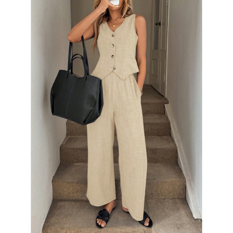 2026 아마존 해외배송 유럽 및 미국 린넨 여름 캐주얼 통근용 앞단추 조끼와 바지 세트 V넥 조끼스토어 가기