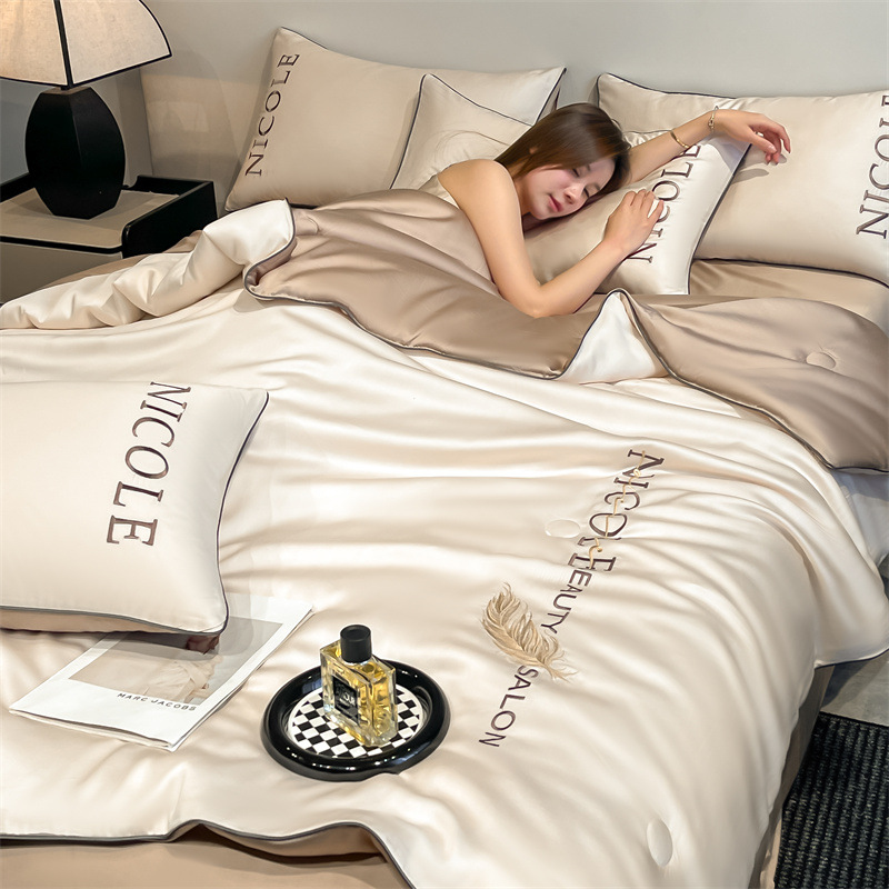 새로운 스타일 여름 수 놓은 쿨 아이스 실크 여름 이불 여름 이불 싱글 기숙사 기계 세탁기 세탁기 세척 가능한 에어컨 이불 얇은 이불