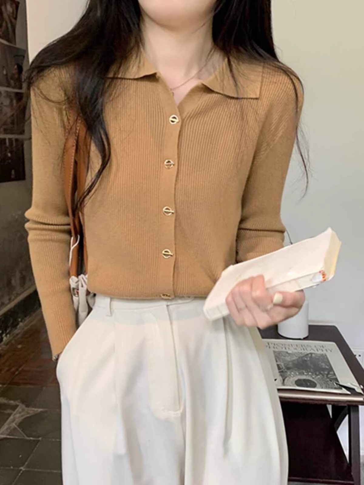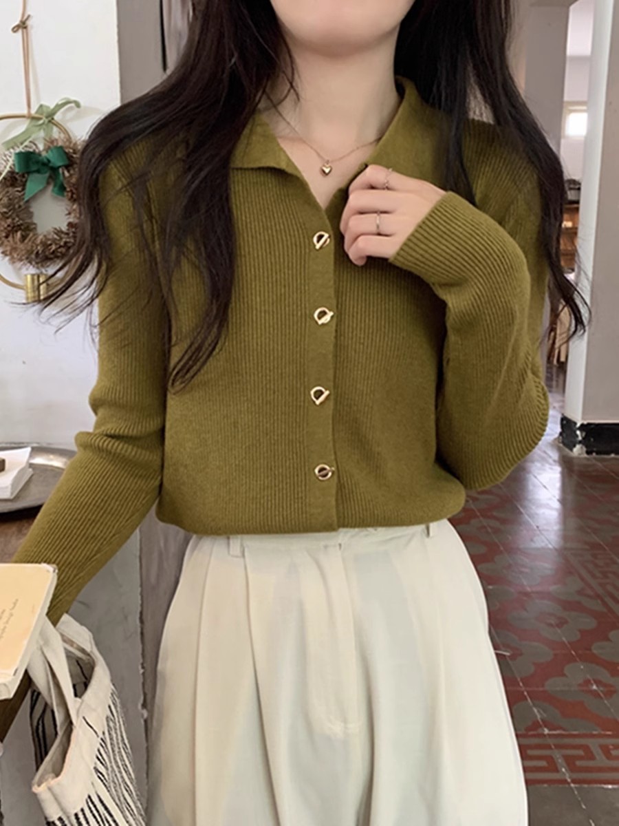 프랑스 스타일 옷깃 베이스 니트 카디건 여성 가을과 겨울 디자인 폴로 칼라 슬림 핏 탑 스웨터