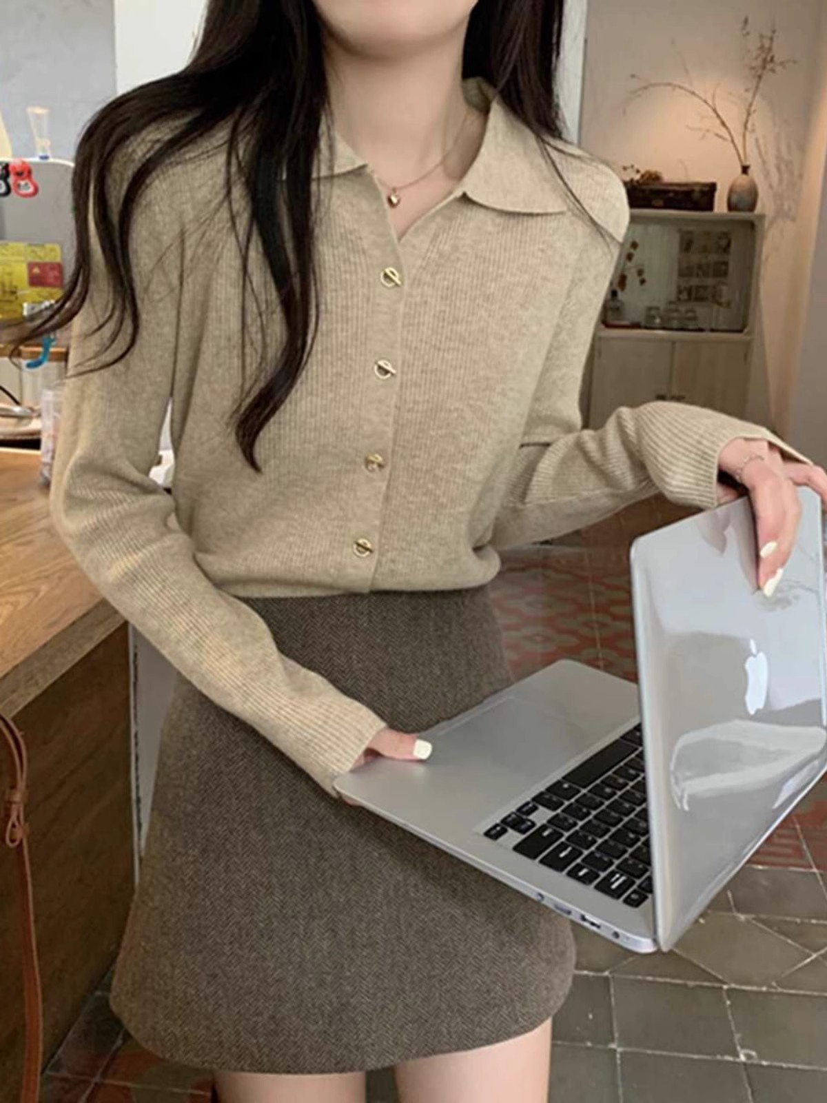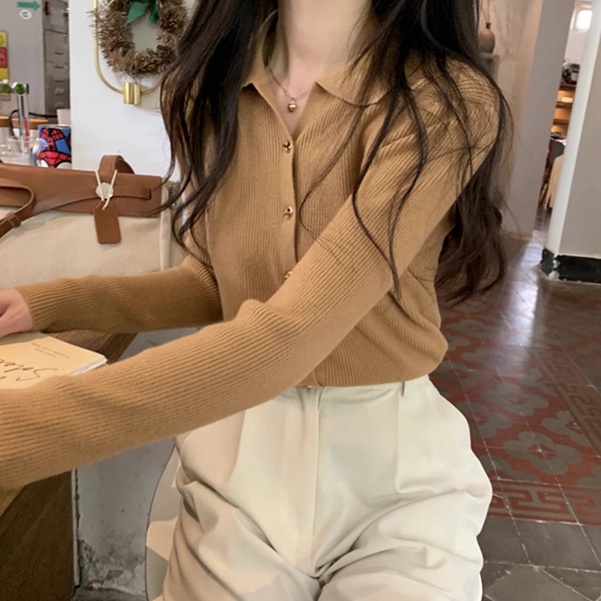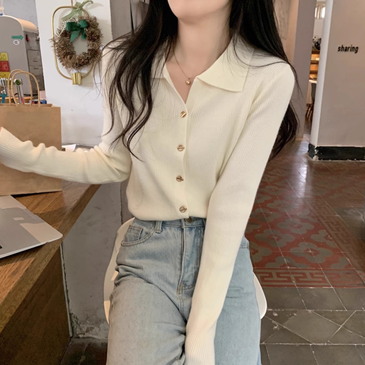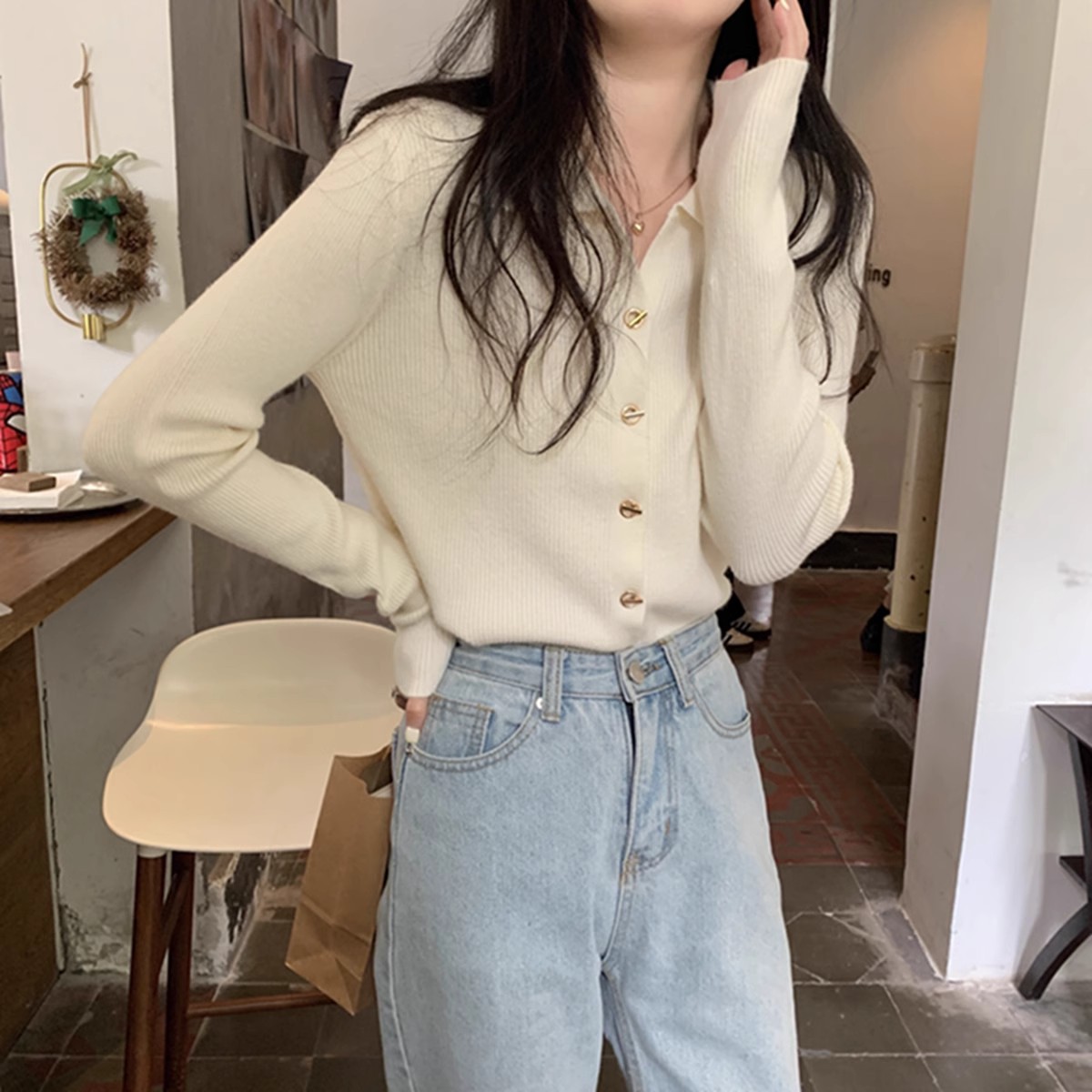 프랑스 스타일 옷깃 베이스 니트 카디건 여성 가을과 겨울 디자인 폴로 칼라 슬림 핏 탑 스웨터스토어 가기