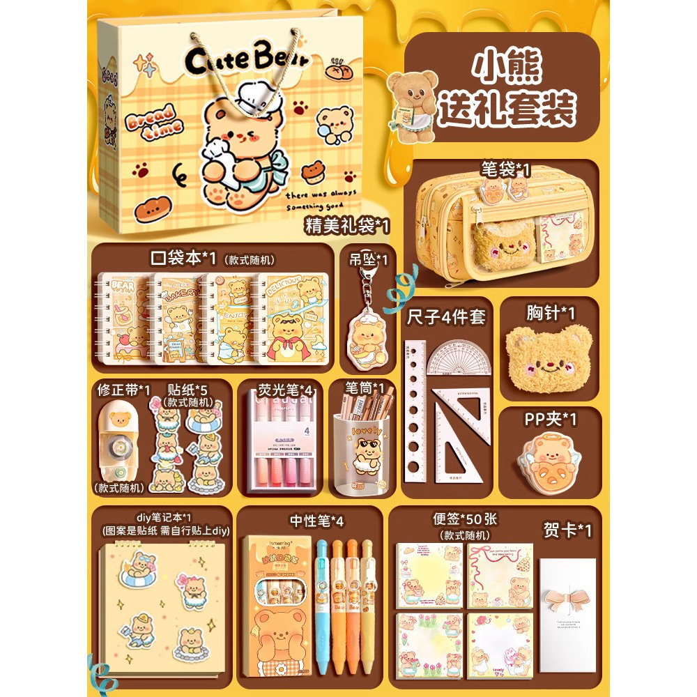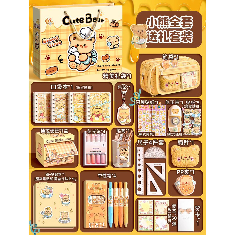 • [핫셀 추천] 9단 곰_선물가방 + 봉제 브로치 1개 + 스티커 5개 + PP 클립 + 펜던트 + 메모장 4개 + 젤펜 4개 + 수정테이프 1개 + 자 세트
