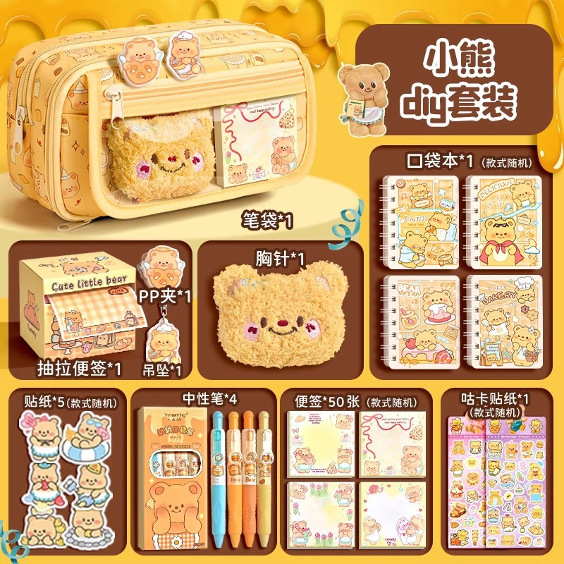 • [치즈베어 DIY 세트] 9단 필통 + 곰인형 1개 + PP클립 1개 + 열쇠고리 1개 + 스티커 5개 + 구카 스티커 1개 + 젤펜 4개 + 메모장