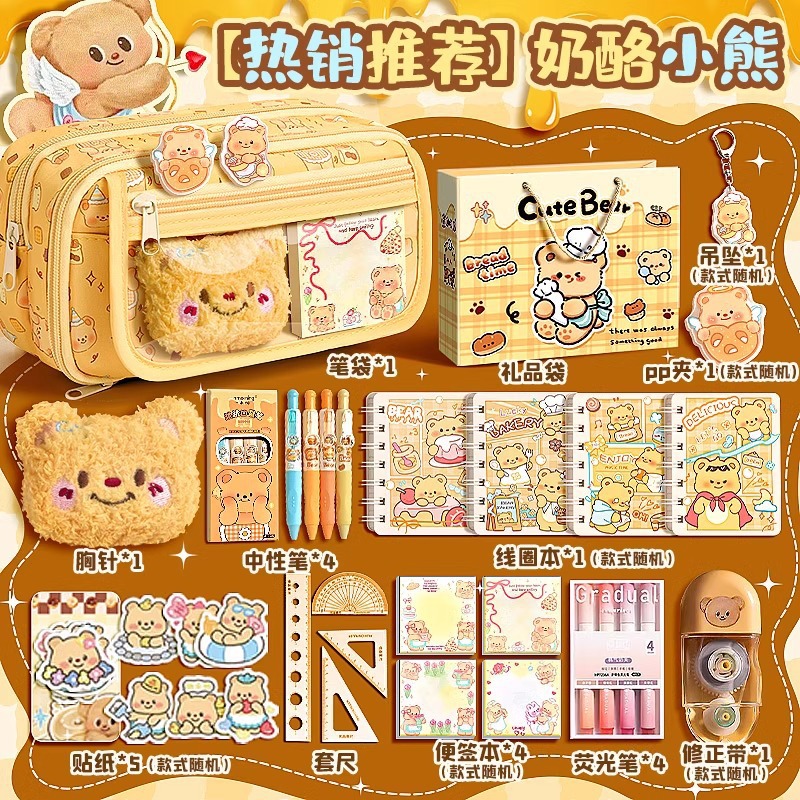 • [치즈베어 선물세트] 9단 필통 + 선물가방 + 곰인형 1개 + PP클립 1개 + 열쇠고리 1개 + 스티커 5개 + 젤펜 4개 + 메모장 50장