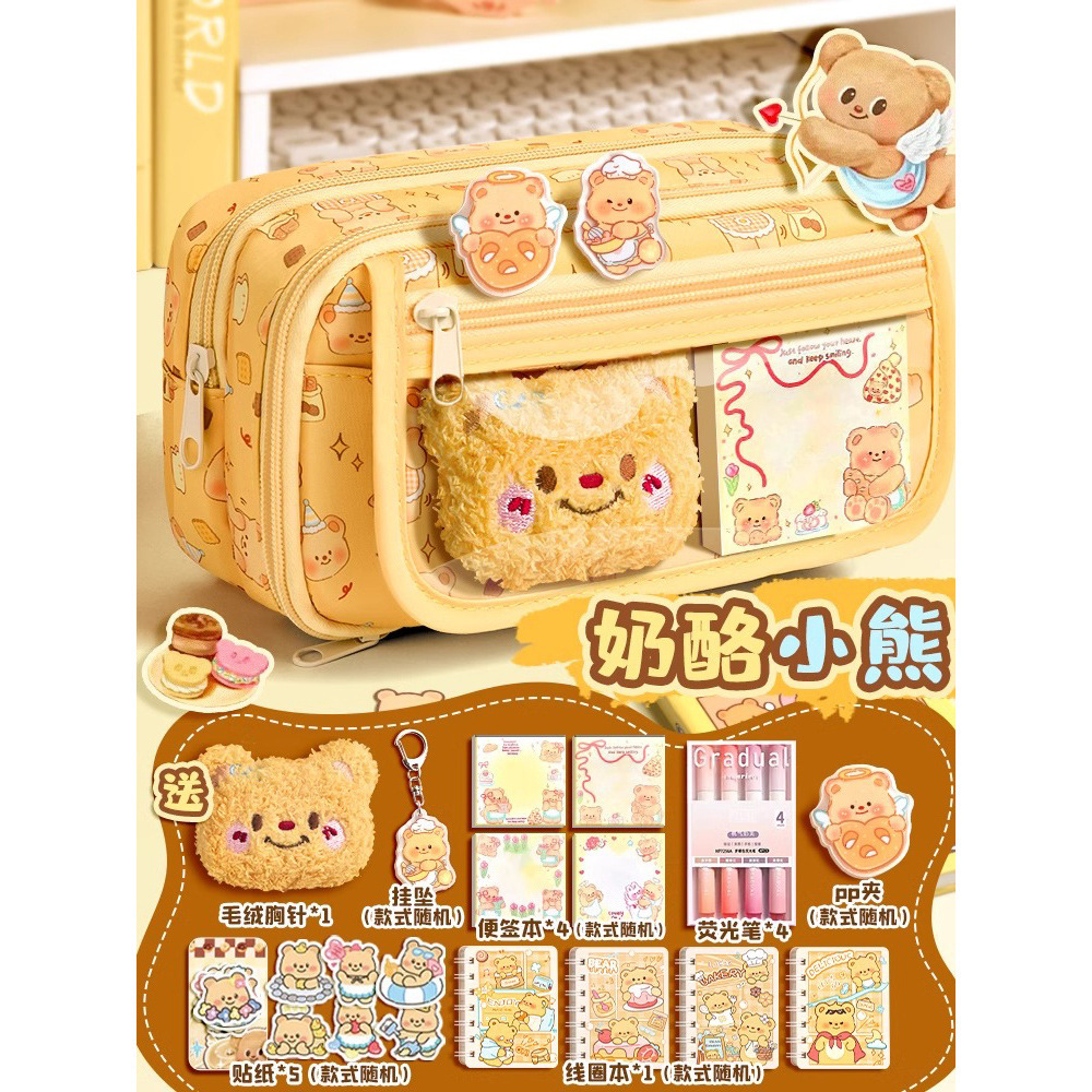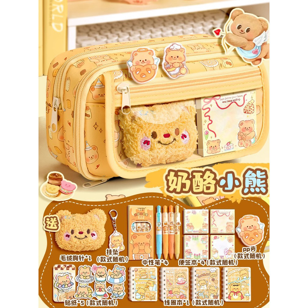 • [치즈베어 추천세트] 9단 필통 + 곰인형 1개 + PP클립 1개 + 키체인 1개 + 스티커 5개 + 젤펜 4개 + 메모장 200장 + 코일