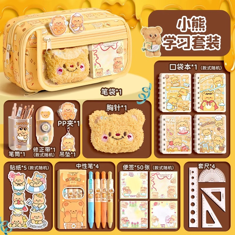 • [치즈베어 학습세트] 9단 필통 + 곰인형 1개 + PP클립 1개 + 열쇠고리 1개 + 스티커 5개 + 젤펜 4개 + 메모장 50개 + 코일북