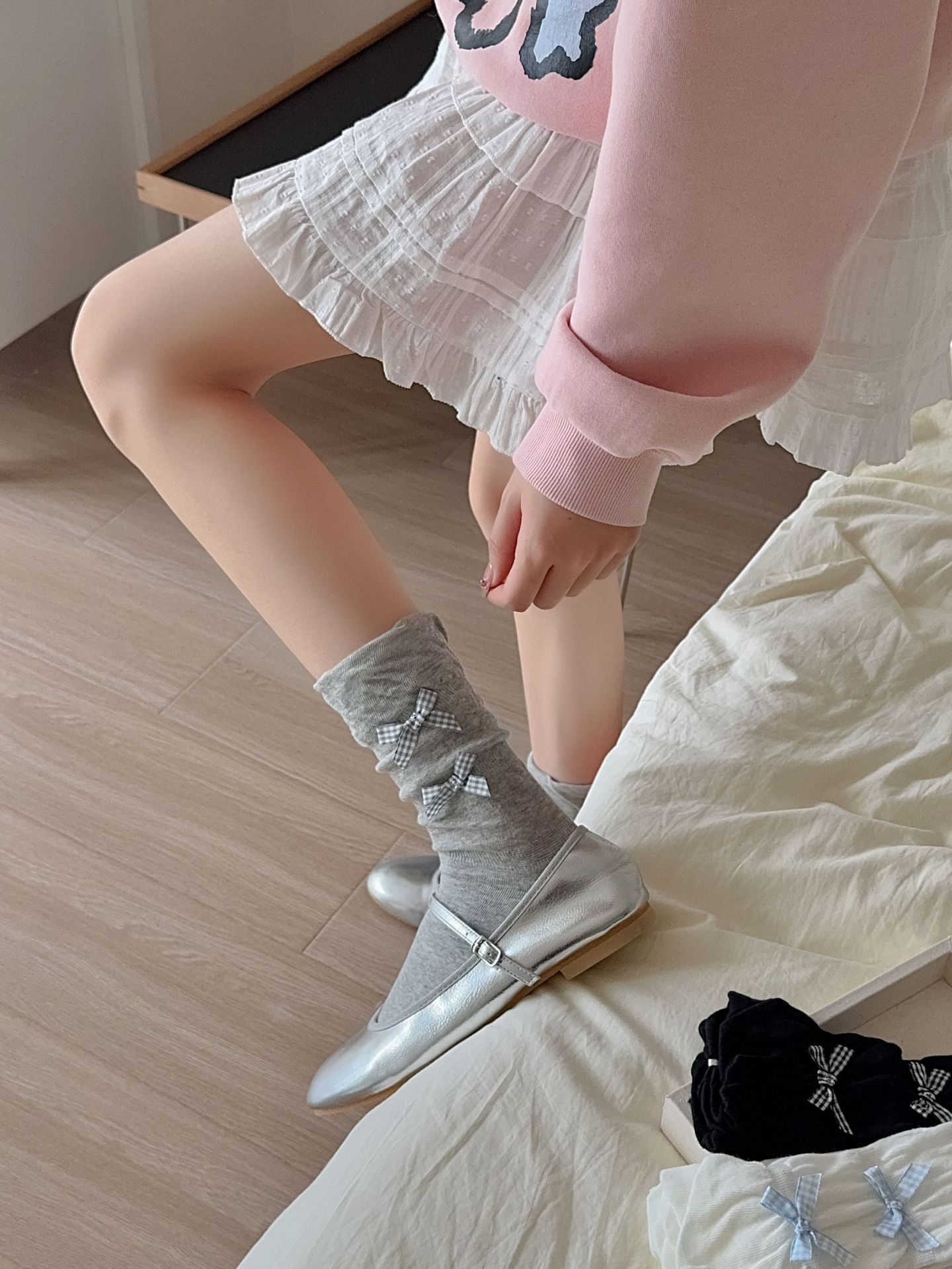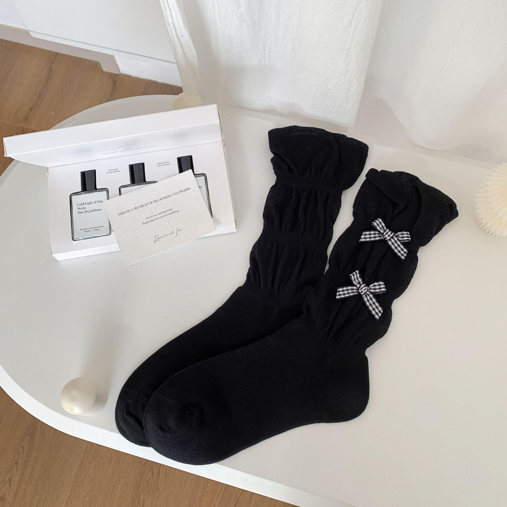 한국 인치 격자 무늬 작은 활 리본 솔리드 컬러 레이스 어린이를위한 미드 튜브 스택 양말 귀여운 로리타 양말