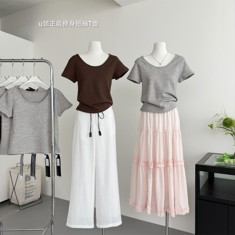 히비스커스 한국 단순 슬리밍 반팔 티셔츠 2025 봄 통근 올 매치 솔리드 컬러 숄더 탑 여성 베이직스토어 가기