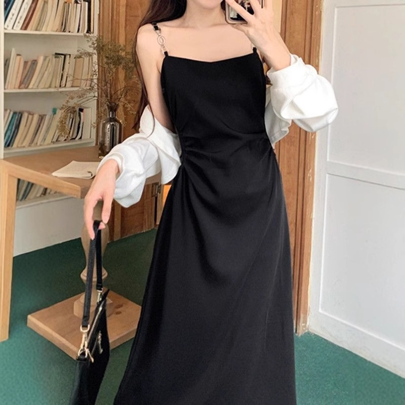 프랑스 디자인 센스 블랙 힙 중간 길이 2025 여름 새로운 슬림 핏 슬리밍 타이트 허리 스트랩 원피스스토어 가기