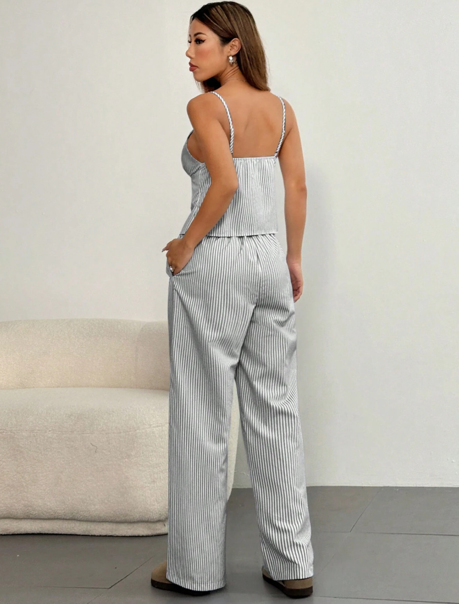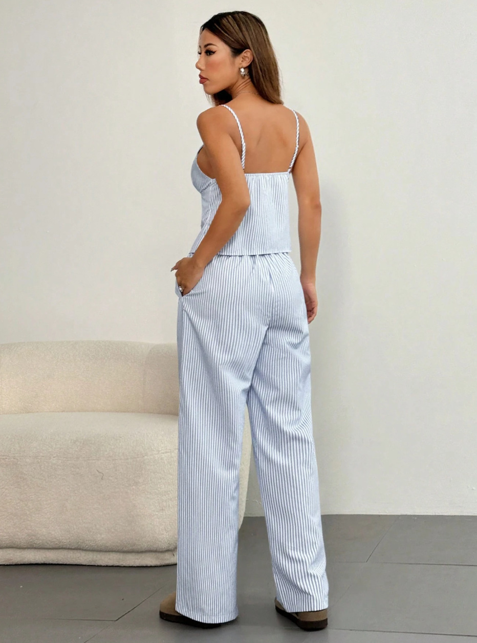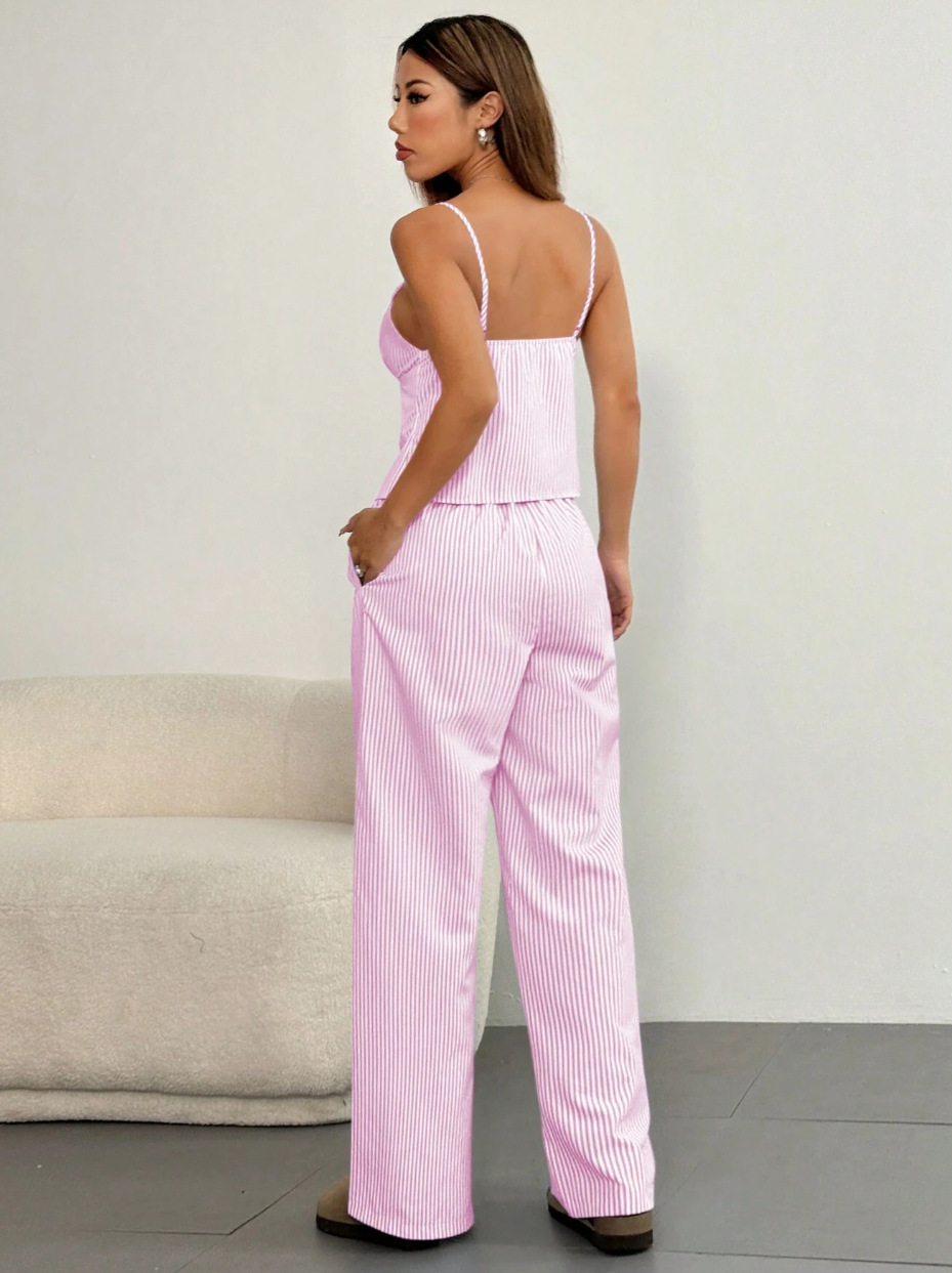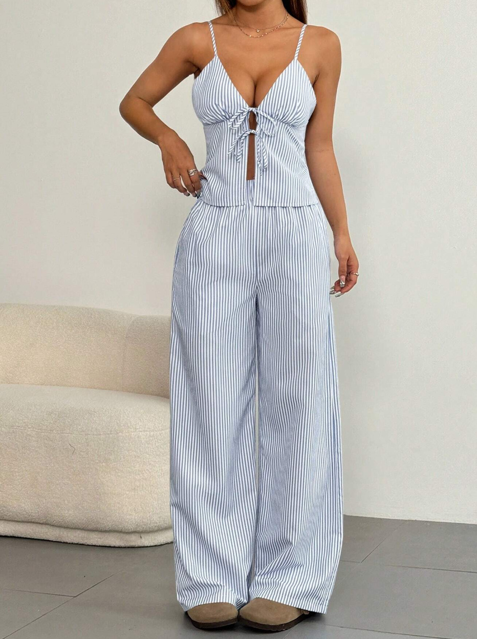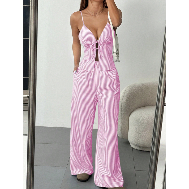 유럽과 미국의 국경 간 아마존 여성 투피스 여성 여름 패션 스트라이프 타이 슬링과 넓은 다리 바지스토어 가기