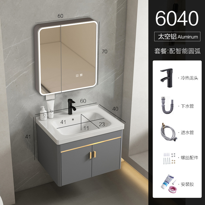 • 회색 평면 세면대 캐비닛 60개 전체 세트 + 스마트 아크 거울 캐비닛 [폭 40] 뷰티 + 조명