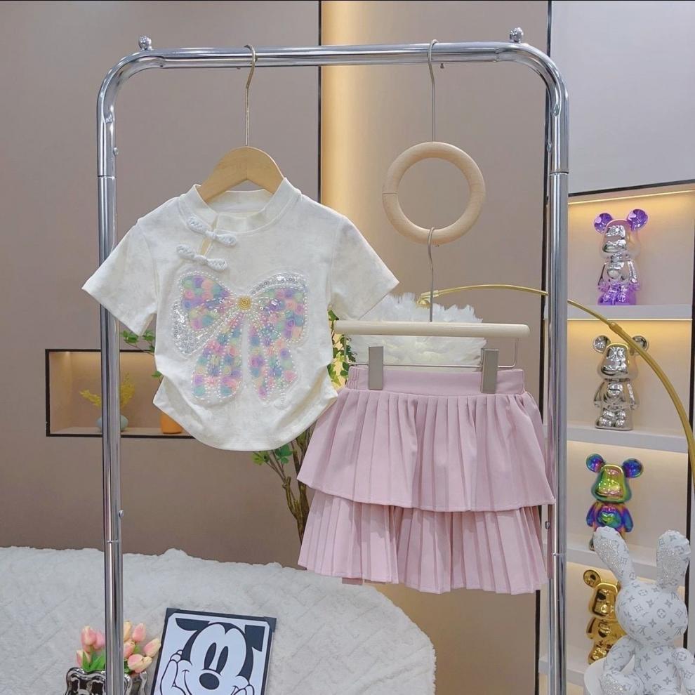 소녀의 새로운 중국 나비 세트 2025 새로운 여름 어린이 공주 스타일 짧은 소매 세련된 주름 치마 투피스 세트