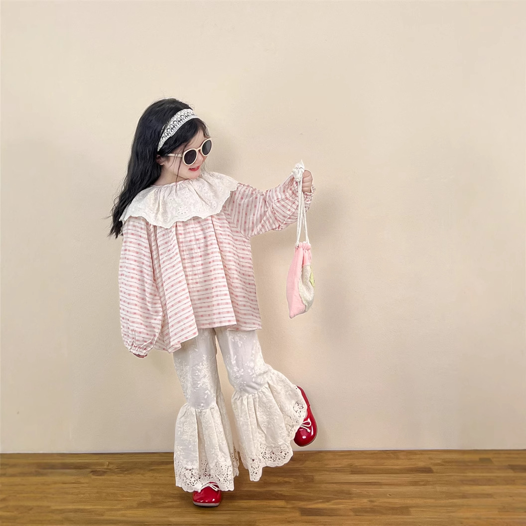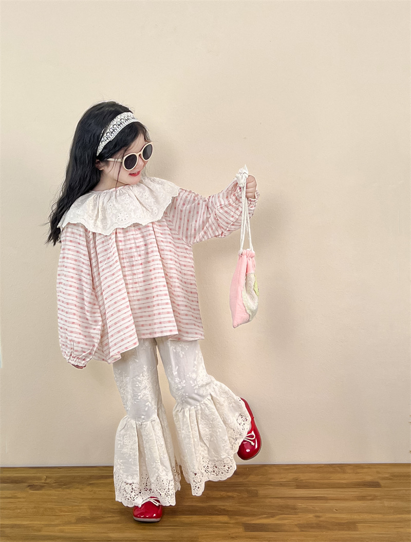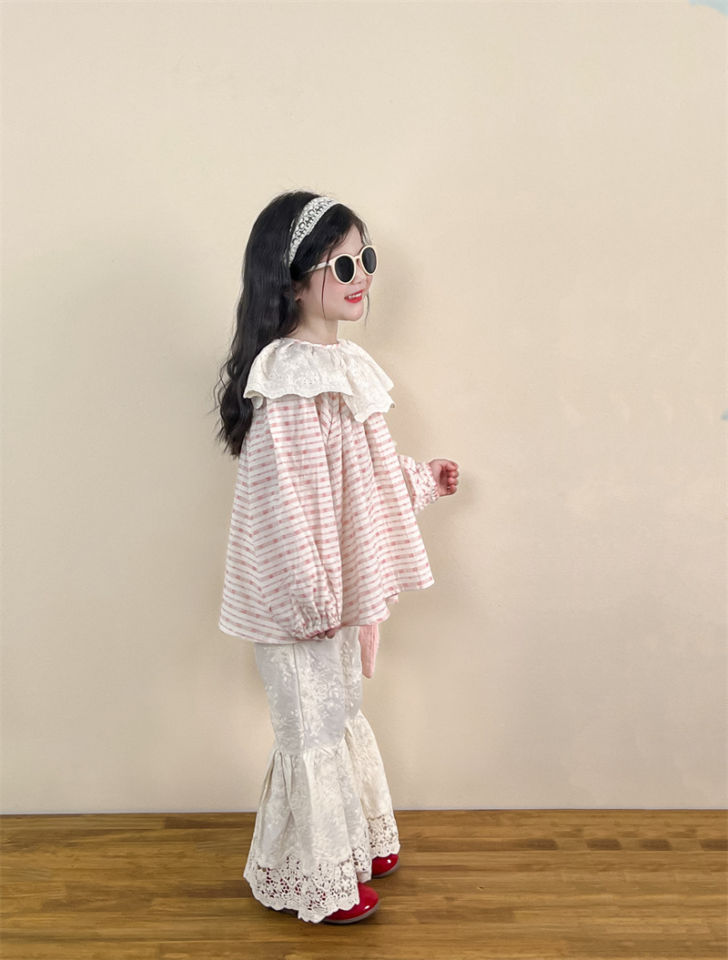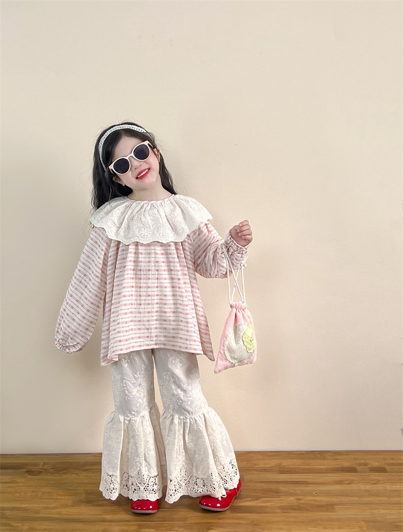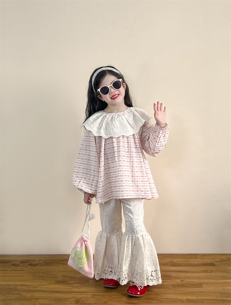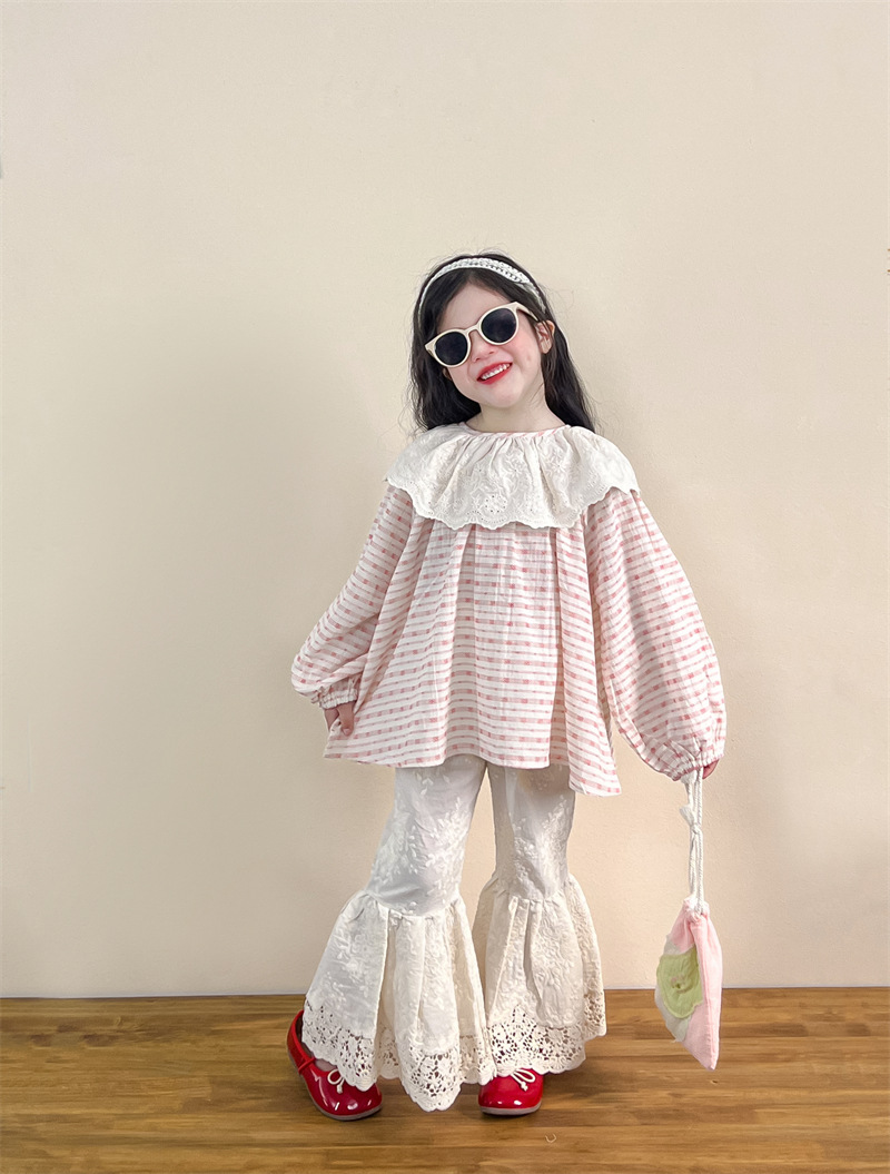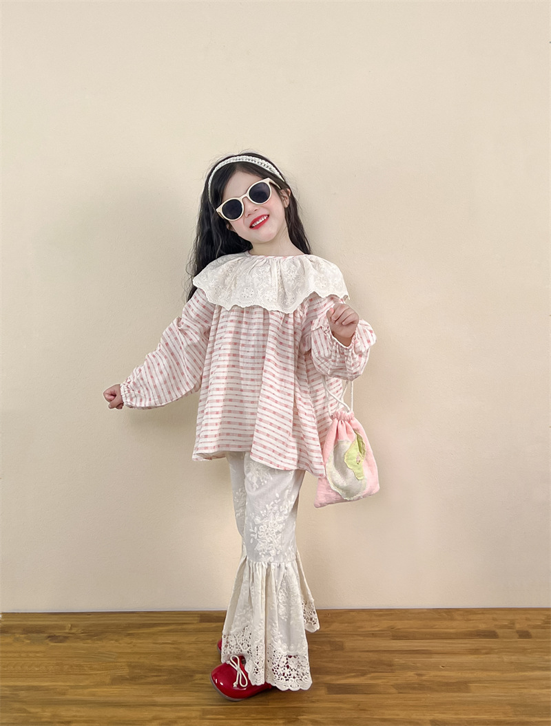 한국 스타일 소녀의 모리 루즈 핑크 크로 셰 뜨개질 레이스 인형 셔츠 레이스 플래 바지 세트 샷