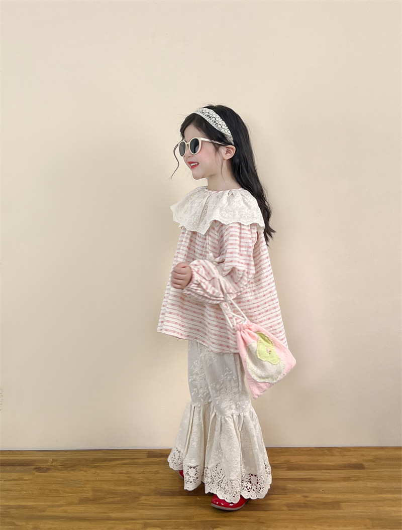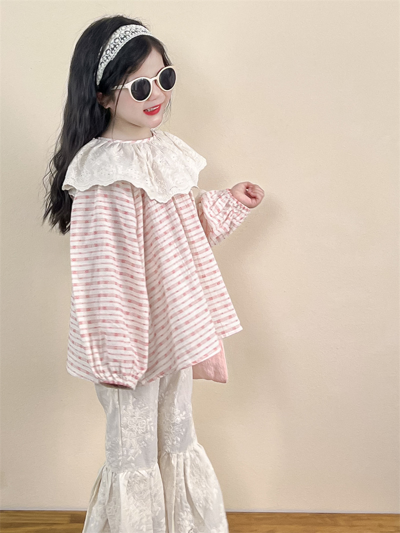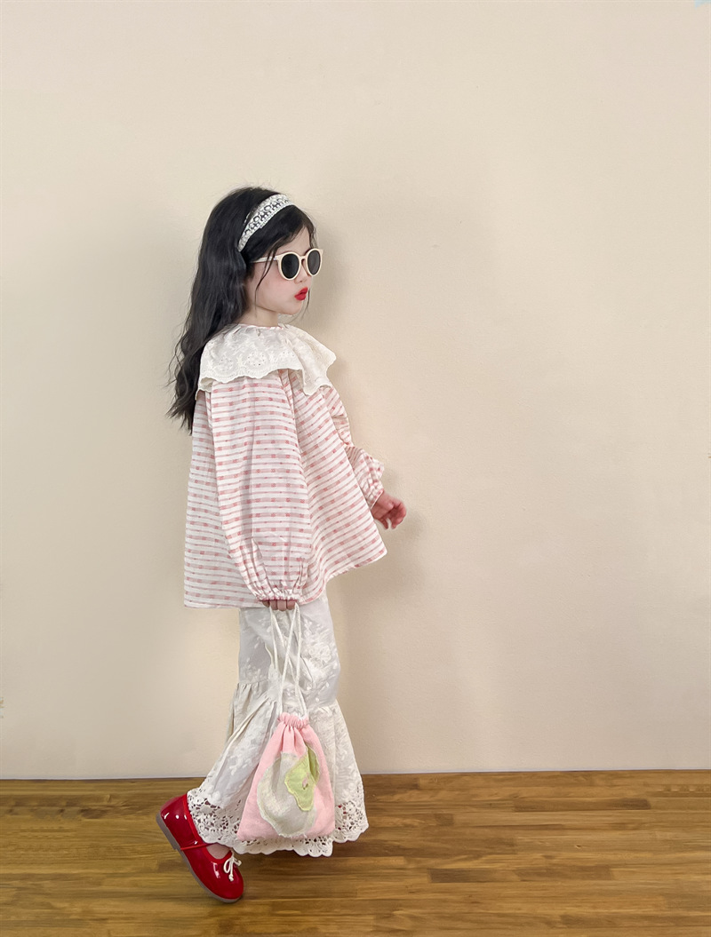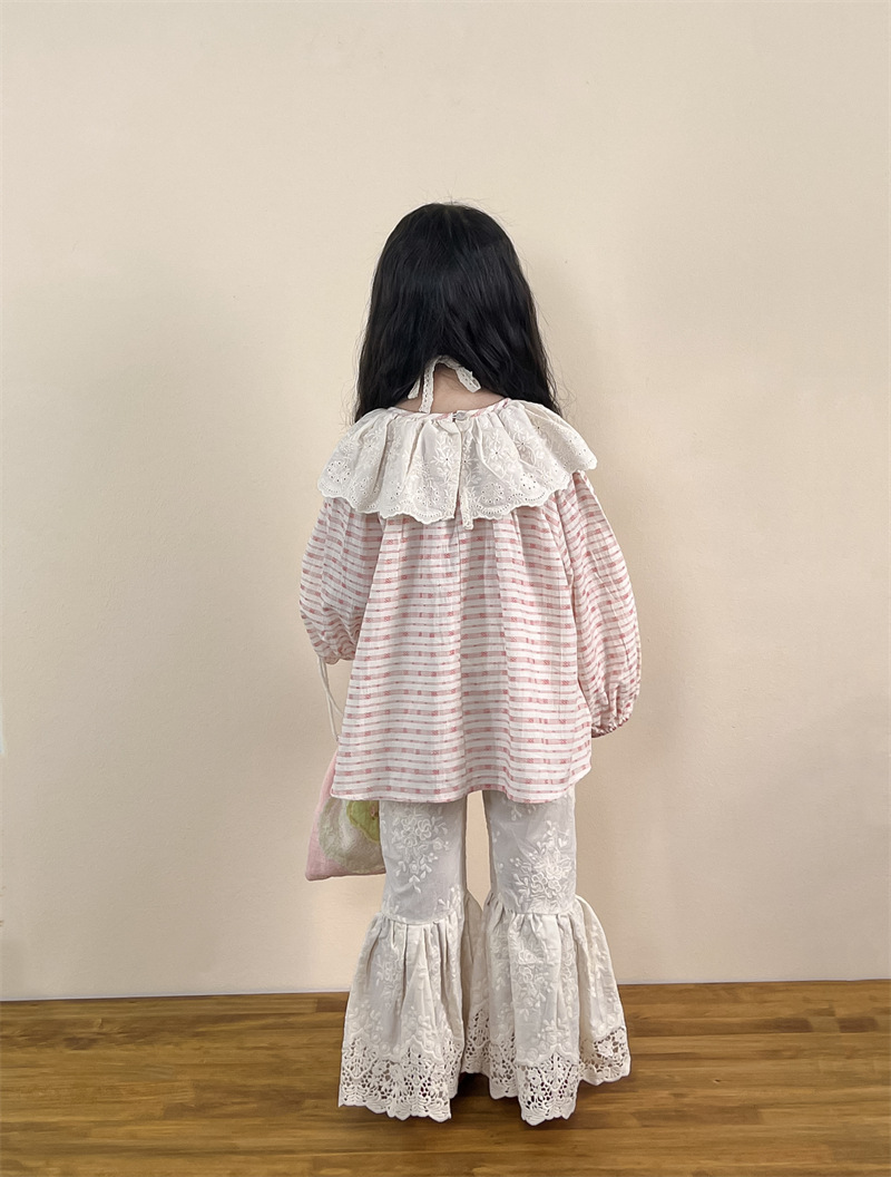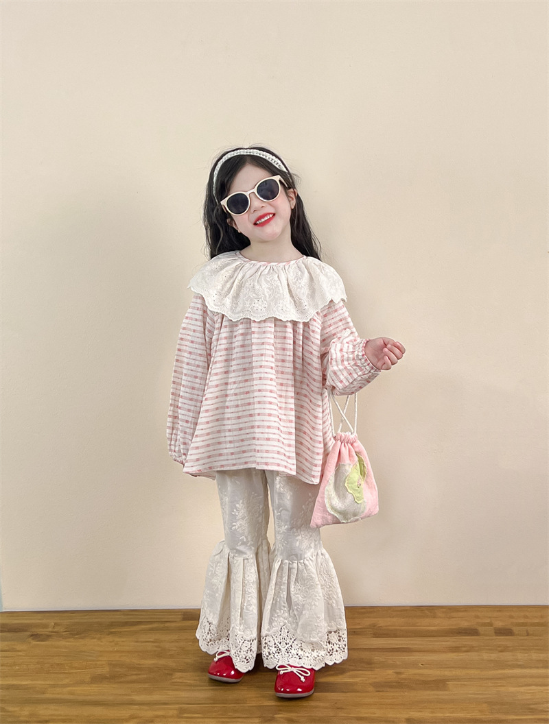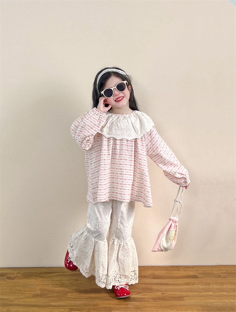 한국 스타일 소녀의 모리 루즈 핑크 크로 셰 뜨개질 레이스 인형 셔츠 레이스 플래 바지 세트 샷