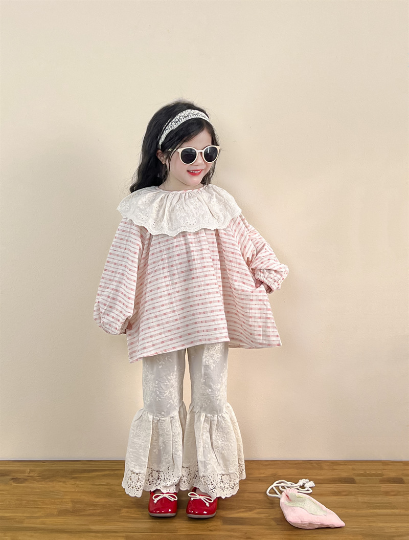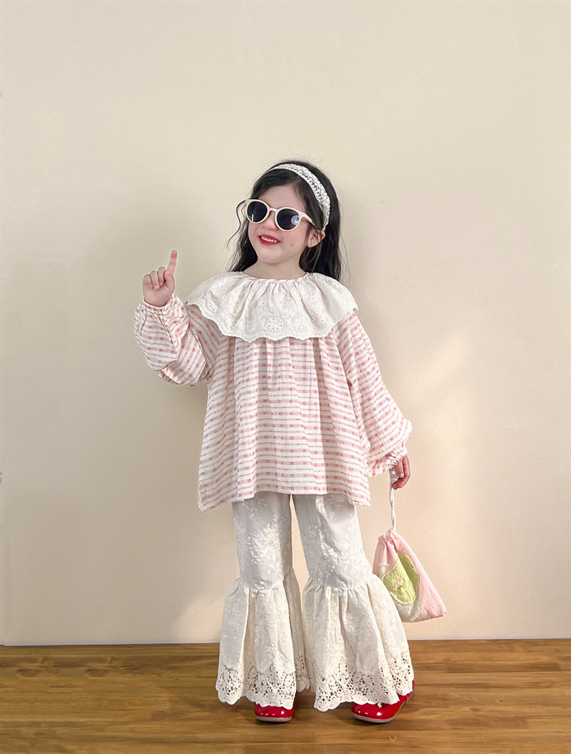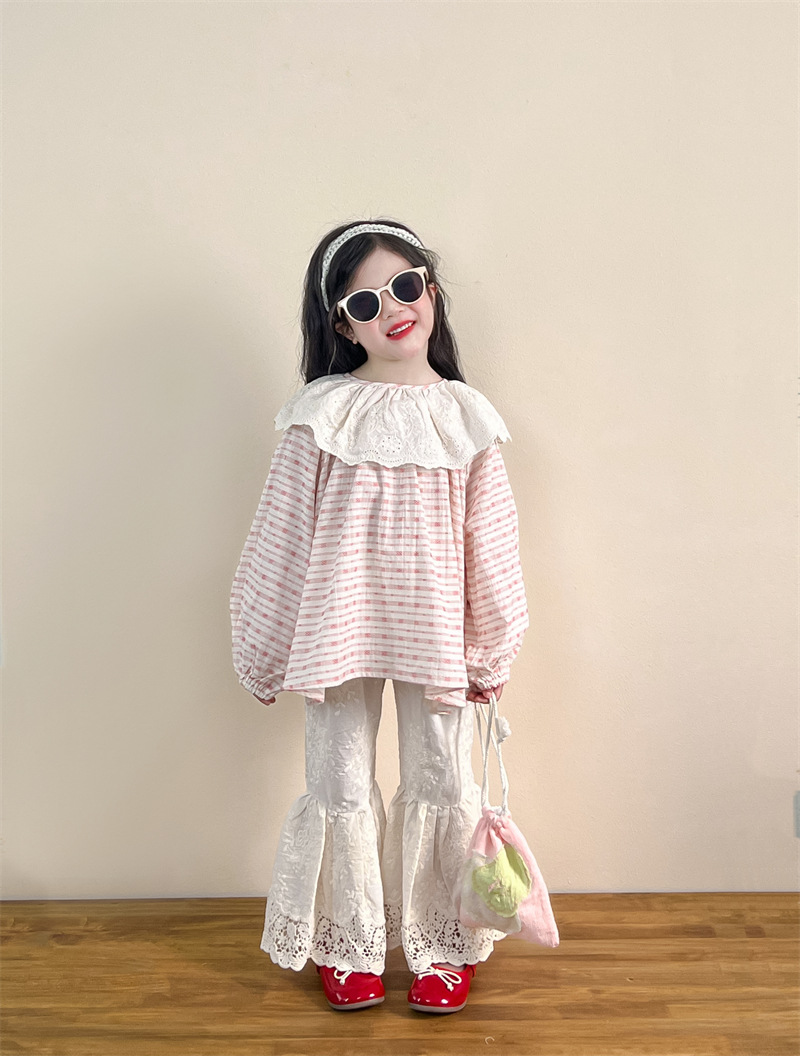 한국 스타일 소녀의 모리 루즈 핑크 크로 셰 뜨개질 레이스 인형 셔츠 레이스 플래 바지 세트 샷스토어 가기