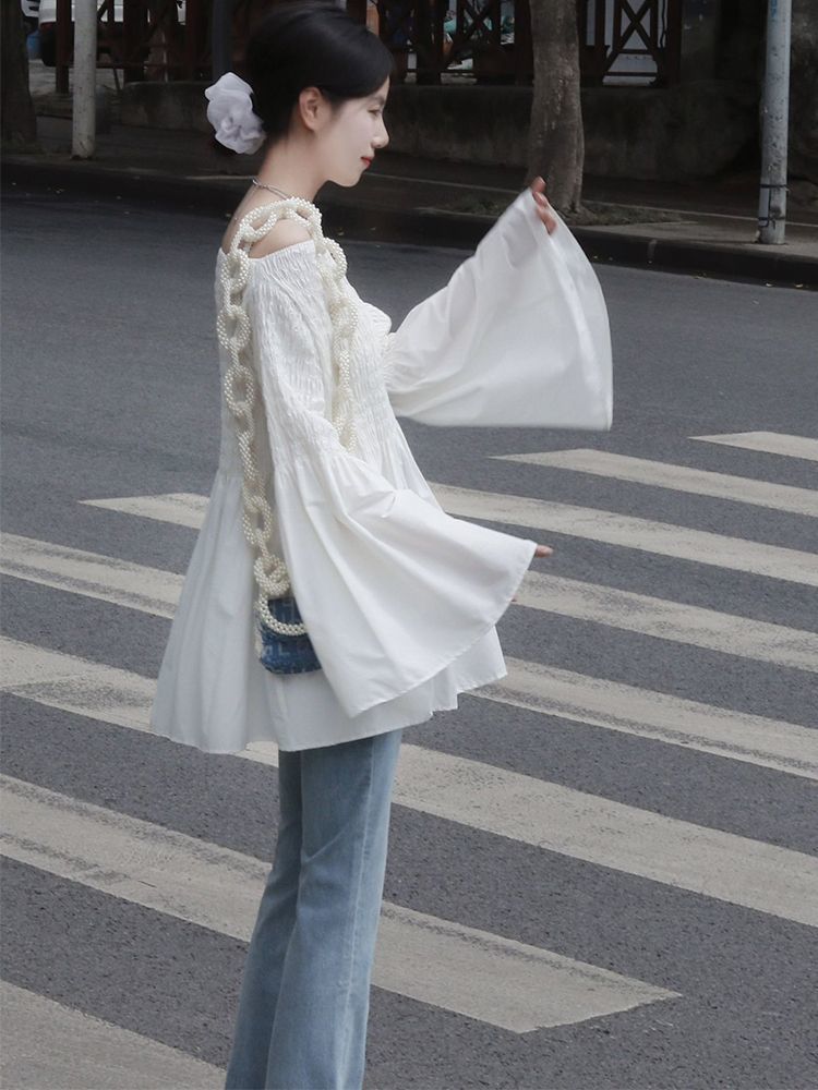 • 투피스 세트 [청바지+플리츠 바토 칼라 셔츠]
