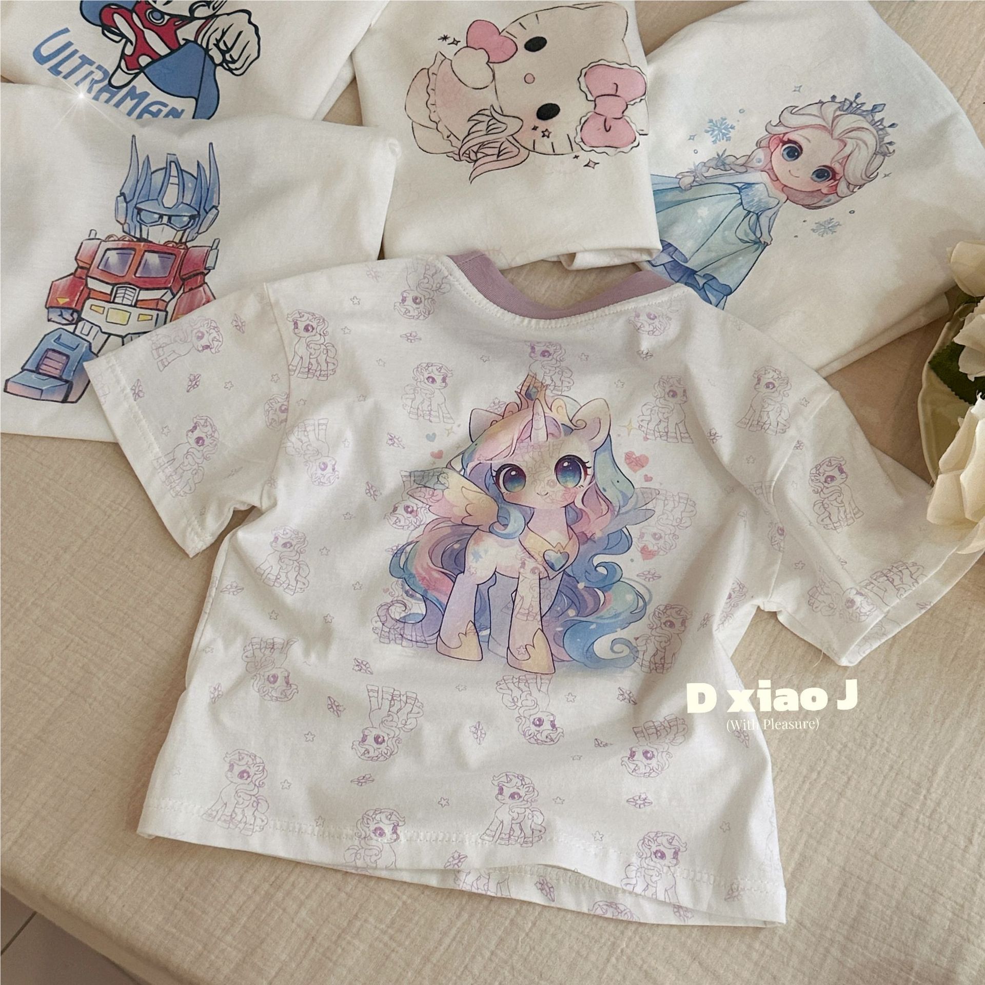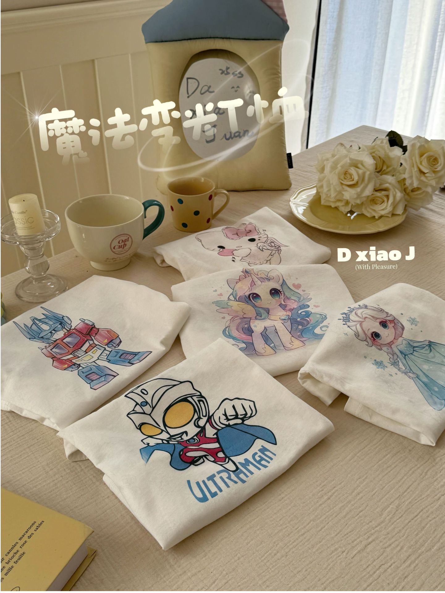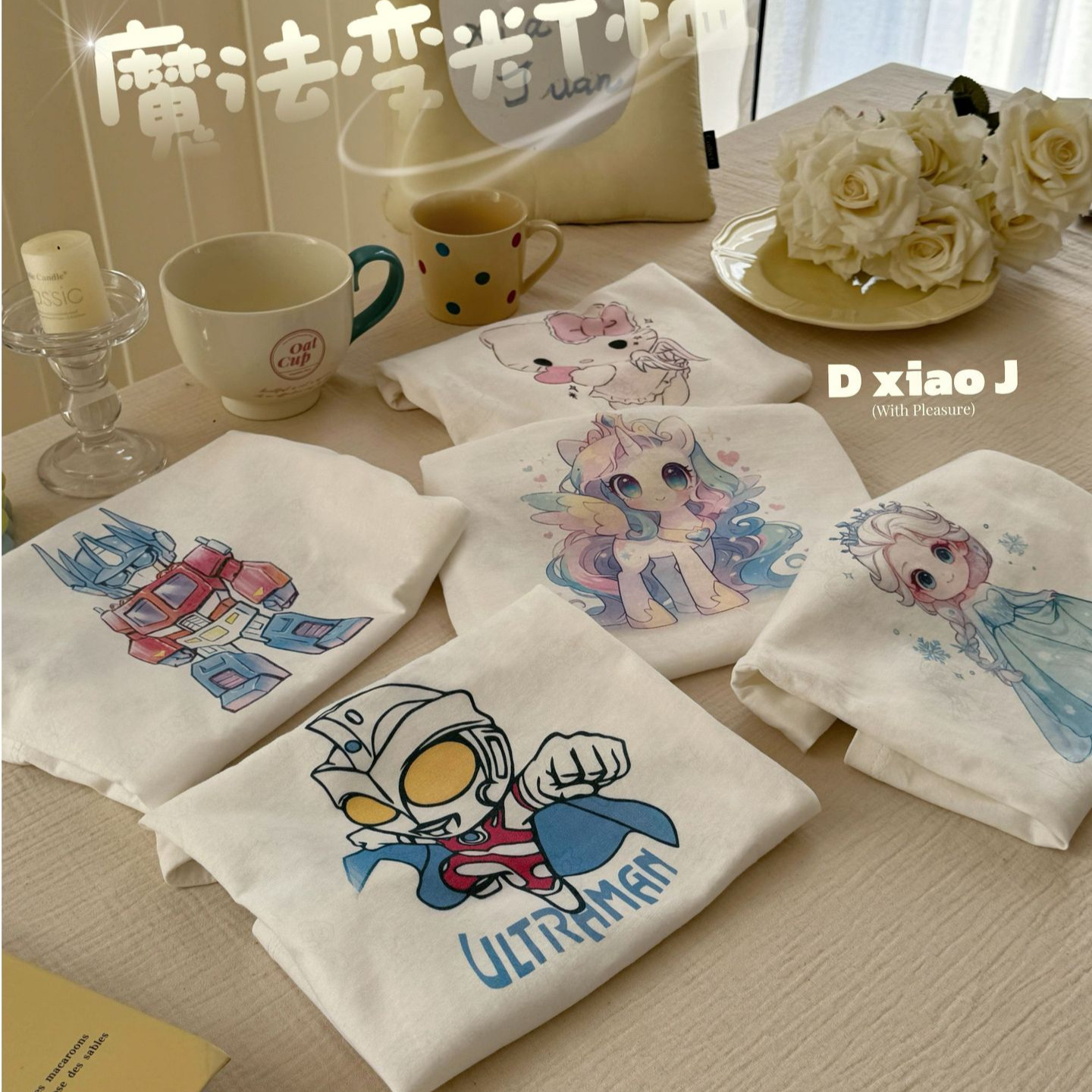 스팟 사이즈 롤 25 새로운 여름 스타일 소년 소녀 의류 마법의 빛 변화 어린이 만화 반팔 티셔츠 탑
