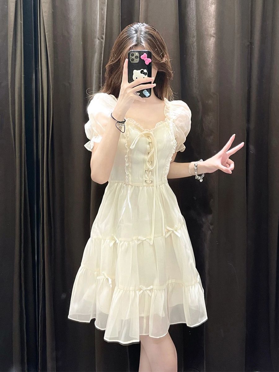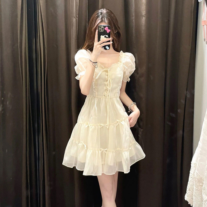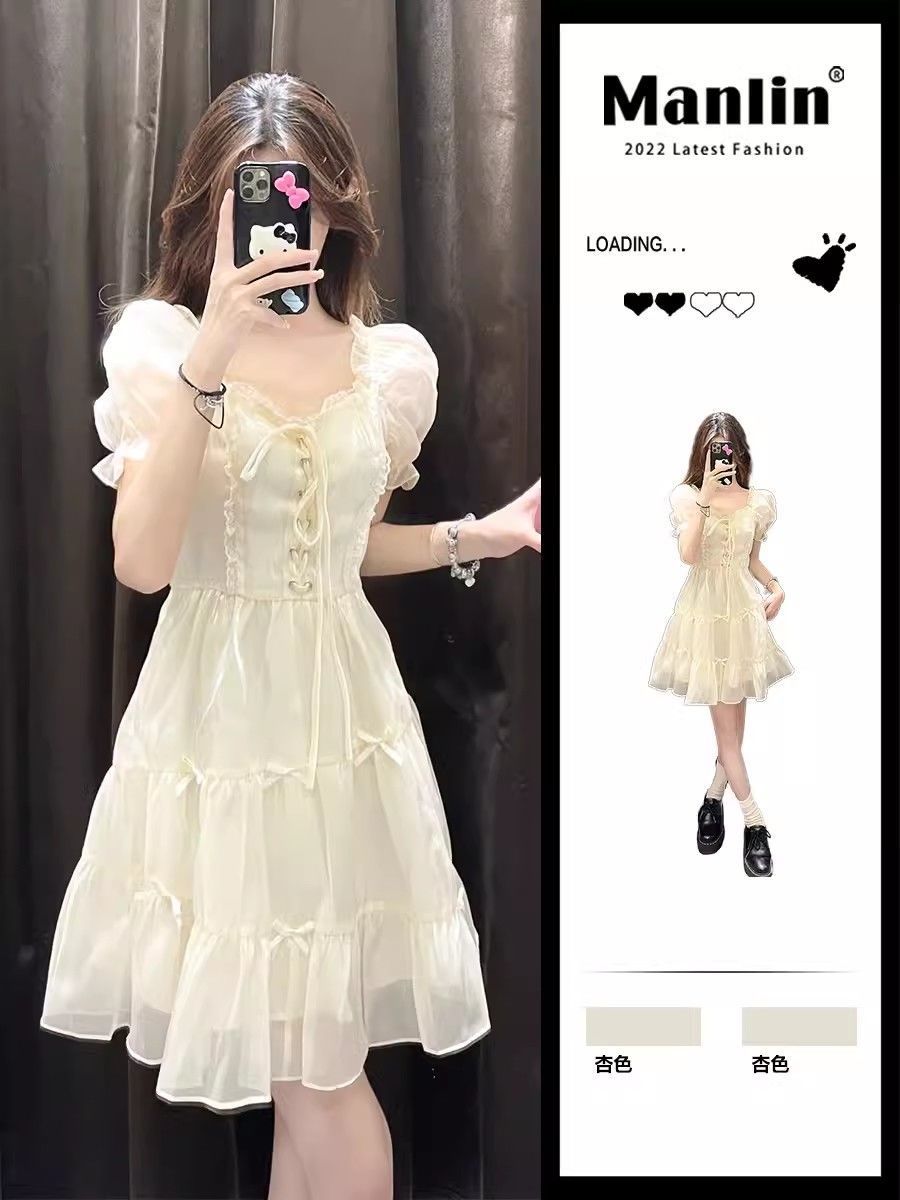 프랑스 스타일 우아한 아름다운 공주 원피스 작은 하이 엔드 긴장된 허리 슬림 살구색 꽃 원피스 여성의 봄과 여름스토어 가기
