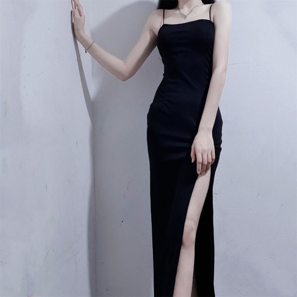 뜨거운 소녀 우아한 백리스 스트랩 원피스 여성의 2025 새로운 순수 분할 허리 슬리밍 블랙 롱 원피스스토어 가기