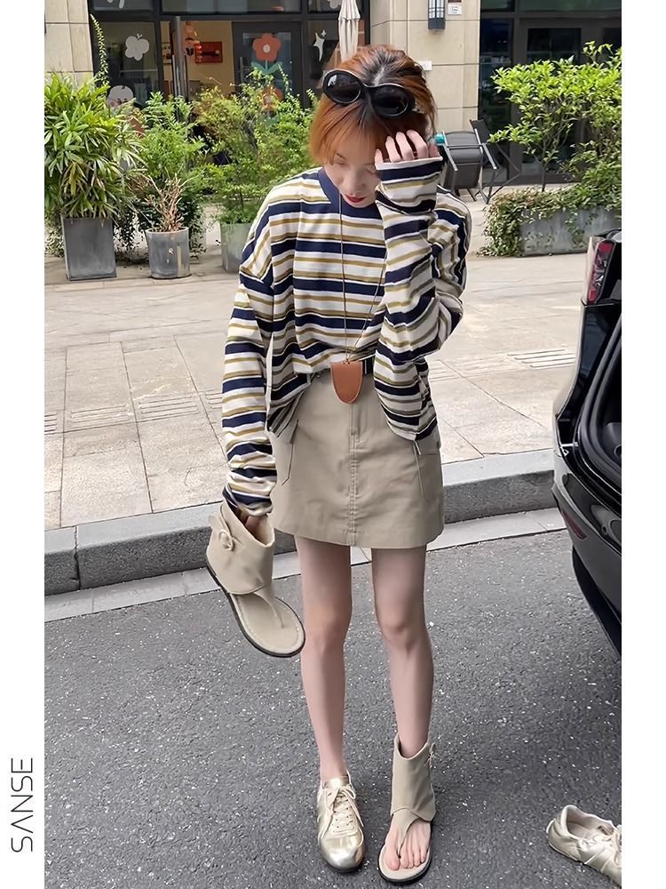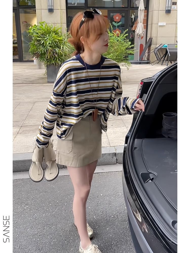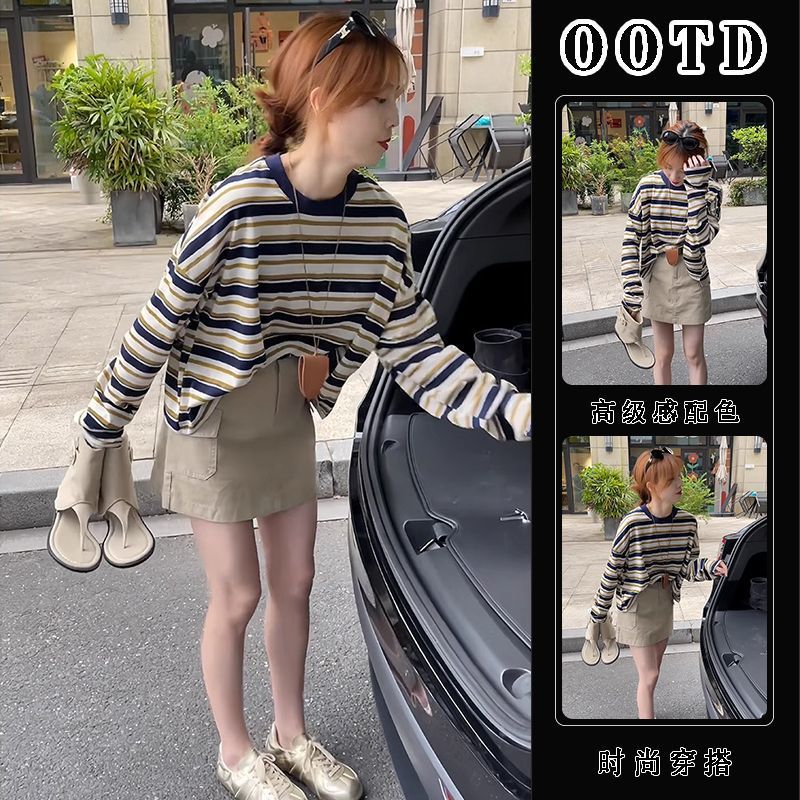 나이를 줄이는 여름 줄무늬 선 스크린 긴 소매 티셔츠 세트 스커트 튀김 거리 연령 감소 패션 세트스토어 가기