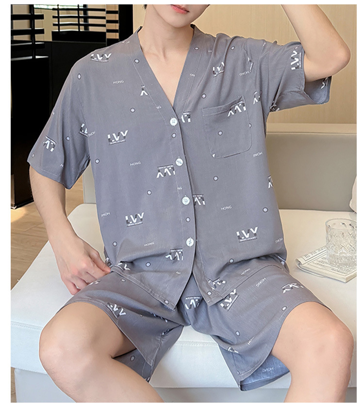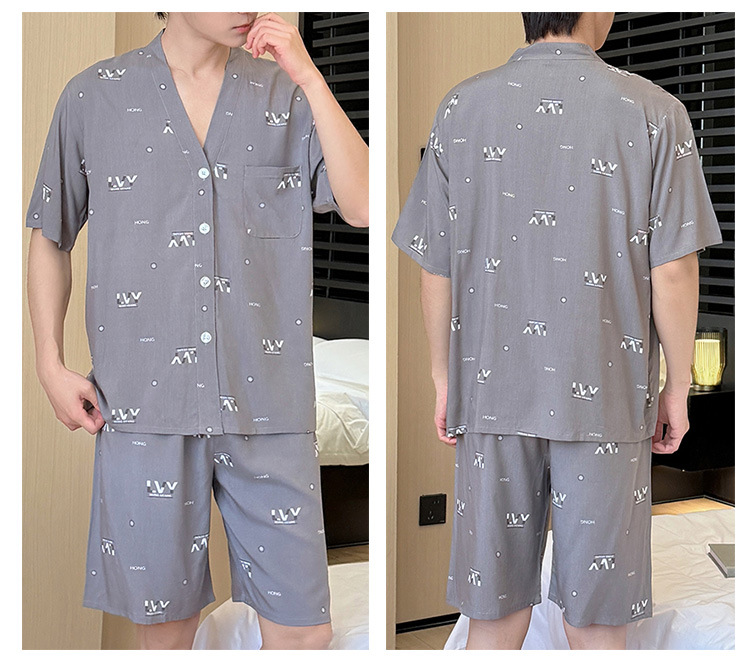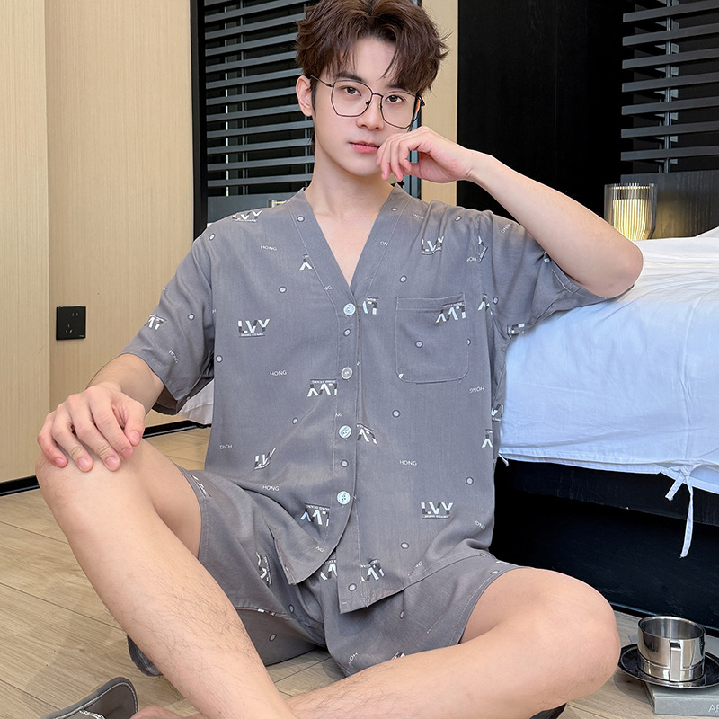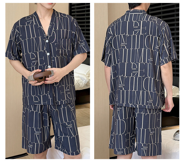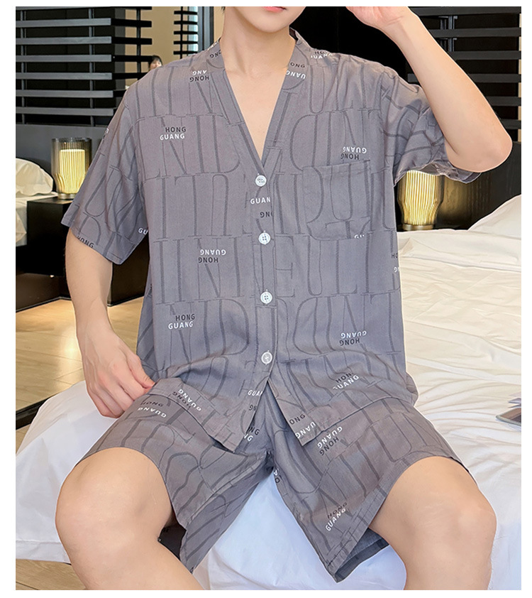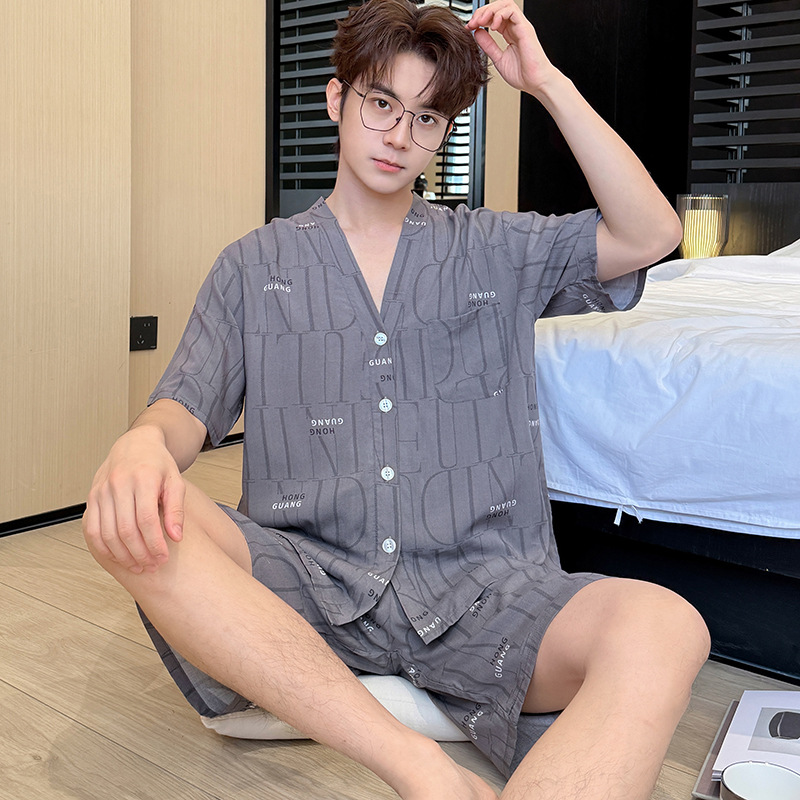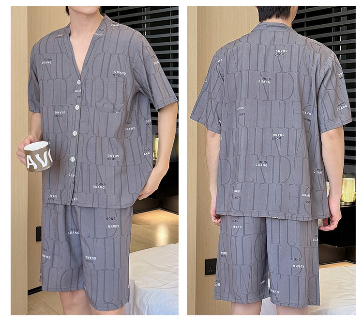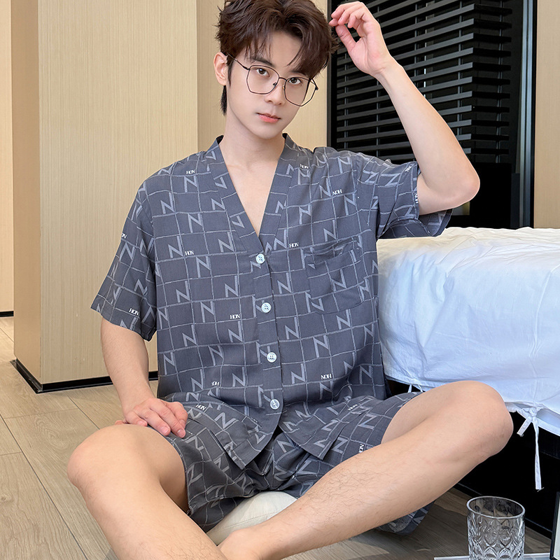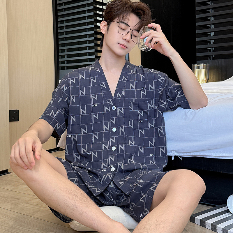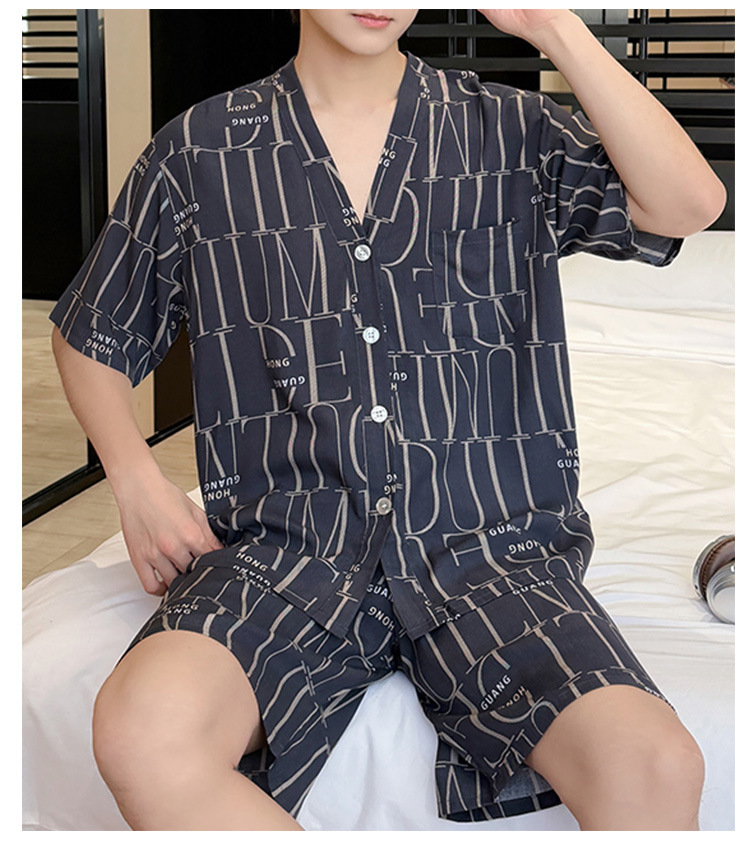 잠옷 남성용 봄과 여름 얇은 반팔 바지 느슨한 카디건 세트 홈 옷 남성용 격자 무늬 외부 잠옷 착용
