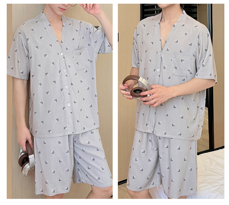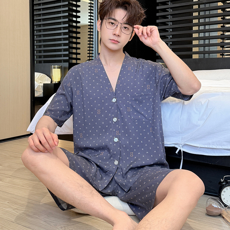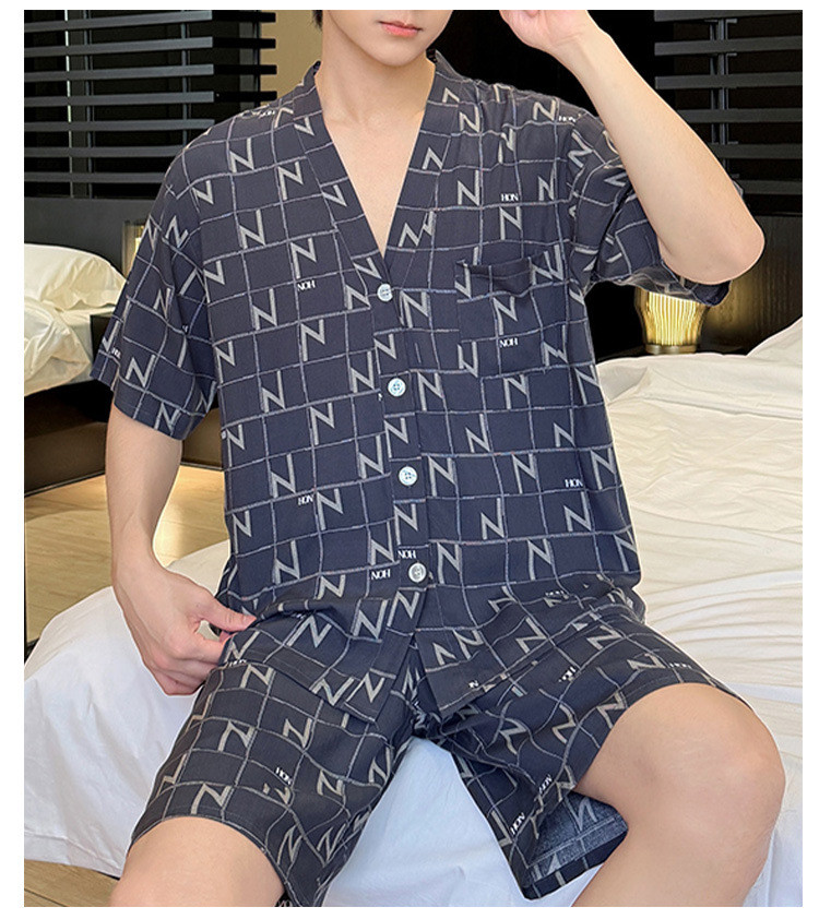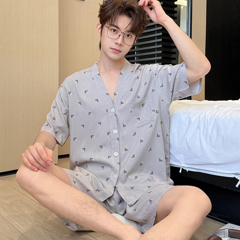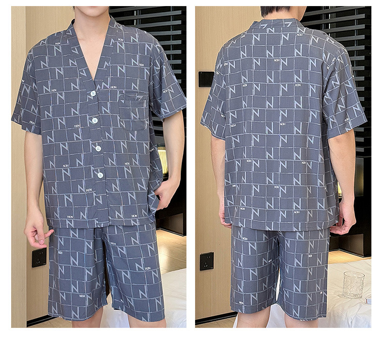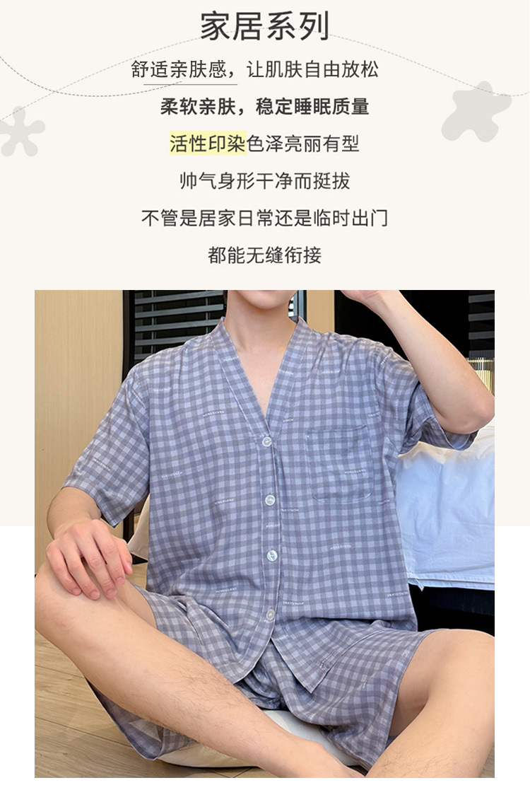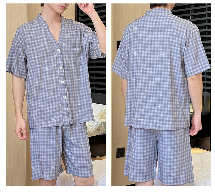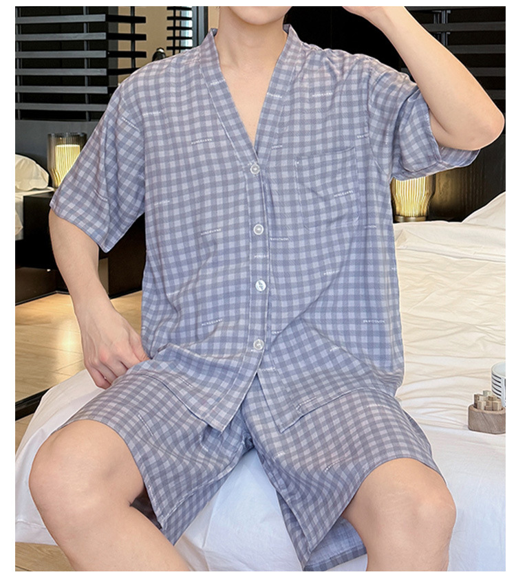 잠옷 남성용 봄과 여름 얇은 반팔 바지 느슨한 카디건 세트 홈 옷 남성용 격자 무늬 외부 잠옷 착용스토어 가기