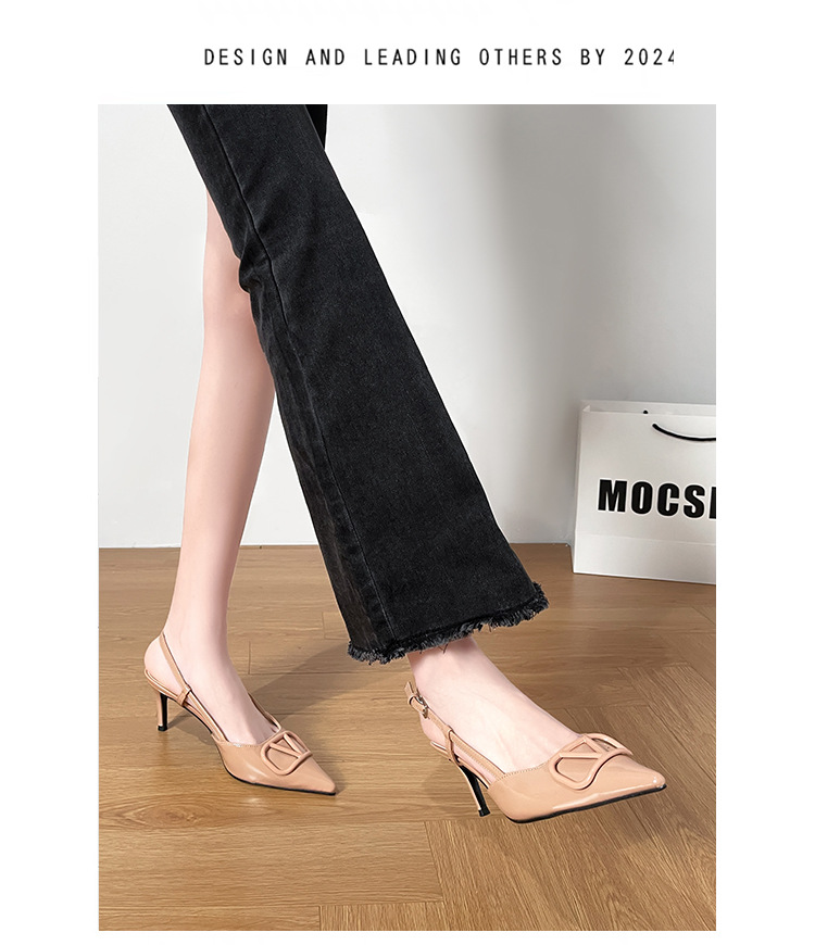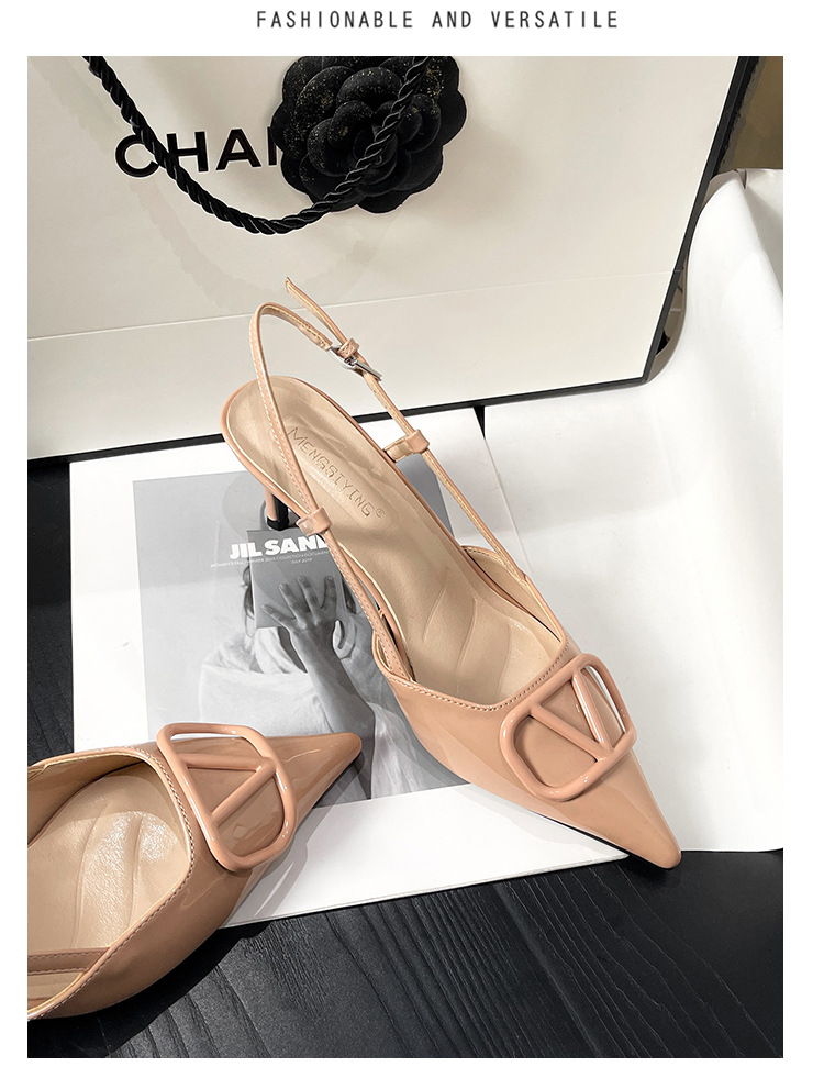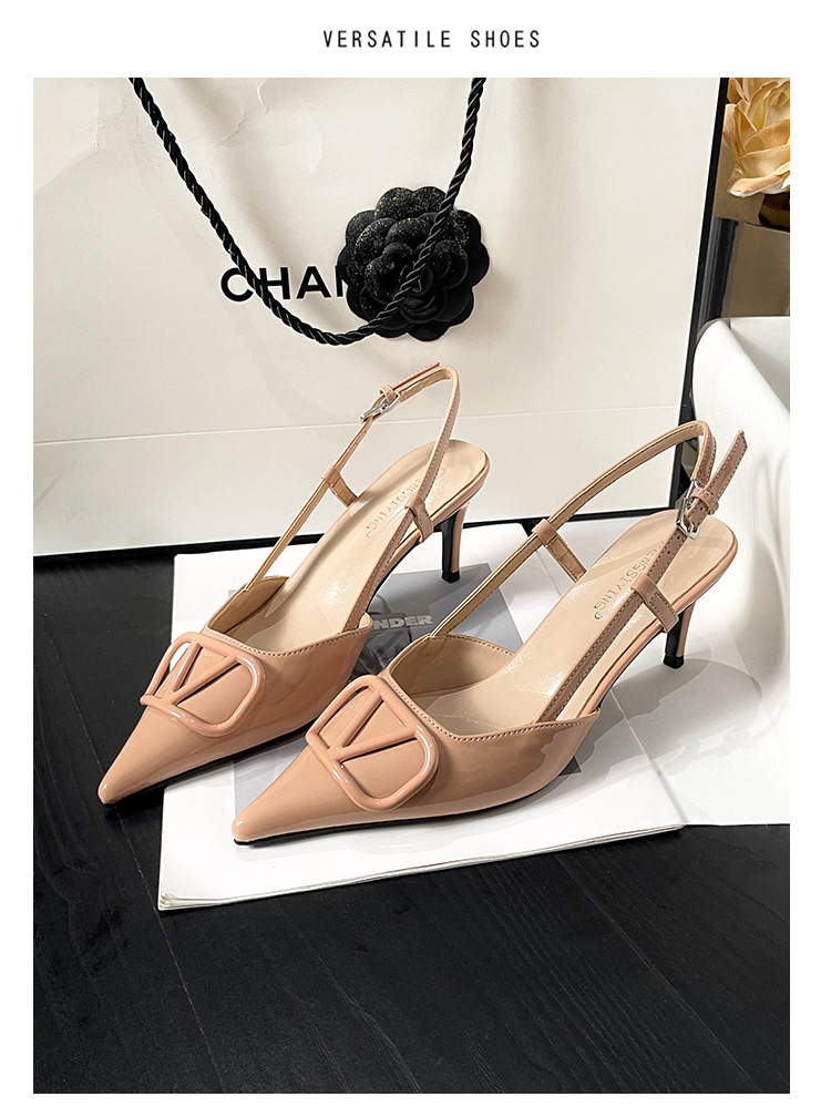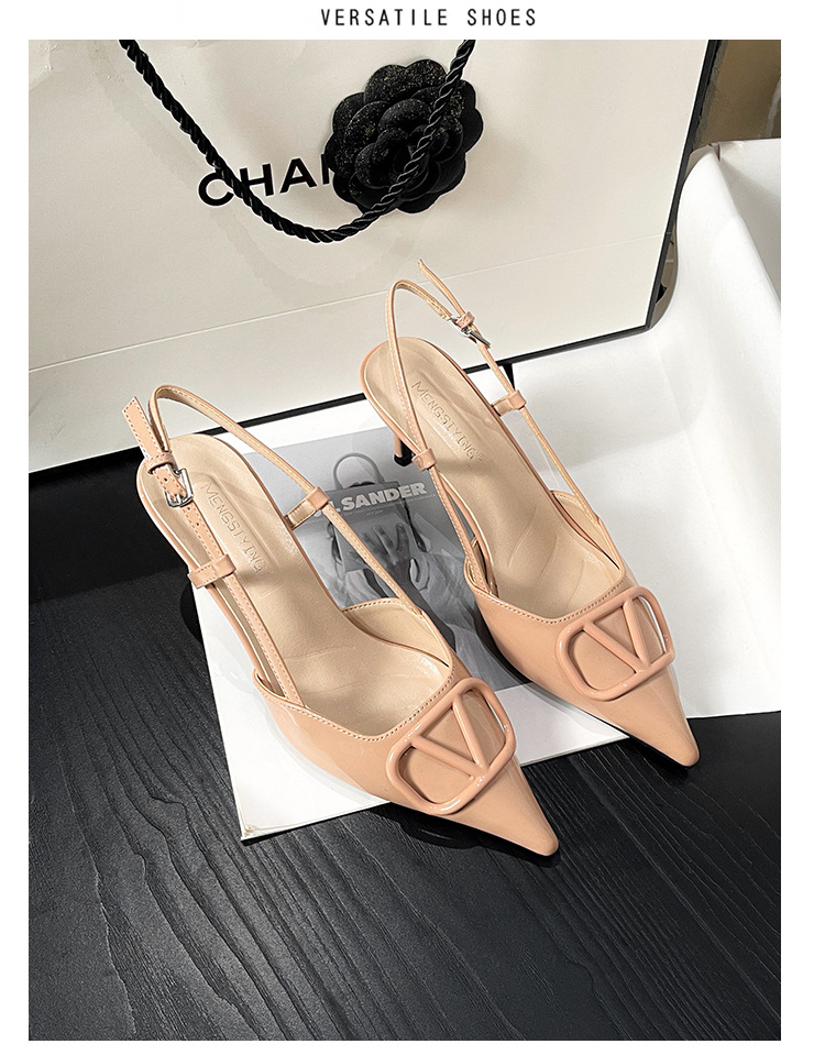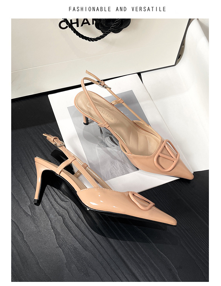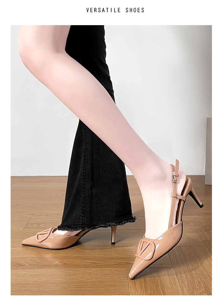 누드 하이힐 여성 2025 년 봄과 여름 새로운 프랑스 뾰족한 V-버클 하이힐 후면 빈 스틸레토 우아한 샌들
