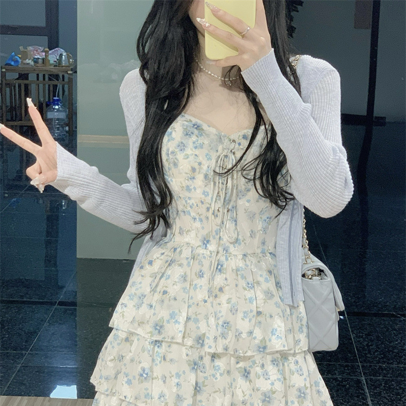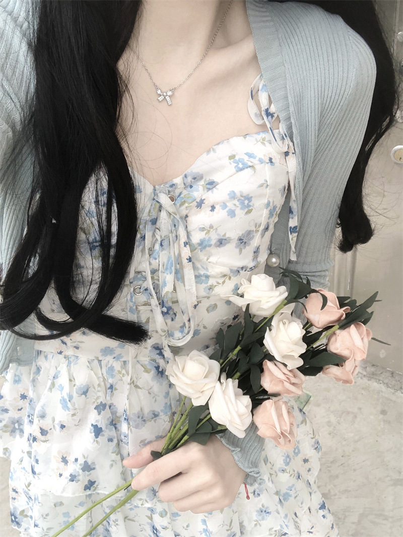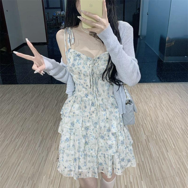 여름 새로운 프랑스 스타일 부드러운 케이크 꽃 슬링 원피스 여성의 우아한 올 매치 탑