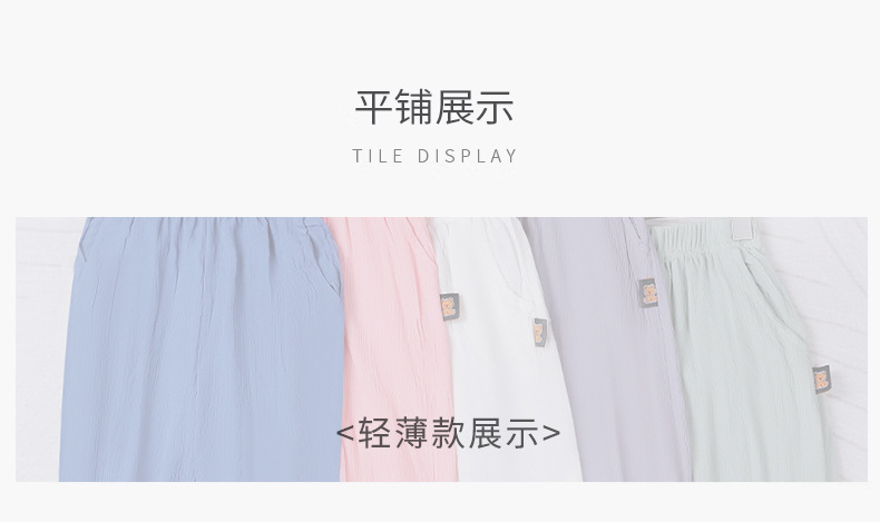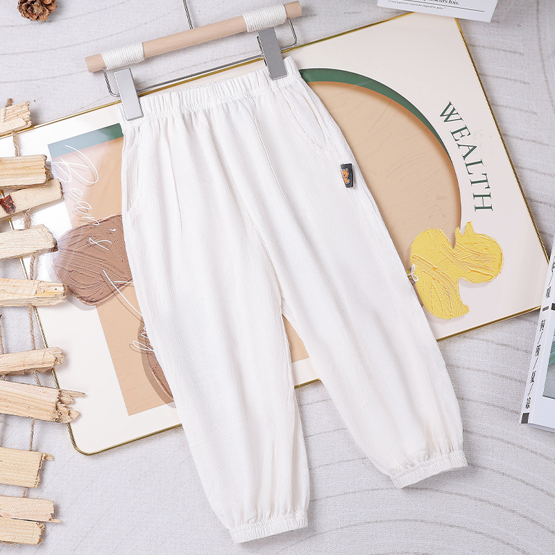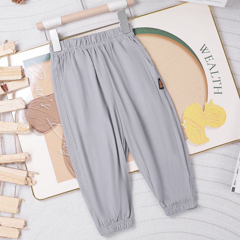 2025 어린이 통기성 단색 포켓 모기 방지 바지 중소 소년 소녀 캐주얼 바지 주름진 발 쿨 바지 배치