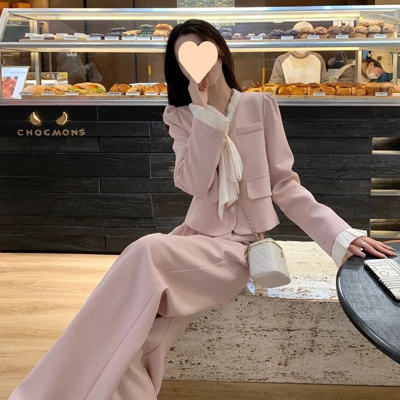 핑크 샤넬 스타일 세트 여성 화재 2025 새로운 슬리밍 에이지 감소 웨스턴 스타일 캐주얼 스포츠 와이드 레그 바지 투피스 세트스토어 가기