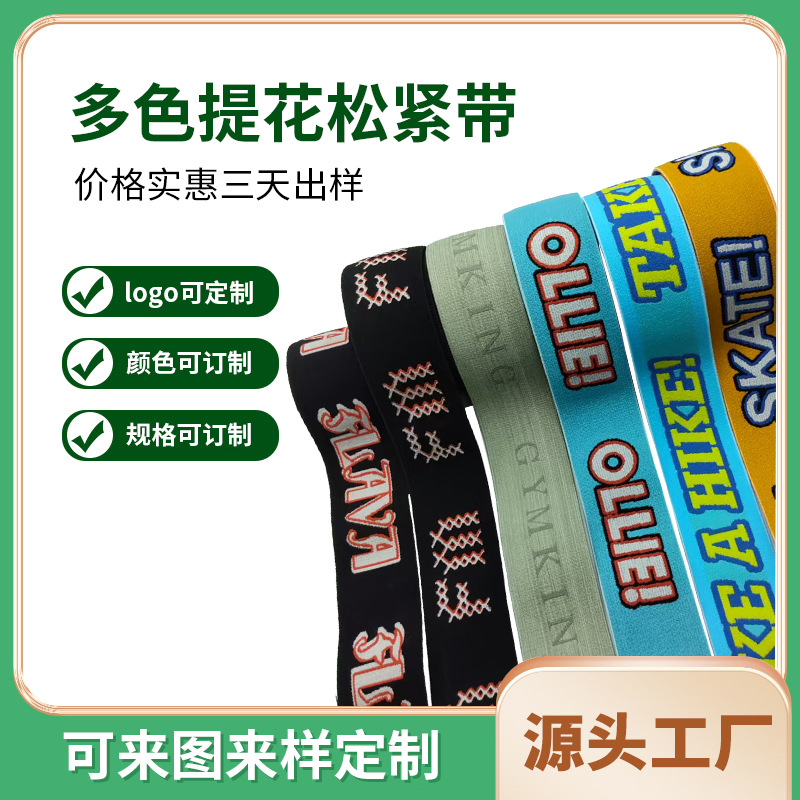 공장 맞춤형 멀티 컬러 자카드 탄성 밴드 고급 소재 멀티 컬러 높은 바늘 자카드 로고 문자 고무 밴드스토어 가기